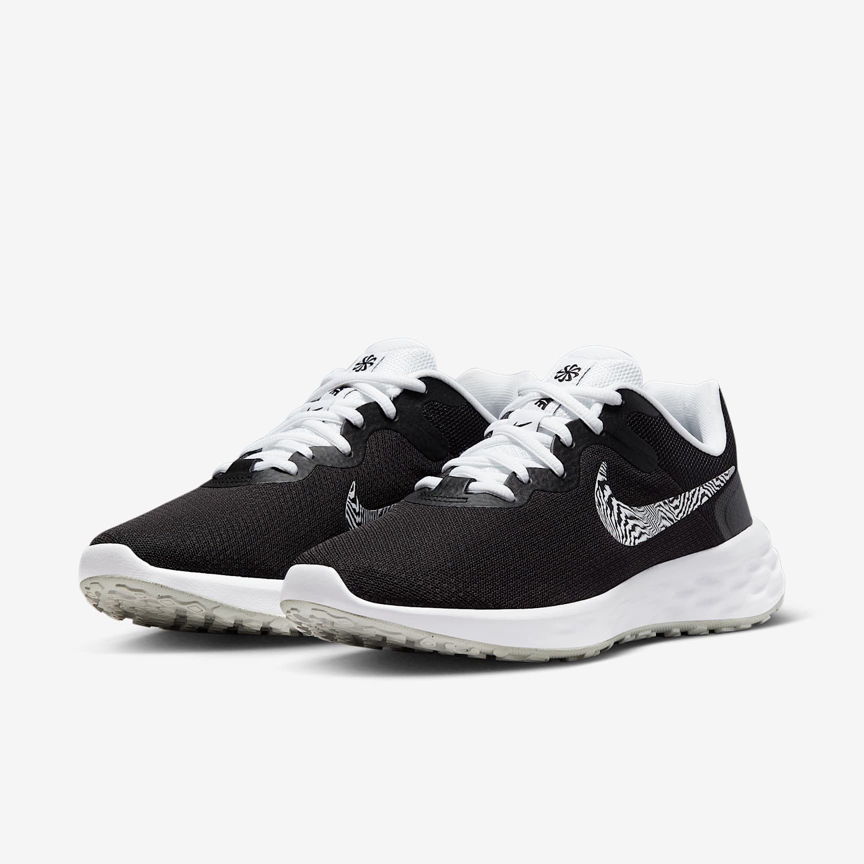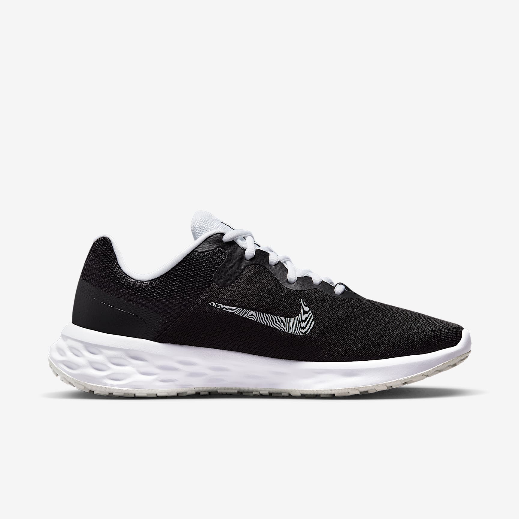 Set the pace at the start of your running journey with the plush feel of the Nike Revolution 6 Premium. We know comfort is key to a successful run, so we made sure your steps are cushioned and flexible for a soft ride. It's an evolution of a favourite, with a breathable design. Throwback Themed This flashy design, with its iridescent accents and a sound-wave-themed graphic on the Swoosh logo that nods to a nostalgic era in music, will help you reset and get in the zone as your favourite anthem powers you to new gains. Simple Design Plush mesh along the collar provides a comfortable feel. Touch points at the heel and tongue create a natural feel as you get the shoes on and off. More Flexibility A foam midsole delivers a softer ride than the Revolution 5. The outsole has a computer-generated design that creates a natural piston effect as you run, providing more cushioning and flexibility. They combine for durable traction.