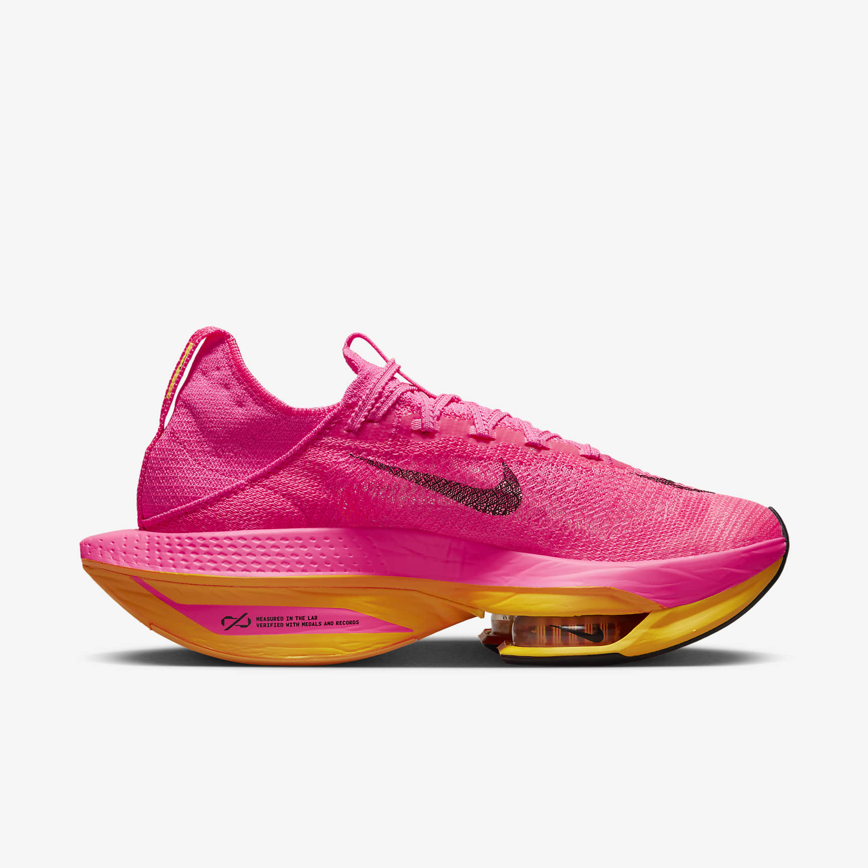 Once you take a few strides in the Nike Alphafly 2, you'll never look at your favourite pair of old racing shoes the same way again. These rocket ships are made to help shave precious time off your personal records without surrendering the foundation you need to go the full distance. A thick, lightweight support system marries the 2 worlds of comfort and speed in holy running matrimony. Enjoy the greatest energy return of all our racing shoes while you chase your personal bests and leave the competition in the dust. Bounce to the Beat Zoom Air units and full-length ZoomX foam deliver Nike's highest-energy-return cushioning system, adding more bounce into every step. A thin rubber outsole enhances traction and allows for more ZoomX under the Zoom Air cushioning. The additional foam not only adds more bounce, but also helps improve transition from heel to forefoot. Stay Fresher, Longer Full-length ZoomX foam offers an ultra-lightweight and responsive ride. It's built for speed but also provides cushioning to stay fresh even in the late miles of a marathon. It offers comfort where you need it. Keep Rolling Full-length carbon-fibre plate delivers a sort of roll-forwards feel that makes you want to take on the next step. It gives you a propulsive sensation and helps you smoothly transition through your stride. Both the forefoot and heel offer slightly wider bases for a stable platform, so you can tackle turns on the course with confidence. More Benefits * Part of the Flyknit family—AtomKnit material on the upper has a contoured fit while being lightweight and super breathable. * Specifically designed lofted heel pods use Flyknit yarns for secure, extended comfort and lightweight heel lockdown. * Notched laces offer a secure, but soft lace-up. An integrated knit tongue with lofted padding makes for a secure, repeatable fit that helps reduce lace pressure. * The sole was designed using data from hundreds of runners. It has different angles of traction placed where you need it, providing grip from foot-strike to toe-off. Product Details * Reflective design details * This product is not intended for use as Personal Protective Equipment (PPE)