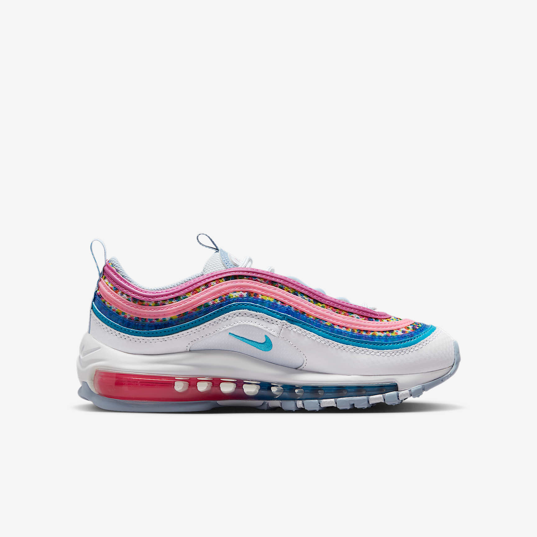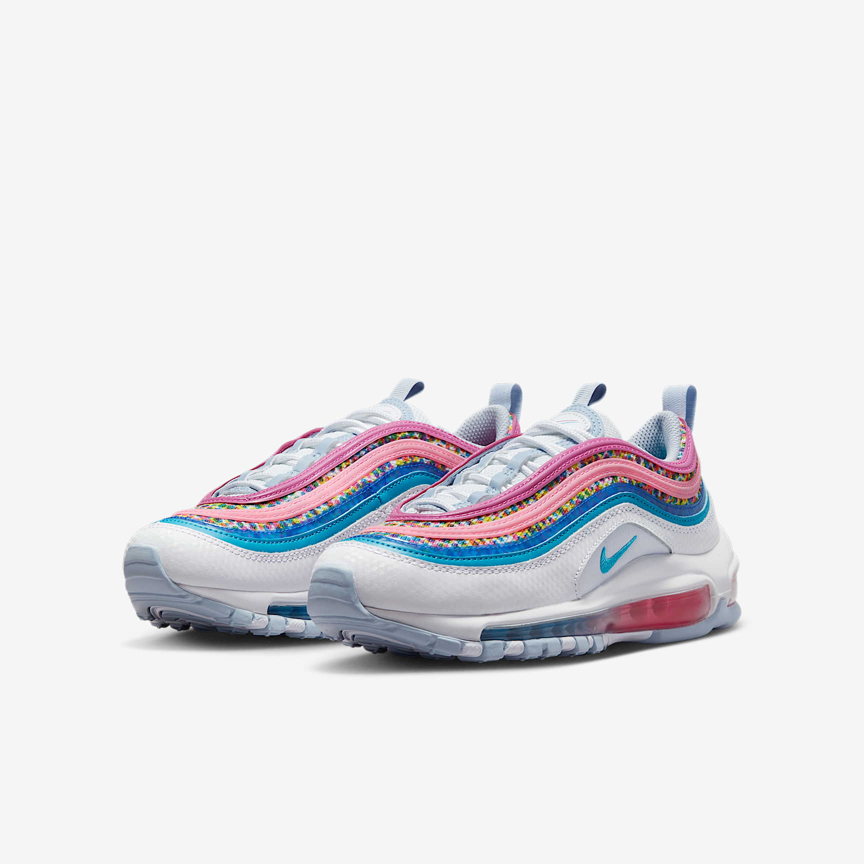 The easiest way for kids to express themselves? Bright colours! Bring that joy to your next pair of kicks with the Air Max 97. The design and feel are just like the original 97 with durable synthetic and real leather and a full-length Air unit. Happy Feels This special edition is inspired by kids' strong connection to super-bright and bold colours. Express yourself. Have fun. And most of all, love showing off your kicks! All About Air The classic Max Air unit provides lightweight cushioning. Fun fact: the 97 was the first Nike shoe to feature visible Air from heel to toe. Heritage Style Synthetic and real leather brings durability to your everyday shoe. Like the original 97, the design lines are inspired by water movement. Product Details * Classic laces * Rubber sole * Soft foam cushioning * Not intended for use as Personal Protective Equipment (PPE)