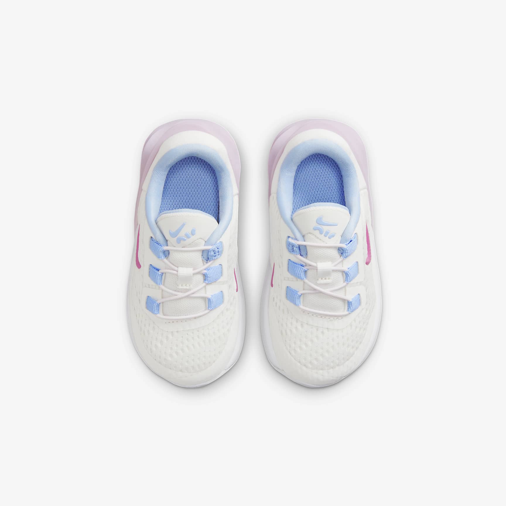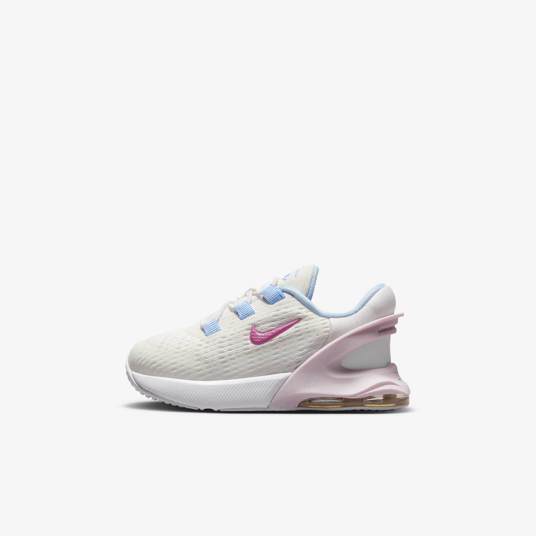The Nike Air Max 270 GO is ready for kids to do just that—"GO!" What's GO, you ask? It's our answer to making shoes super easy to get on and off—hands free! Help your little one press down on the collapsible heel. Slip their feet in and see the heel snap back into place. Done! Don't forget the 270 Air unit for a big bouncy feel while they play. GO, GO, GO! When you see "GO" in the name of our kids' shoes, it means little ones get a super-easy solution to get them on and off. This Air Max 270 uses a collapsible heel kids can use to get feet in quickly. Easy to Wear Elastic laces provide a snug fit without having to tie them up like classic laces. All About Air The 270 Air unit is big for bounce in every step. Why 270? Because you can see the Air 270 degrees around the heel. More Benefits * A little fresh air for your feet goes a long way—the lightweight, breathable mesh upper helps you stay cool while you run, jump and play. * Soft foam underfoot provides lightweight cushioning. * Rubber outsole provides durable traction. Product Details * Elastic laces