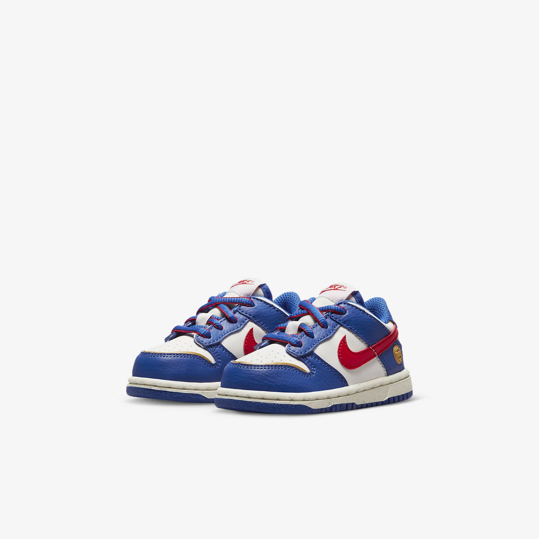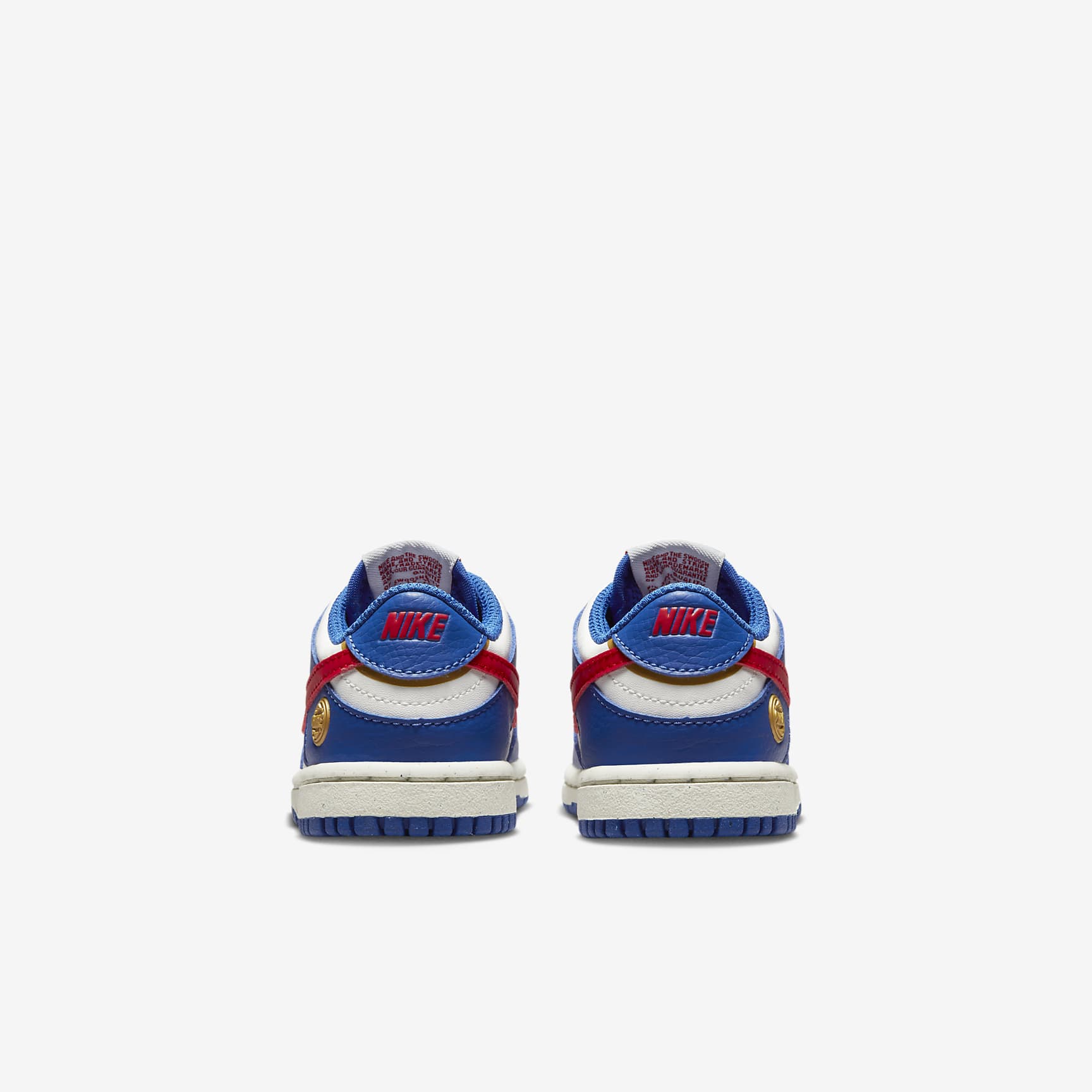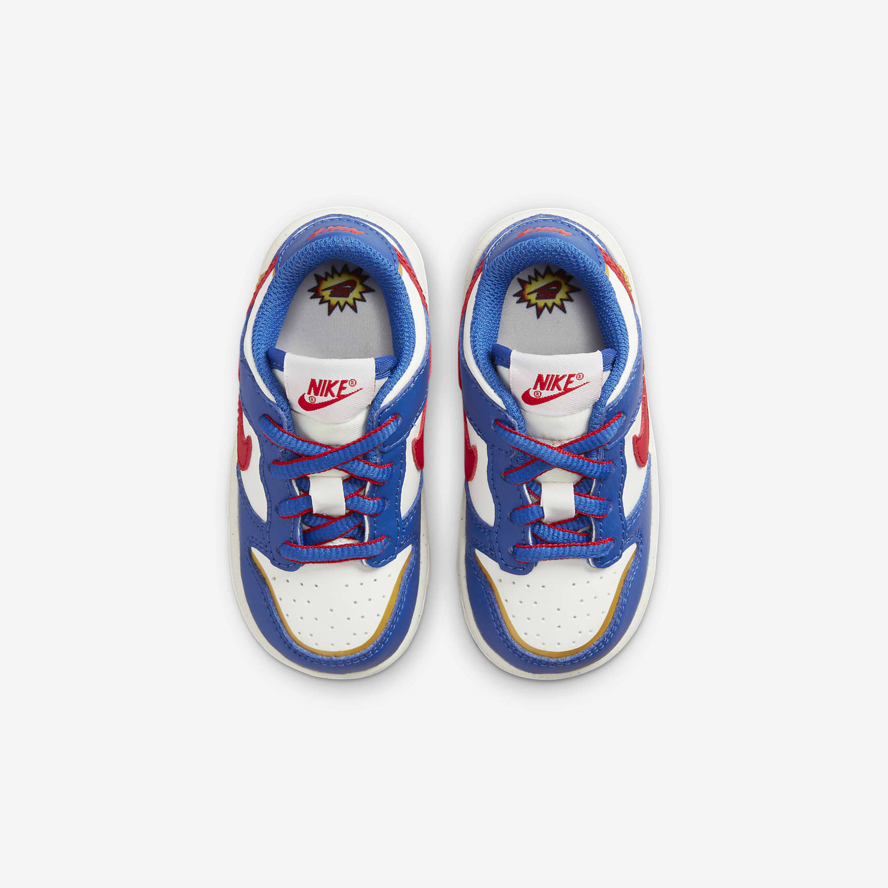 There's only 1 word to describe these kicks: fantastic! The Dunk Low is the perfect footwear for little superheroes ready for adventure. Synthetic leather pairs with energetic colours and gilded detailing, while the outsole adds lasting comfort and traction. 2-toned laces and comic book-inspired accents let kids suit up and join in with Mission: Playtime! Benefits * Synthetic leather upper with fabric accents is durable and comfortable. * Low-cut, padded collar looks sleek and feels great. * Rubber outsole with classic hoops pivot circle adds durable traction and heritage style. Product Details * Classic laces * Woven tongue label Nike Dunk From backboards to skateboards, the influence of the Nike Dunk is undeniable. Although introduced as a basketball shoe in 1985, its flat and grippy soles were perfect for a neglected sport community—skaters. Uncovering a subculture craving creativity as much as function, the Dunk released decades of countless colourways that continue to capture the soul of skaters from coast to coast.
