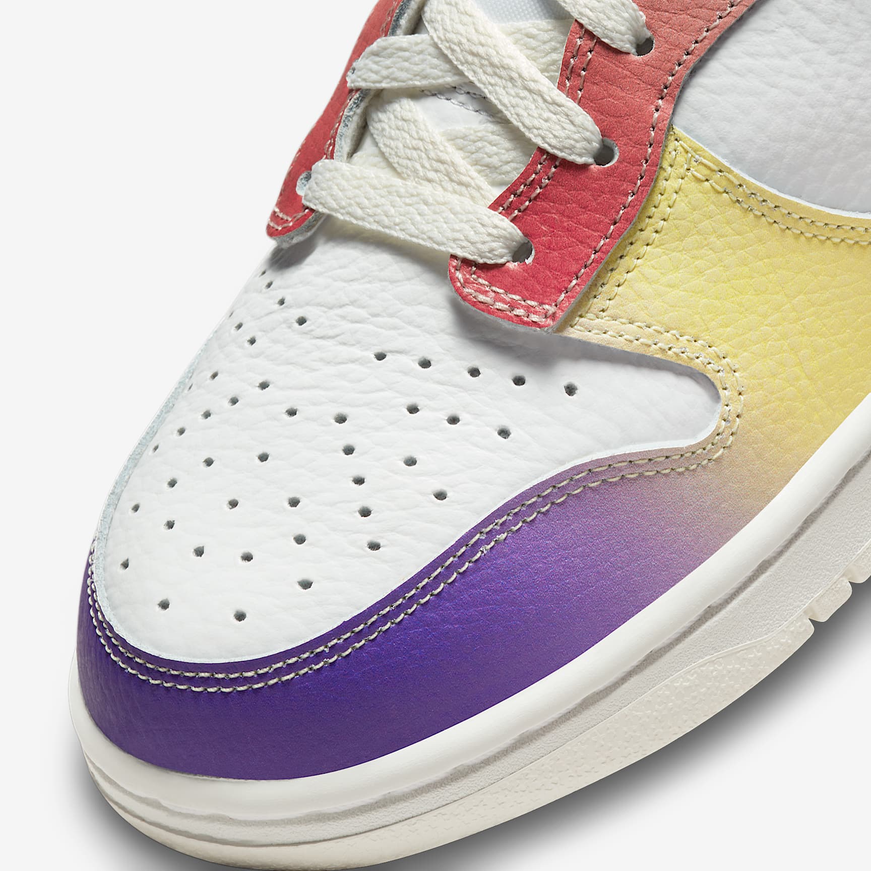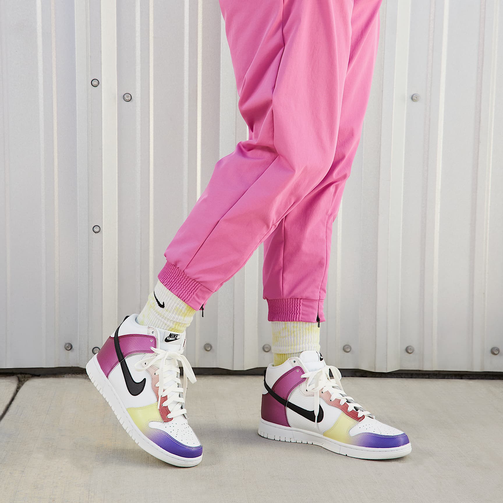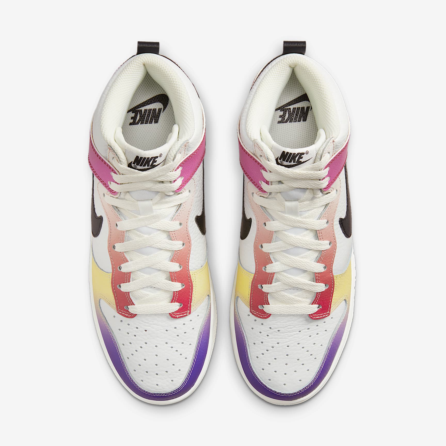 Designed for those who aren't afraid to express themselves, the Nike Dunk High returns with vibrant gradient colours to take your style sky high. Premium leather, plush ankle padding and an unmistakable silhouette help you bring a hoops-inspired design to the street. Are you ready to get creative with your look? Benefits * Leather upper is durable and adds a classic Dunk feel. * Padded, high-top collar adds an old-school look that feels comfortable. * Foam midsole offers lightweight, responsive cushioning. * Rubber outsole with classic hoops pivot circle adds durability, traction and heritage style. Product Details * Perforations on the toe * Pull tab on heel Nike Dunk From backboards to skateboards, the influence of the Nike Dunk is undeniable. Although introduced as a basketball shoe in 1985, its flat and grippy soles were perfect for a neglected sports community—skaters. Uncovering a subculture craving creativity as much as function, the Dunk released decades of countless colourways that continue to capture the soul of skaters from coast to coast.