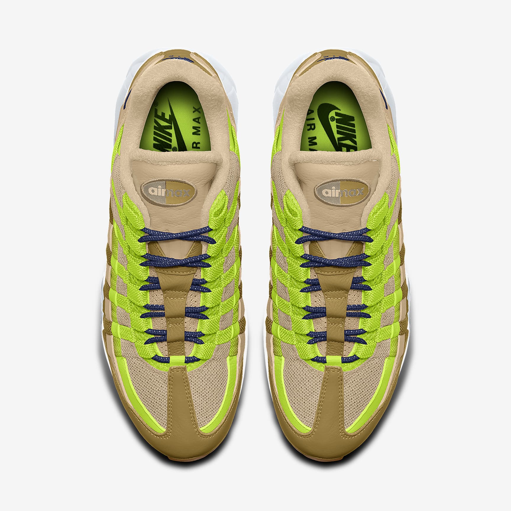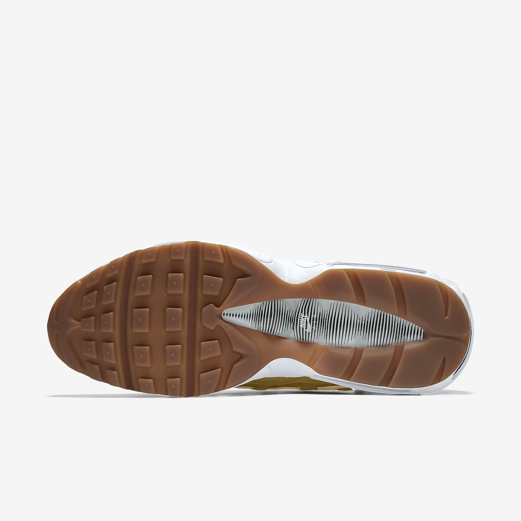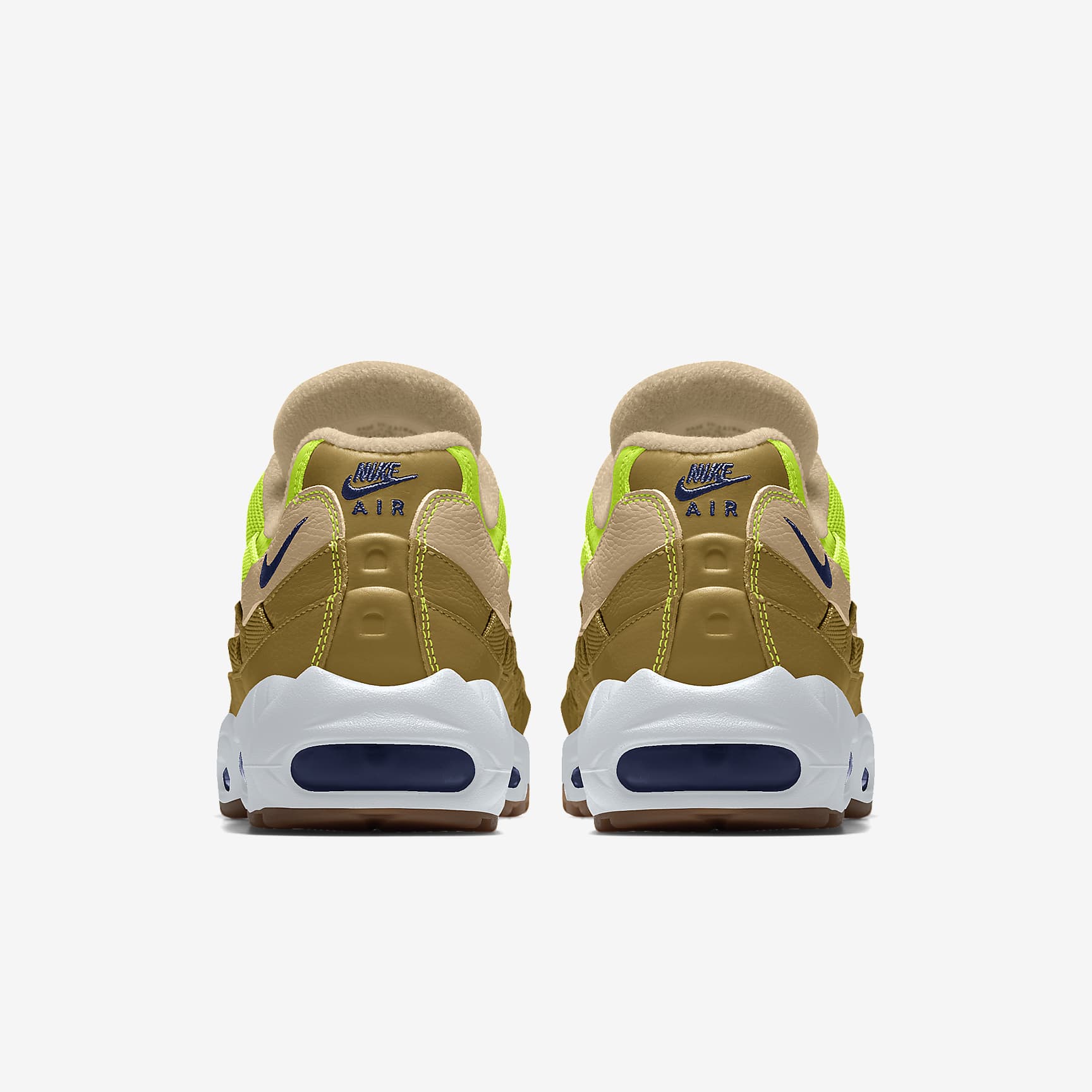 Inspire the streets with your Air Max 95. The customisable design (with a coveted woven upper) lets you bring your own aesthetic to the legendary look by selecting your fave colours and choice materials. Add a personalised message that lets you tell a piece of your story. Boost the energy with coloured Air units or by making your design monochromatic. Then add the cherry to the bottom and ramp up the comfort by selecting an ultra-soft sockliner. What's Your Base? You've got options: keep it classic with an all-leather upper or go with recycled canvas for a timeless spin. Own Your Narrative Add a personalised message on the tongue and tell a piece of your story. Hook-and-loop patches let you mix up your style: 1 with your message (you get up to 3 characters: numbers 0–9 and letters A–Z), 1 with the original Air Max logo patch and 1 that lets you pick between 3 emoji graphics. Colour or Colours? Go monochromatic with select colours and match the midsole, outsole and upper. Or let the colours fly and add bursts of energy where you want them—from the iconic side panels to the Air units (the forefoot and heel can be different), the midsole or the outsole, it's up to you. More Benefits * Upper draws inspiration from the human body—the midsole represents the spine, graduated panels are the muscles and the laces are the shoe's ribs. * Originally designed for performance running, visible Air cushioning in the heel and forefoot puts the history of comfort beneath your feet. * Flex grooves in the midsole/outsole let you move freely. Nike By You Details * Our Members are one of a kind, and your shoes are, too. Each pair is proudly made one at a time, by hand. Good things are worth the wait. * Your initials? A nickname? Or something else that's so you. Get personal with a customisable inscription on your shoes. Plus, your name is on the box. * With our 3D builder, watch your creation come alive as you experiment with all kinds of design choices. Air Max 95 There are layers to the Air Max 95. Sporting a grooved design, these were the first Nike shoes to don a forefoot Air unit. And debuting with a black sole, unheard of at the time, these kicks looked fresh no matter where you stepped.