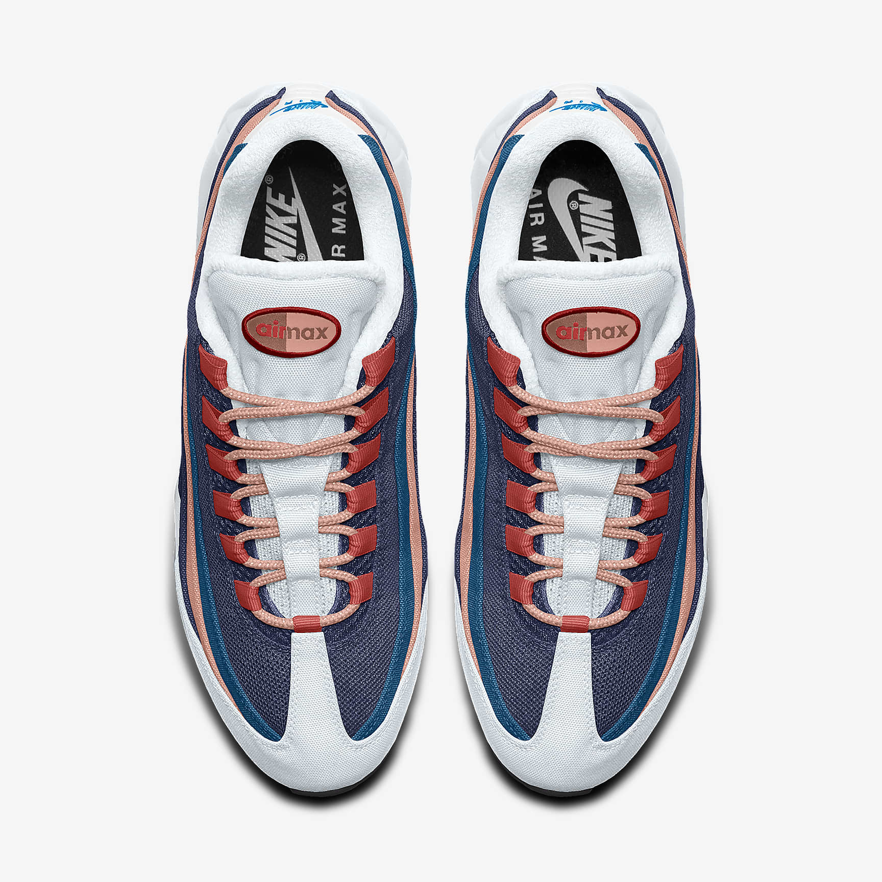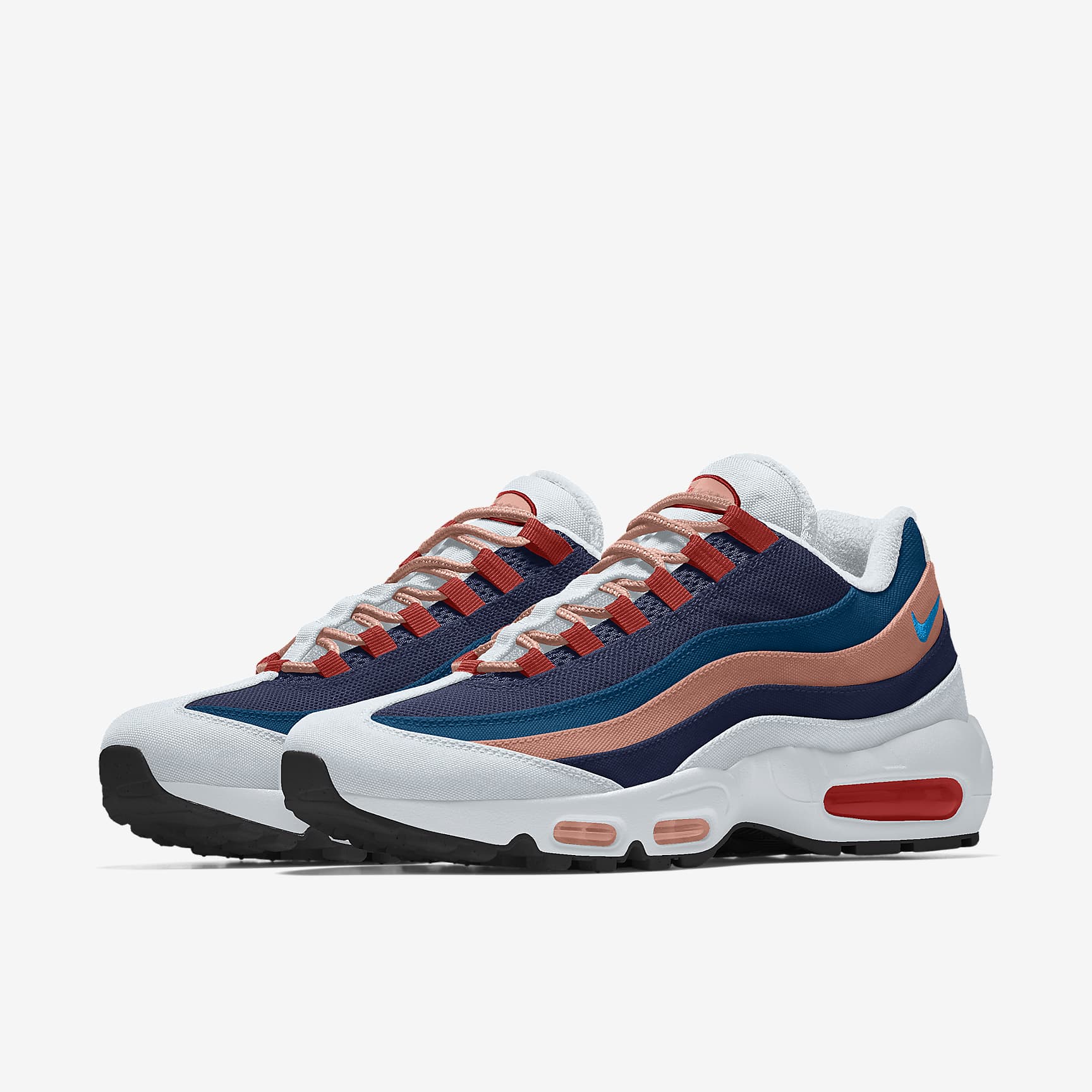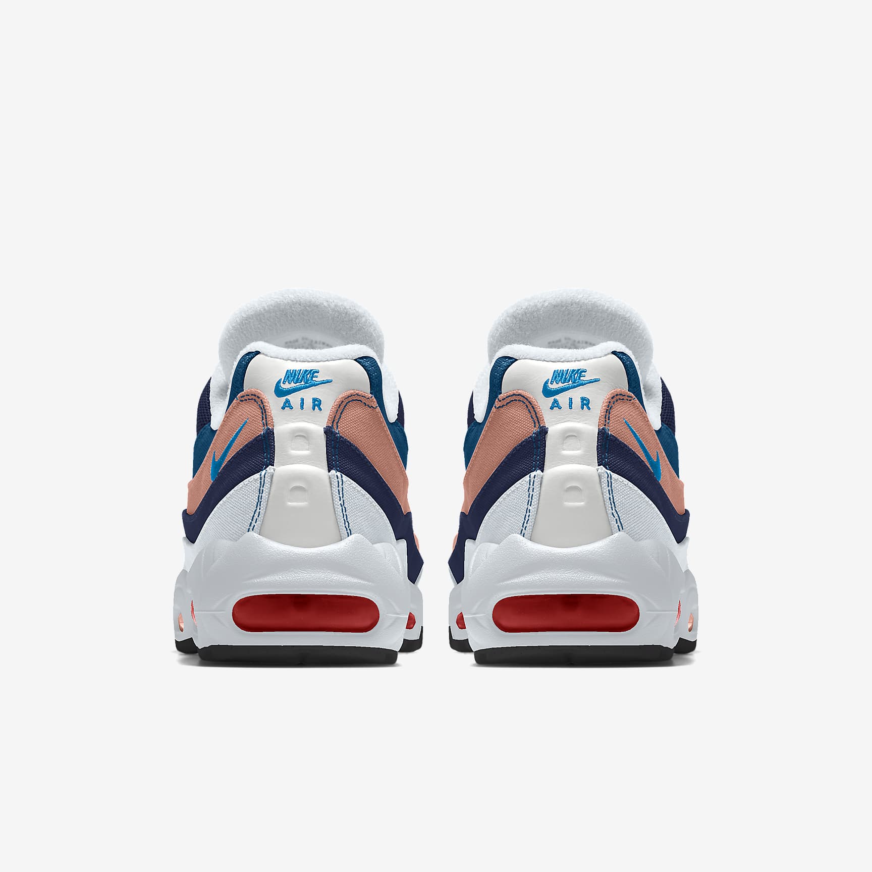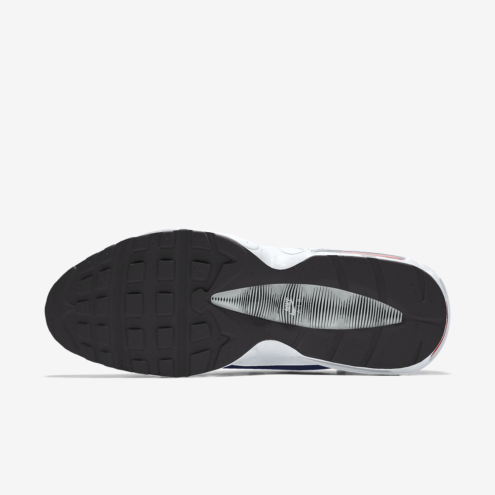 Inspire the streets with your Air Max 95. The customisable design lets you bring your own aesthetic to the legendary look by selecting your fave colours and choice materials. Add a personalised message that lets you tell a piece of your story. Boost the energy with coloured Air units or by making your design monochromatic. Then add the cherry to the bottom and ramp up the comfort by selecting an ultra-soft sockliner. What's Your Base? You've got options: keep it classic with an all-leather upper or go with recycled canvas for a timeless spin. Own Your Narrative Add a personalised message on the tongue and tell a piece of your story. Hook-and-loop patches let you mix up your style: 1 with your message (you get up to 3 characters: numbers 0–9 and letters A–Z), 1 with the original Air Max logo patch and 1 that lets you pick between 3 emoji graphics. Colour or Colours? Go monochromatic with select colours and match the midsole, outsole and upper. Or let the colours fly and add bursts of energy where you want them—from the iconic side panels to the Air units (the forefoot and heel can be different), the midsole or the outsole, it's up to you. More Benefits * Upper draws inspiration from the human body—the midsole represents the spine, graduated panels are the muscles and the laces are the shoe's ribs. * Originally designed for performance running, visible Air cushioning in the heel and forefoot puts the history of comfort beneath your feet. * Flex grooves in the midsole/outsole let you move freely. Nike By You Details * Our Members are one of a kind, and your shoes are, too. Each pair is proudly made one at a time, by hand. Good things are worth the wait. * Your initials? A nickname? Or something else that's so you. Get personal with a customisable inscription on your shoes. Plus, your name is on the box. * With our 3D builder, watch your creation come alive as you experiment with all kinds of design choices. Air Max 95 There are layers to the Air Max 95. Sporting a grooved design, these were the first Nike shoes to don a forefoot Air unit. And debuting with a black sole, unheard of at the time, these kicks looked fresh no matter where you stepped.