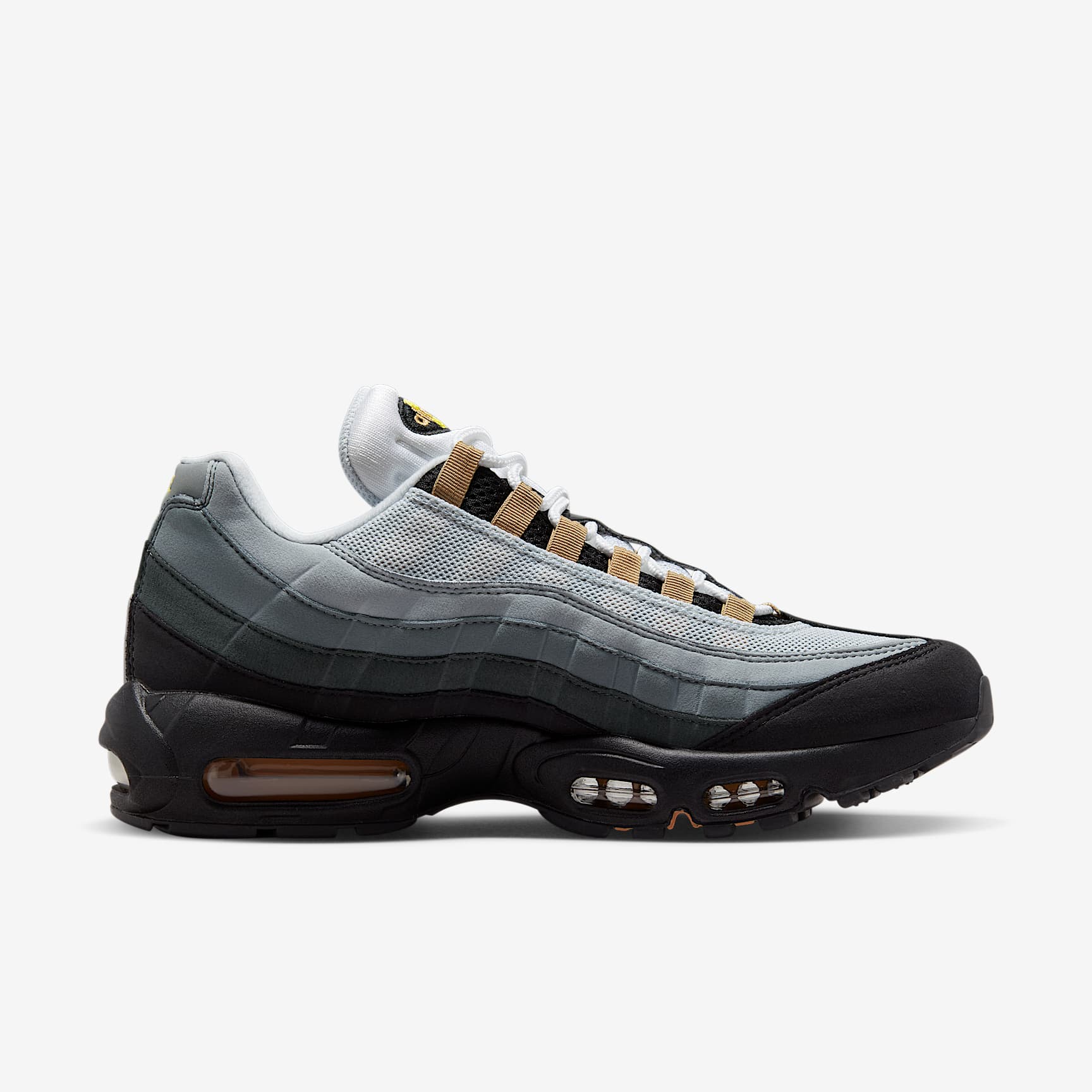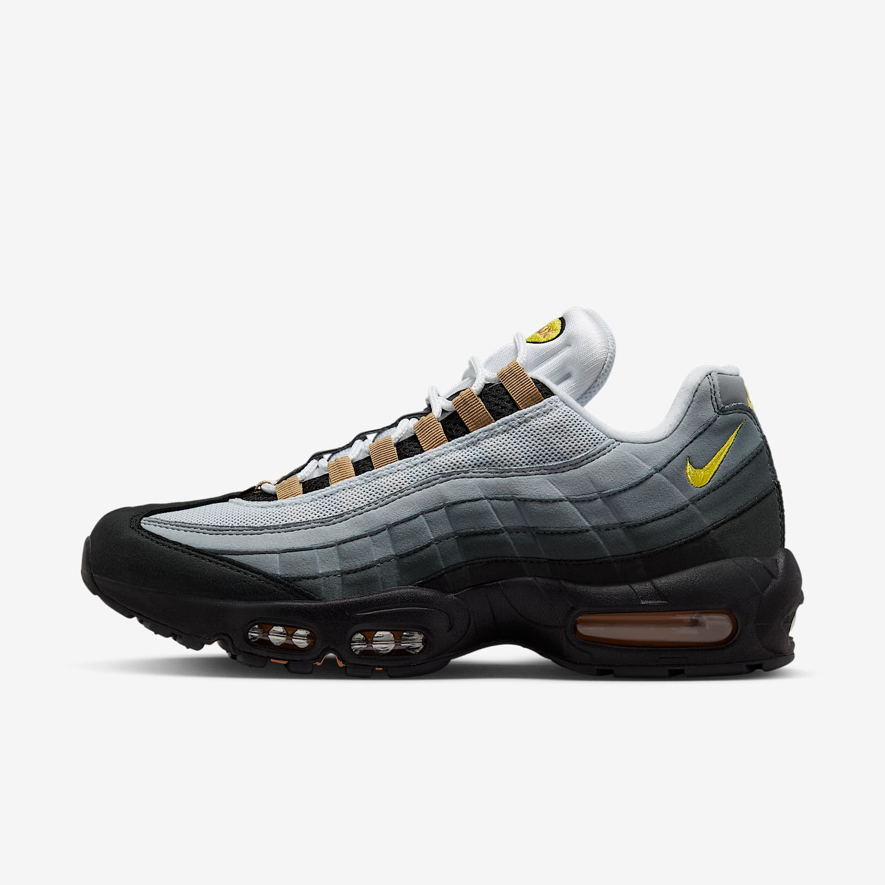 Step out in style and tried-and-tested comfort with the Air Max 95. The wavy side panels feature a rich mixture of materials, adding a natural flow to any outfit, while visible Nike Air cushions every step. Benefits * The upper draws inspiration from the human body—the midsole represents the spine, graduated panels are the muscles and the laces are the shoe's ribs. * Originally developed for performance running, the visible Nike Air cushioning in the heel and forefoot delivers lasting comfort. * The mesh on the upper is reinforced with leather and synthetic overlays, making them durable and breathable. * An innovative lacing system adds easy on and off while letting you quickly personalise your fit. Product Details * Not intended for use as Personal Protective Equipment (PPE) Air Max 95 There are layers to the Air Max 95. Sporting a grooved design, these were the first Nike shoes to don a forefoot Air unit. And debuting with a black sole, unheard of at the time, these kicks looked fresh no matter where you stepped.