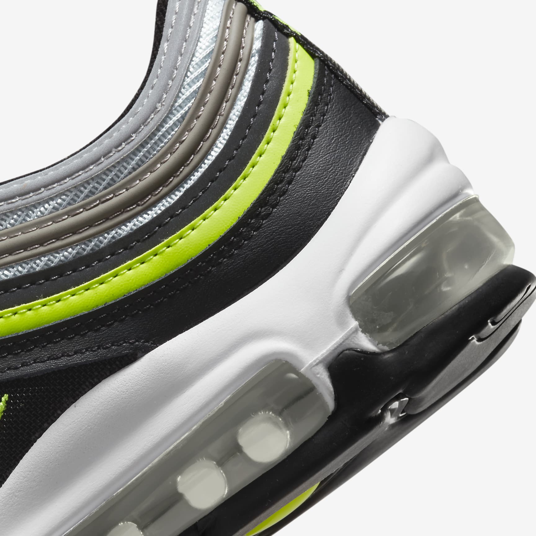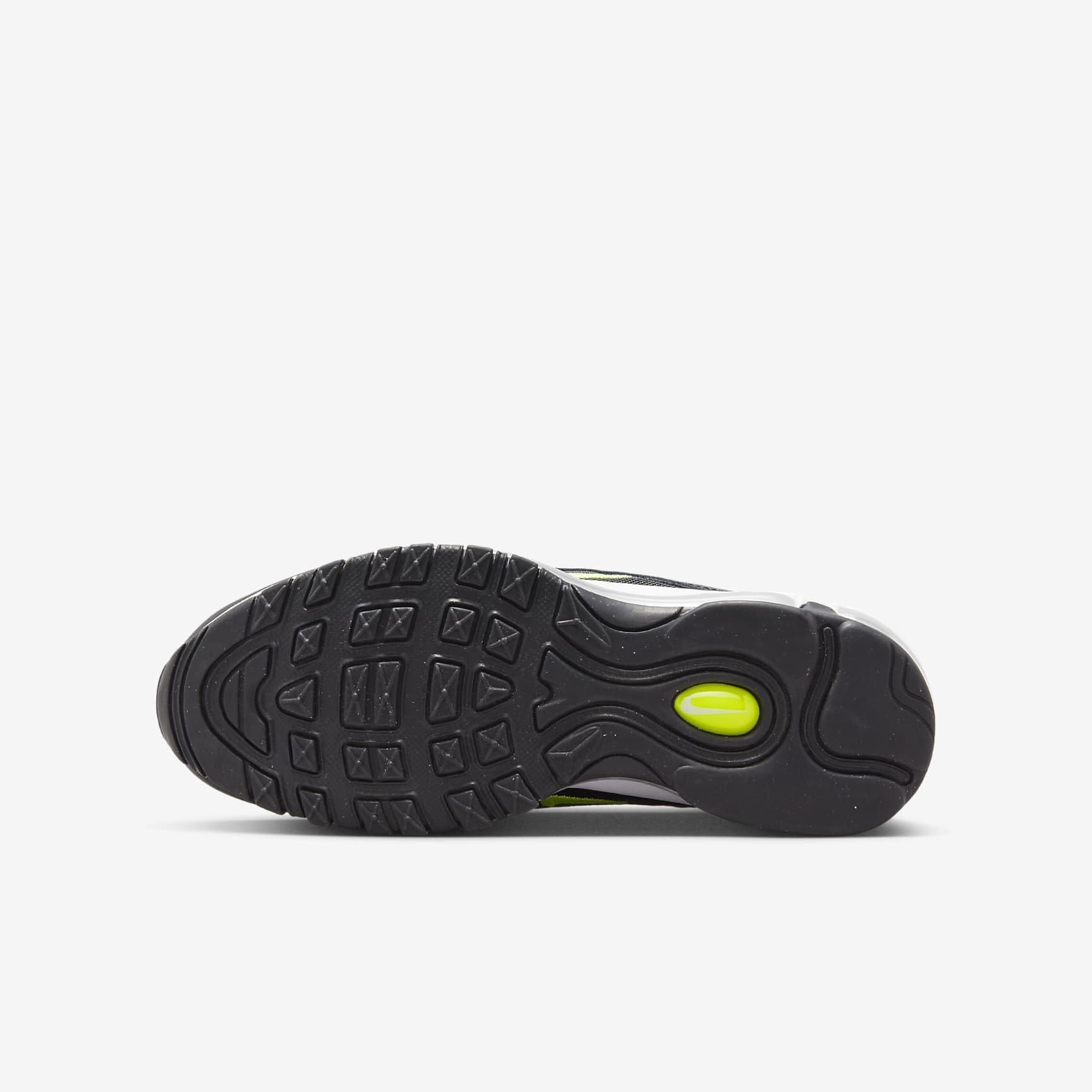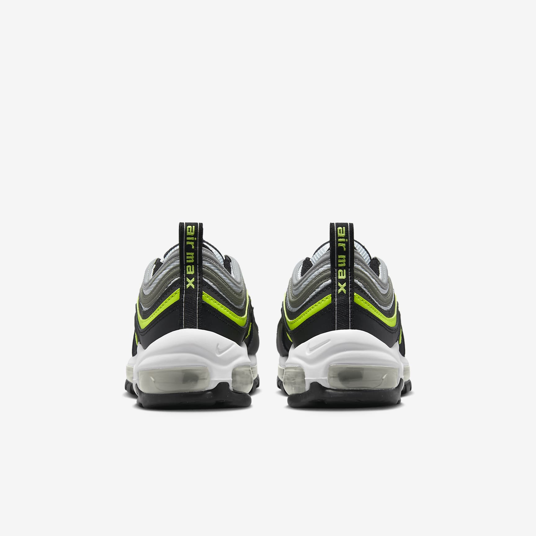 A '90S FAVE RETURNS FOR KIDS. The Nike Air Max 97 is the shoe that will have you walking on Air—literally! This icon was the first to showcase Max Air underfoot from heel to toe. Plus, it rocks the wavy, water ripple-inspired lines that make the 97 a classic forever. Benefits * Synthetic leather provides durability and a classic feel like the original. * As the first Nike shoe with visible heel-to-toe Air, the Max Air unit brings lightweight cushioning. * Rubber sole provides durable traction. Product Details * Classic laces * Pull tabs on heel and tongue * Not intended for use as Personal Protective Equipment (PPE) Product Details * Pull tabs on heel and tongue * Not intended for use as Personal Protective Equipment (PPE)