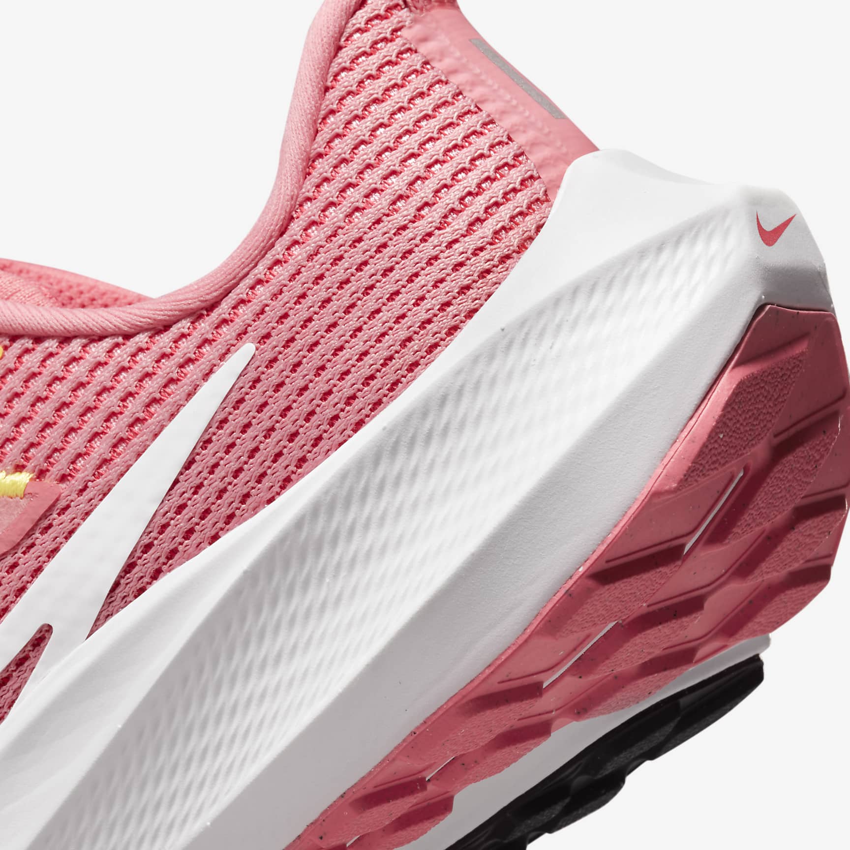 40 years. Generations of running. The Pegasus 40 reps the past and future of Nike Running. Whether you're gearing up for a school athletics competition, athletics training or fun runs (like your gym class mile), this shoe is for runners of all levels. They're breathable so your feet stay cool with every lap. Zoom Air and bouncy foam team up for the cushioning you need to feel comfortable with every stride. It's time to fly! Breathable Comfort The soft engineered mesh has 3 advantages to help your next run: Lightweight so you can feel fast. Structured fit for stability. And breathability for airflow so your feet stay cool. Kid-Right Cushioning Made especially for kids' feet and for running, our Cushlon foam gives a responsive and bouncy feel with every stride. A Zoom Air unit in the forefoot brings a quick off-the-ground sensation. Ground Control The rubber sole has a waffle-inspired traction pattern to help grip surfaces and provide durability. The cut-out grooves increase flexibility for a better transition from heel to toe. Move with Stability A synthetic leather midfoot band stretches across the top to give you a secure and stable feel while running and moving in different directions. More Benefits * An extra skin layer across the toe tip provides added durability for those who drag their toes. * The padded foam collar gives extra comfort and support around the ankle. Product Details * Classic laces
