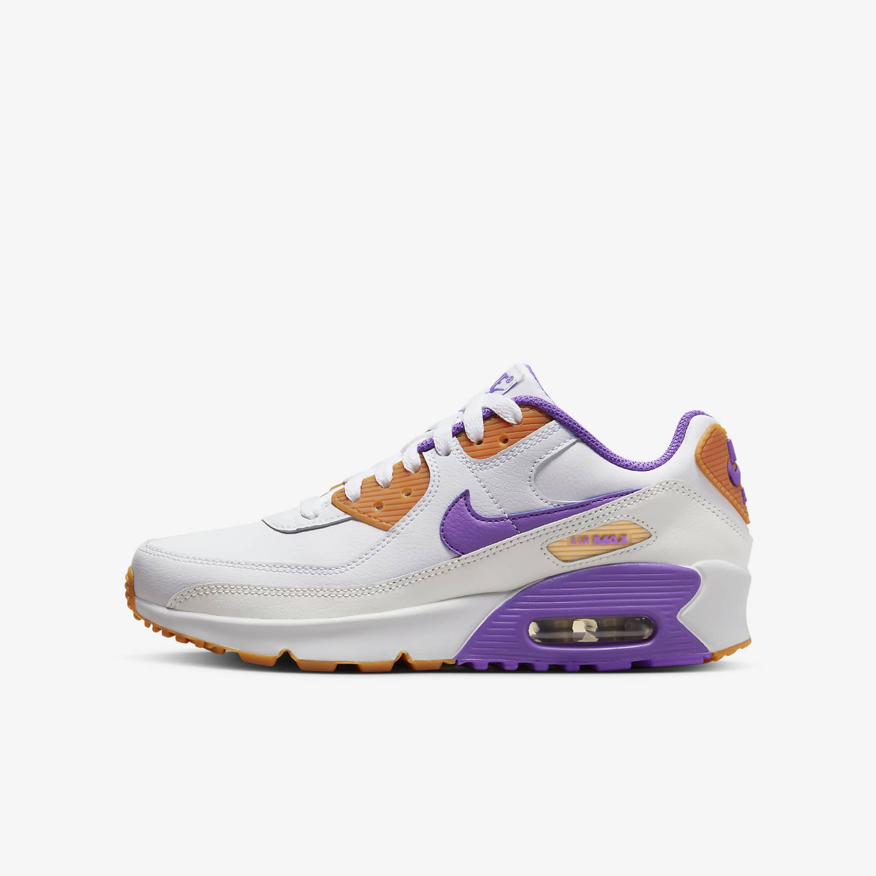 The Air Max 90 returns with an even better feel for you. Cushioning is softer and more flexible than previous versions, the Max Air unit is tuned for growing feet and the shape gives your toes more wiggle room. With a design and look that are still the same, it brings a '90s fave to a new generation. Updated Classic Real and synthetic leather is durable and brings a classic feel. The shape gives toes more wiggle room, and the fit helps keep your feet comfortable. Cushioned Comfort The Max Air unit is soft and tuned especially for kids. Plus, comfy and flexible foam makes for easy steps. Padded Design Extra padding around the ankle is plush so you can slip right into comfort. Natural Moves The full-length rubber sole features grooves for flexibility so every step feels natural. Product Details * Classic laces