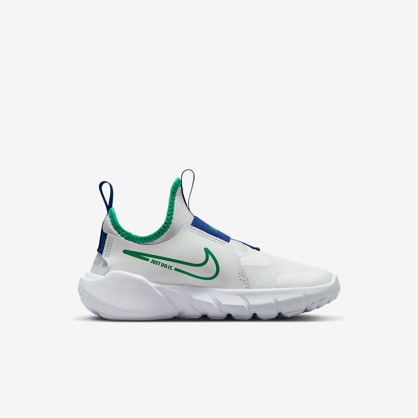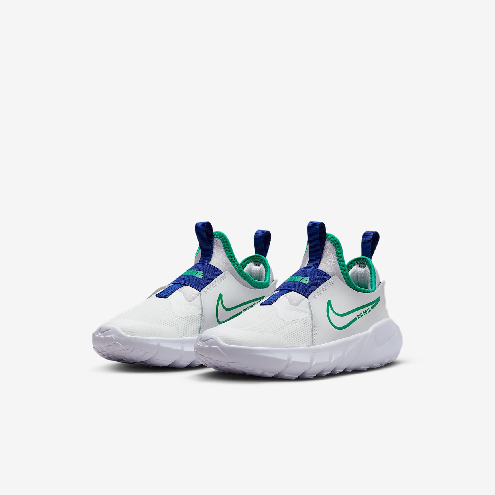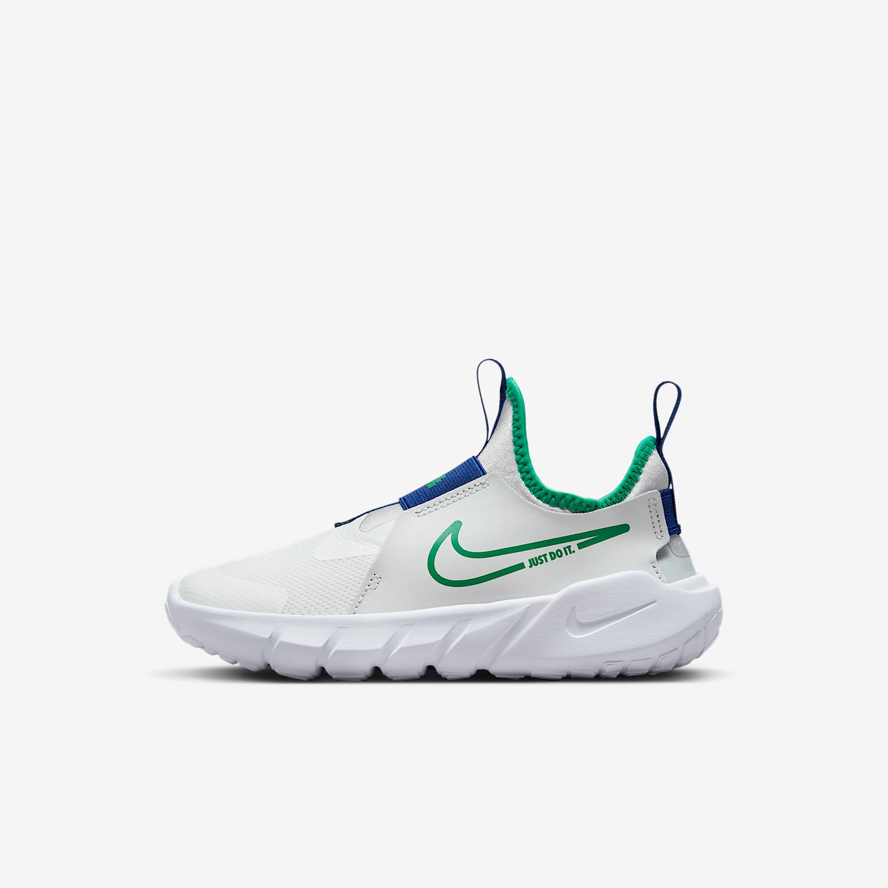 A SLIP-ON FOR LITTLE SPEEDSTERS. Who's ready to play? The Nike Flex Runner 2 is built for the kid on the go who loves to play—from the playground to wherever their day takes them. It's laces-free! Meaning it's super quick to slip on and off. The straps and bootie-like design make sure your little one's fit stays snug while they run and jump. Easy On, Easy Fit A stretchy bootie design makes it easy to slip little feet in with a snug and secure feel. A midfoot strap, a heel strap and leather on the sides stabilise the fit. Comfy Steps The flexible foam sole is designed with grooves so every step feels natural. The sole's pattern also helps with multi-surface traction. Steady Feel The back of the shoe features foam that creates a wing-like shape around the heel for extra stability when moving in different directions. More Benefits * Breathable fabric on the front of the shoe is lightweight and helps keep feet cool. * The toe tip is reinforced for extra durability for toe-draggers. * Pull tabs on the heel and tongue help make the shoe easy to get on and off.