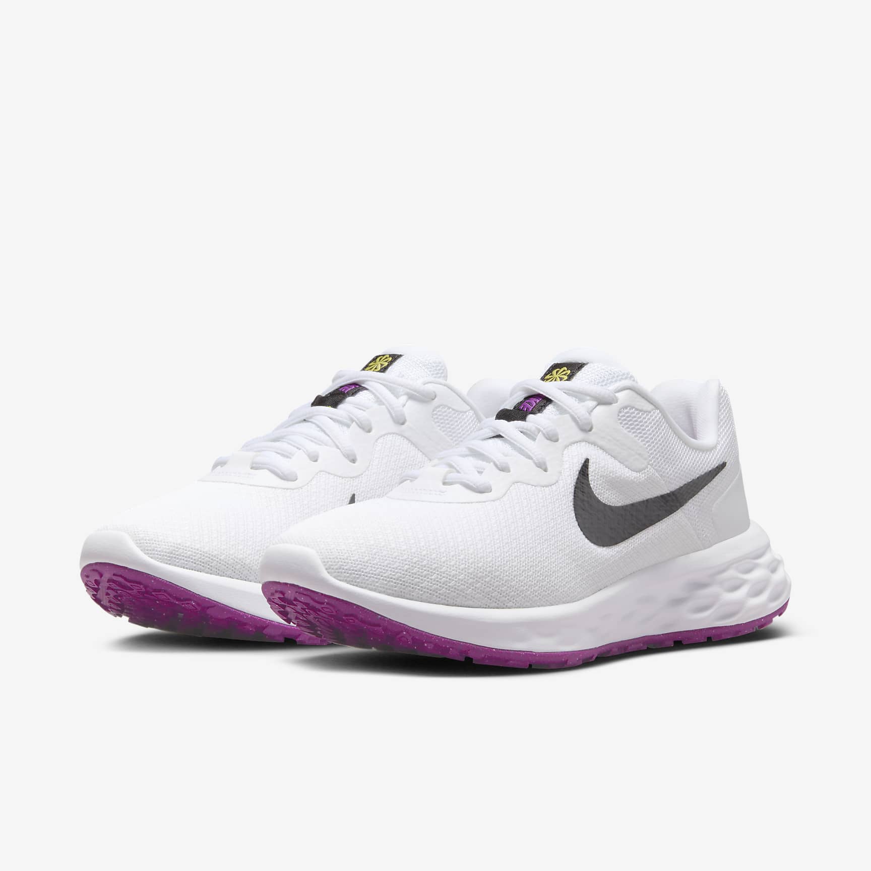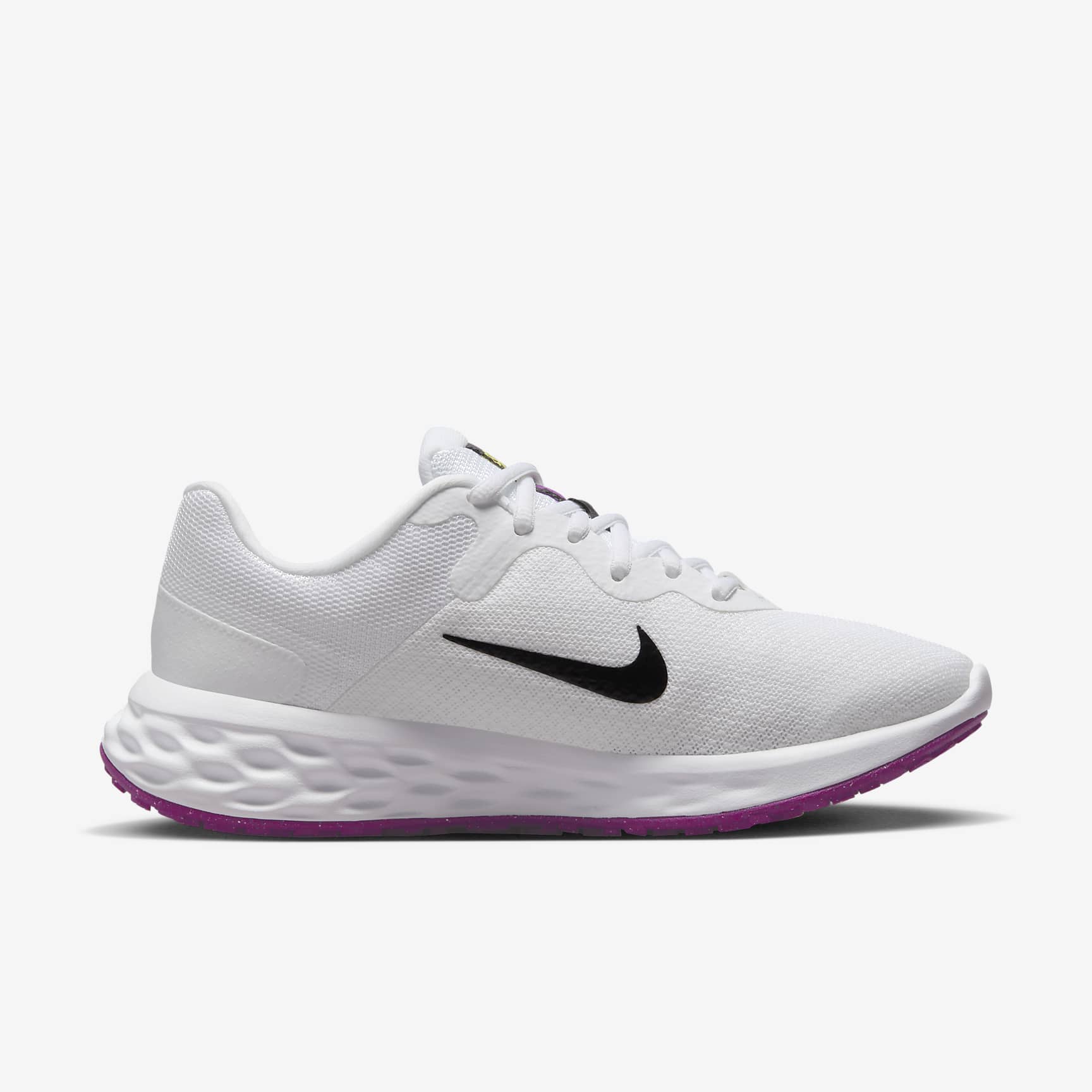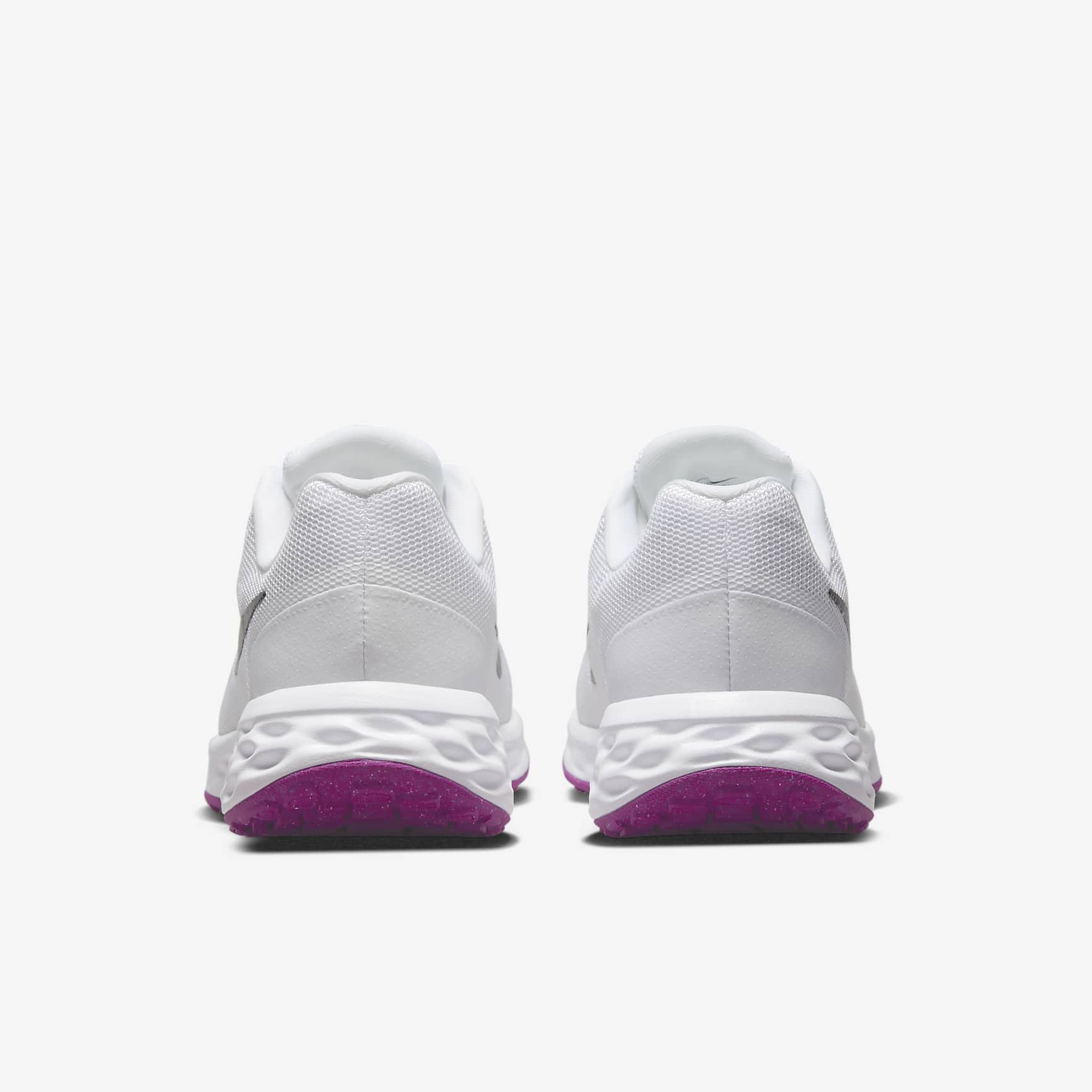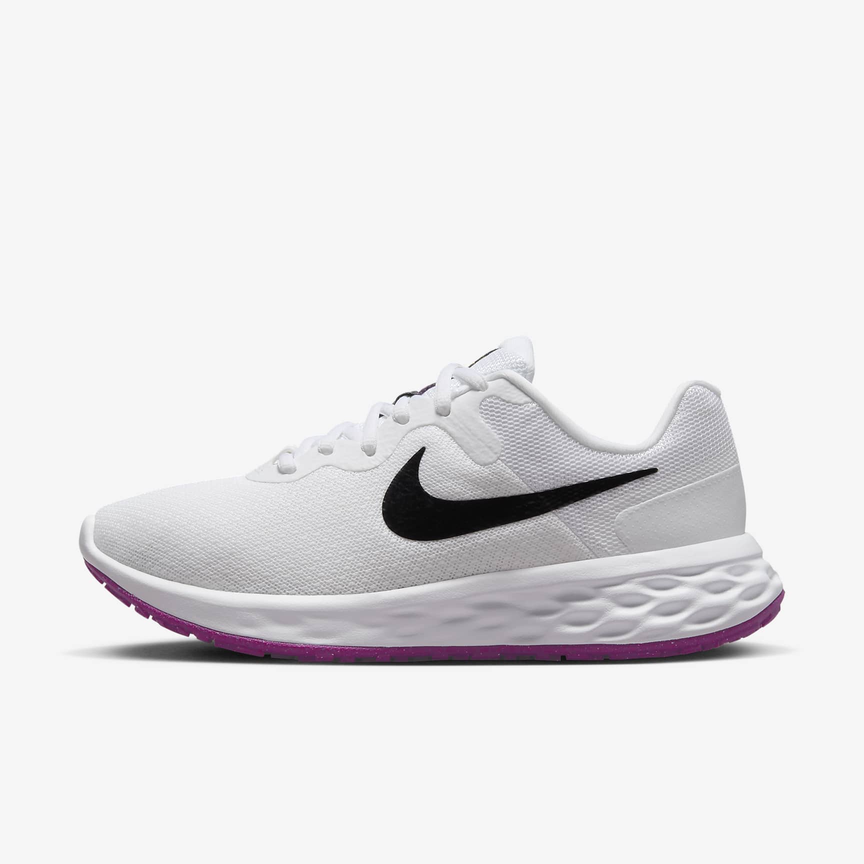 VERSATILE COMFORT WITH FLEXIBLE CUSHIONING. Made from at least 20% recycled material by weight, old materials find new beginnings. Now you can find yours. Set the pace at the start of your running journey with the plush feel of the Nike Revolution 6. We know comfort is key to a successful run, so we made sure your steps are cushioned and flexible for a soft ride. It's an evolution of a favourite, with a breathable design. Simple Design Plush mesh is placed along the collar for a comfortable feel. Additional skins throughout add durability. More Flexibility A foam midsole delivers a softer ride than the Revolution 5. The outsole has a computer-generated design that creates a natural piston effect as you run, providing more cushioning and flexibility. They combine for durable traction. Intuitive Touch Touch points at the heel and tongue create a natural feel as you get the shoes on and off.