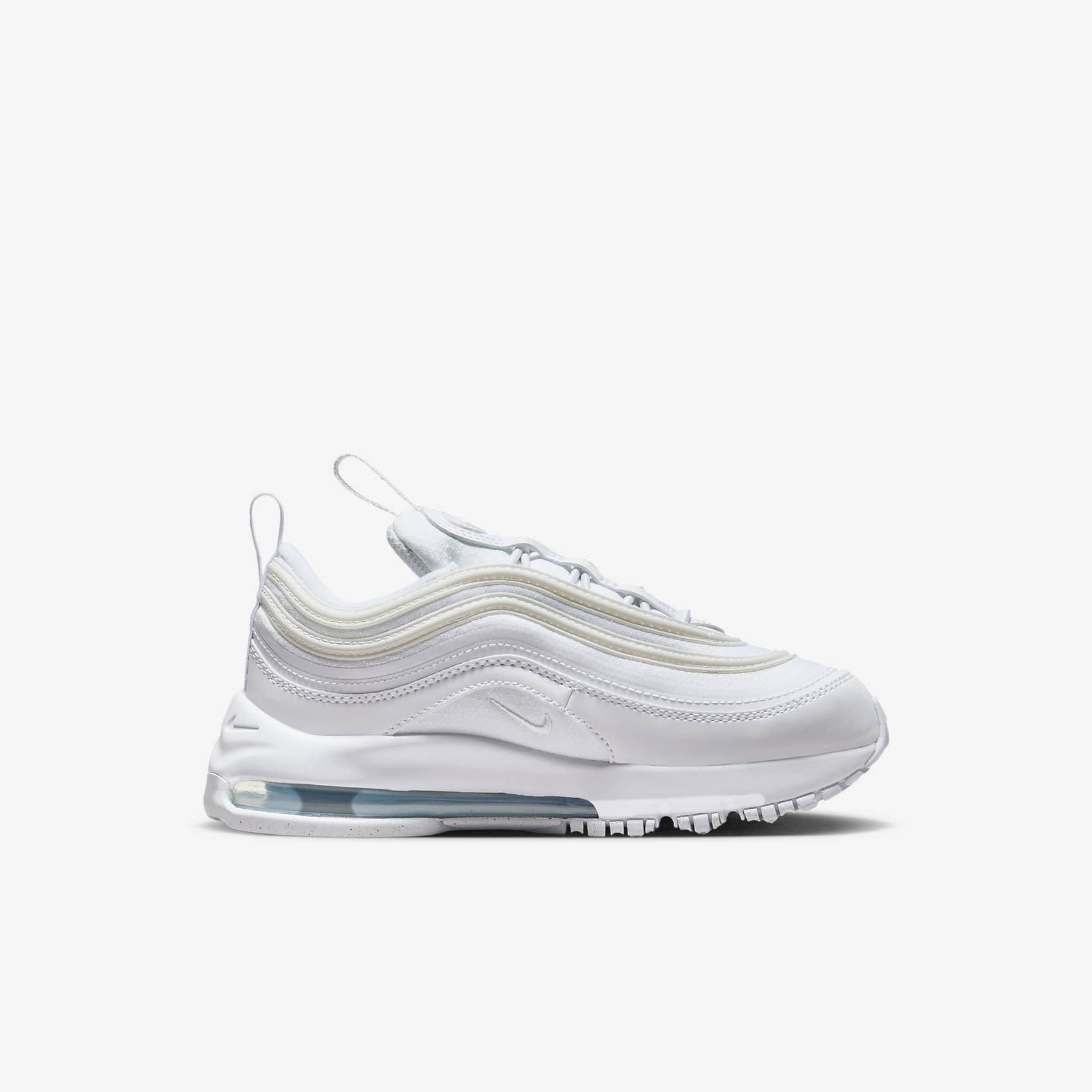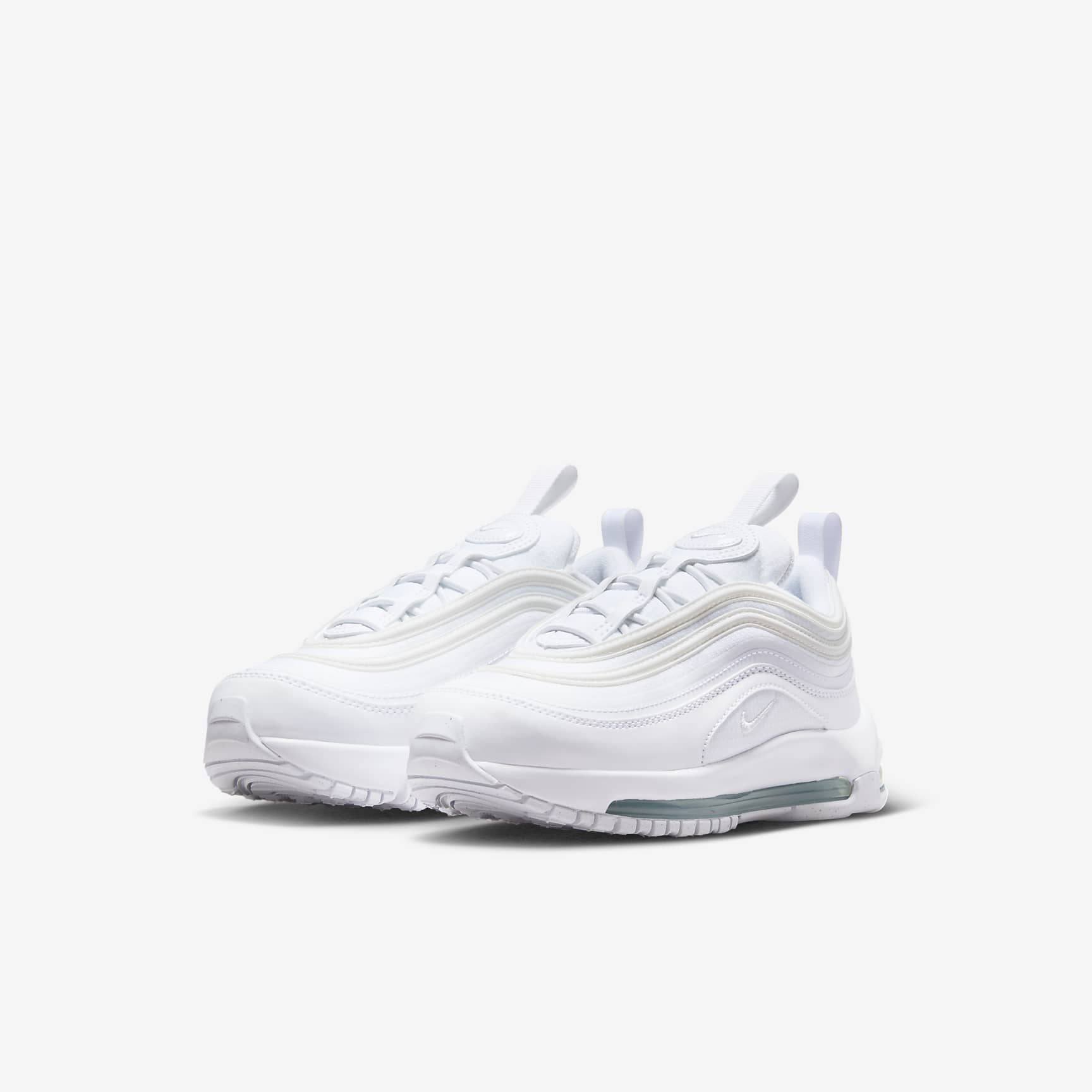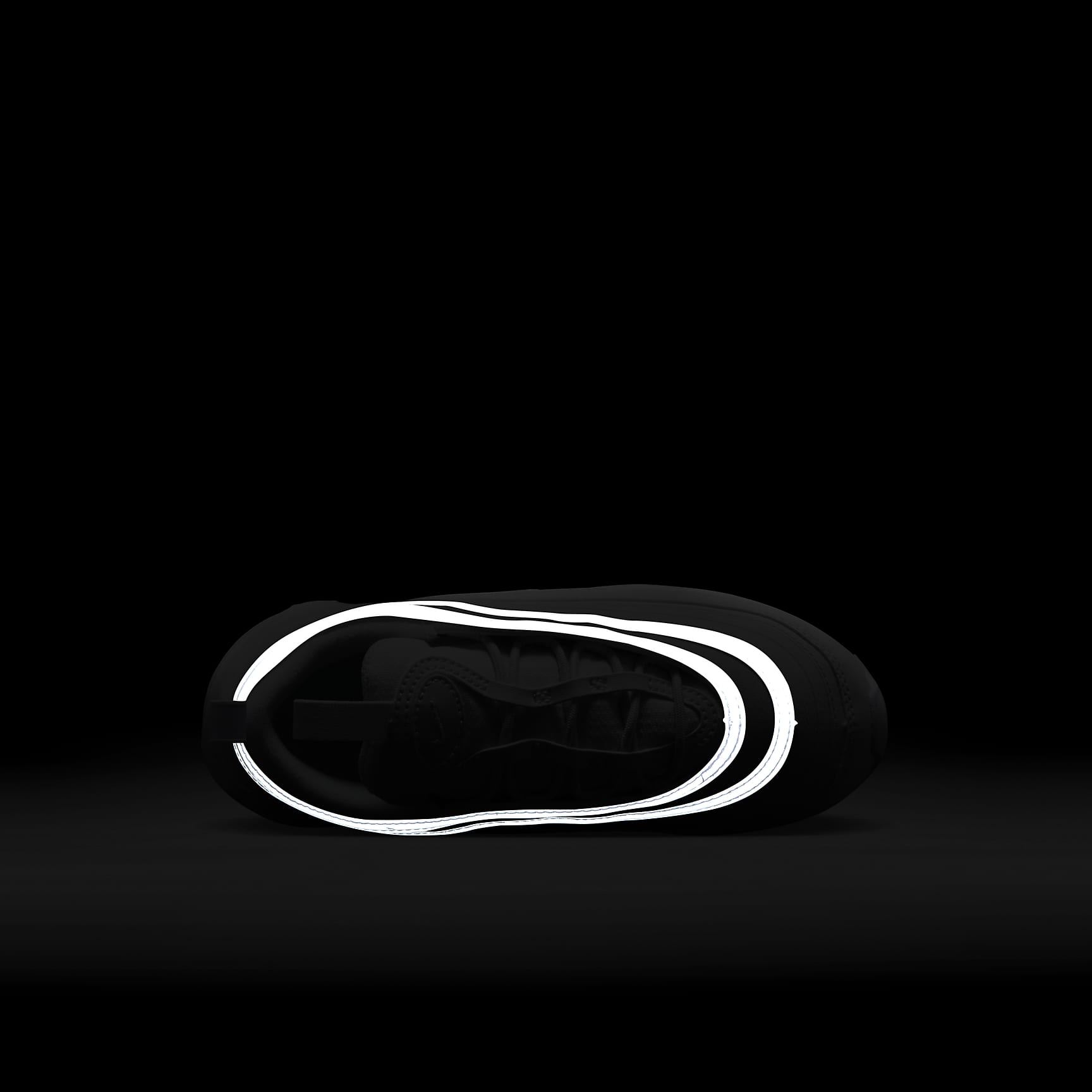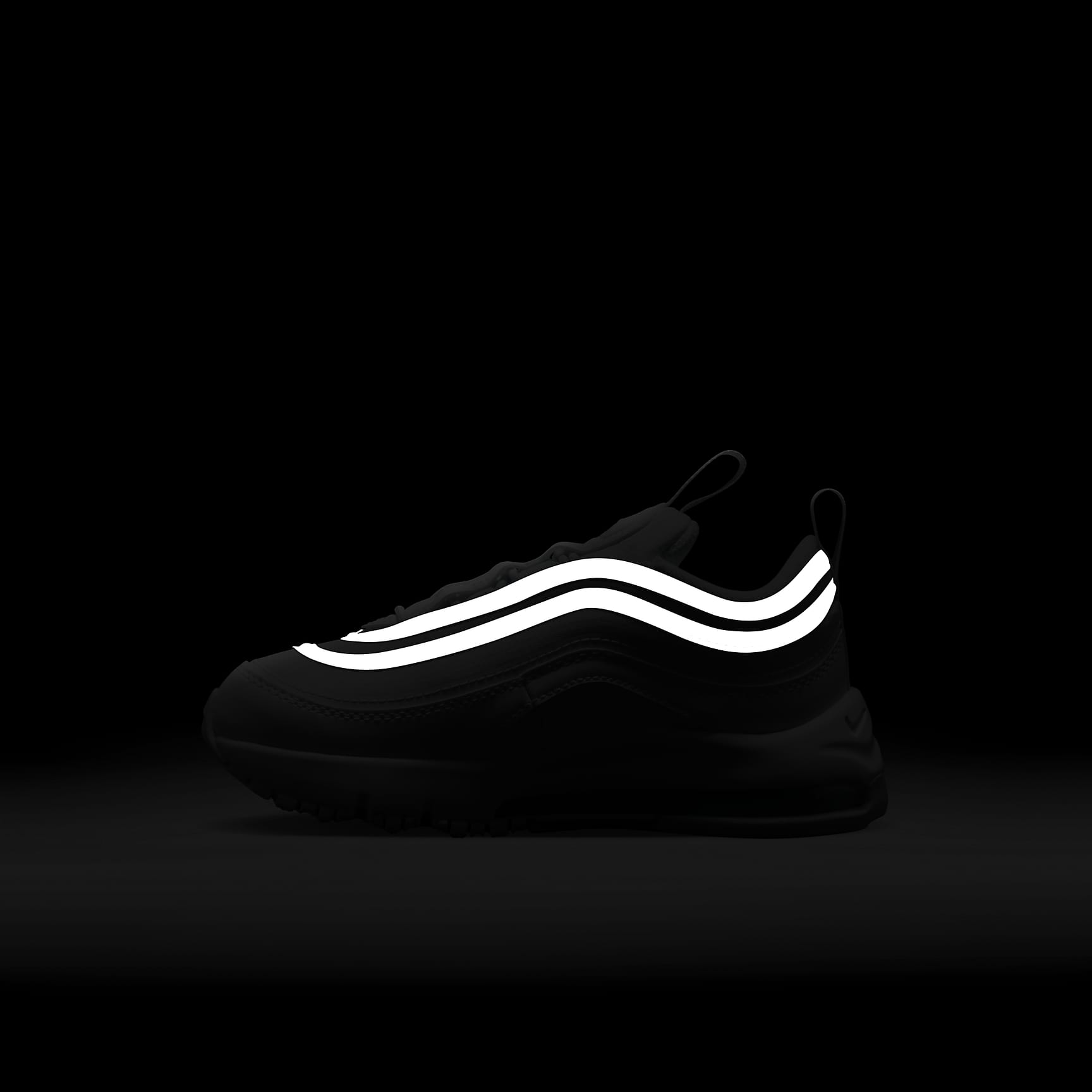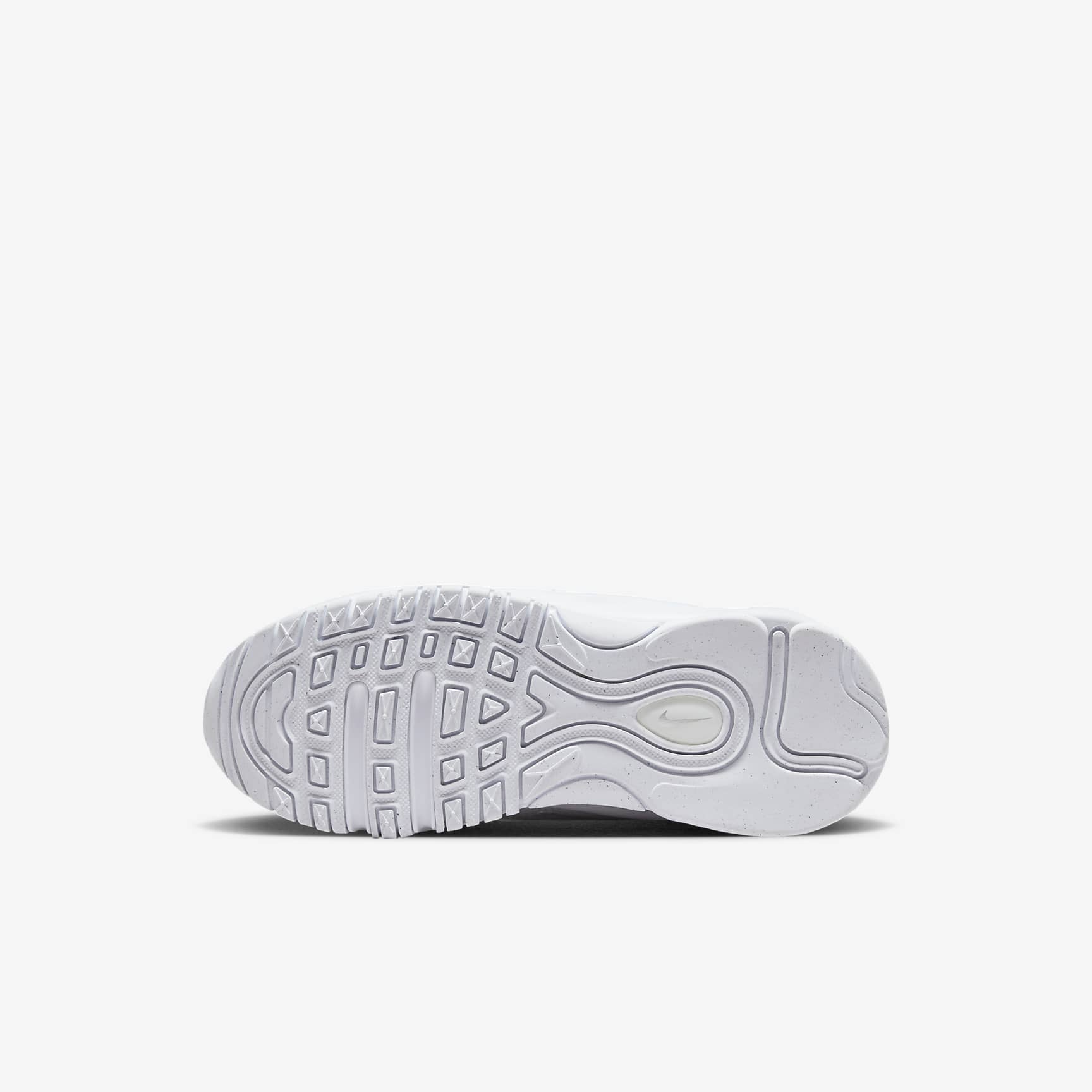 We used our imagination to rethink how an Air Max 97 could feel—without changing how it looked. Made with little feet in mind, the outsole is more flexible than previous editions so kids can spring like a kangaroo and sprint like a cheetah. We also replaced the layers of stiff materials around the foot with a soft woven fabric and printed detail. It's time to move! Walking On Air This kids-specific Air-Sole unit under soft foam helps provide stability and flexibility where developing feet need them most. First In The Lace Race Elastic laces and an internal stretchy strap make it easy to slip the shoes on and get going. Play In More Places The tread is made with non-marking rubber, flexible grooves and cut-outs so little ones can run, stop and go on more surfaces. Product Details * Heel and tongue pull tabs * Elastic laces * Synthetic leather panels * Not intended for use as Personal Protective Equipment (PPE)