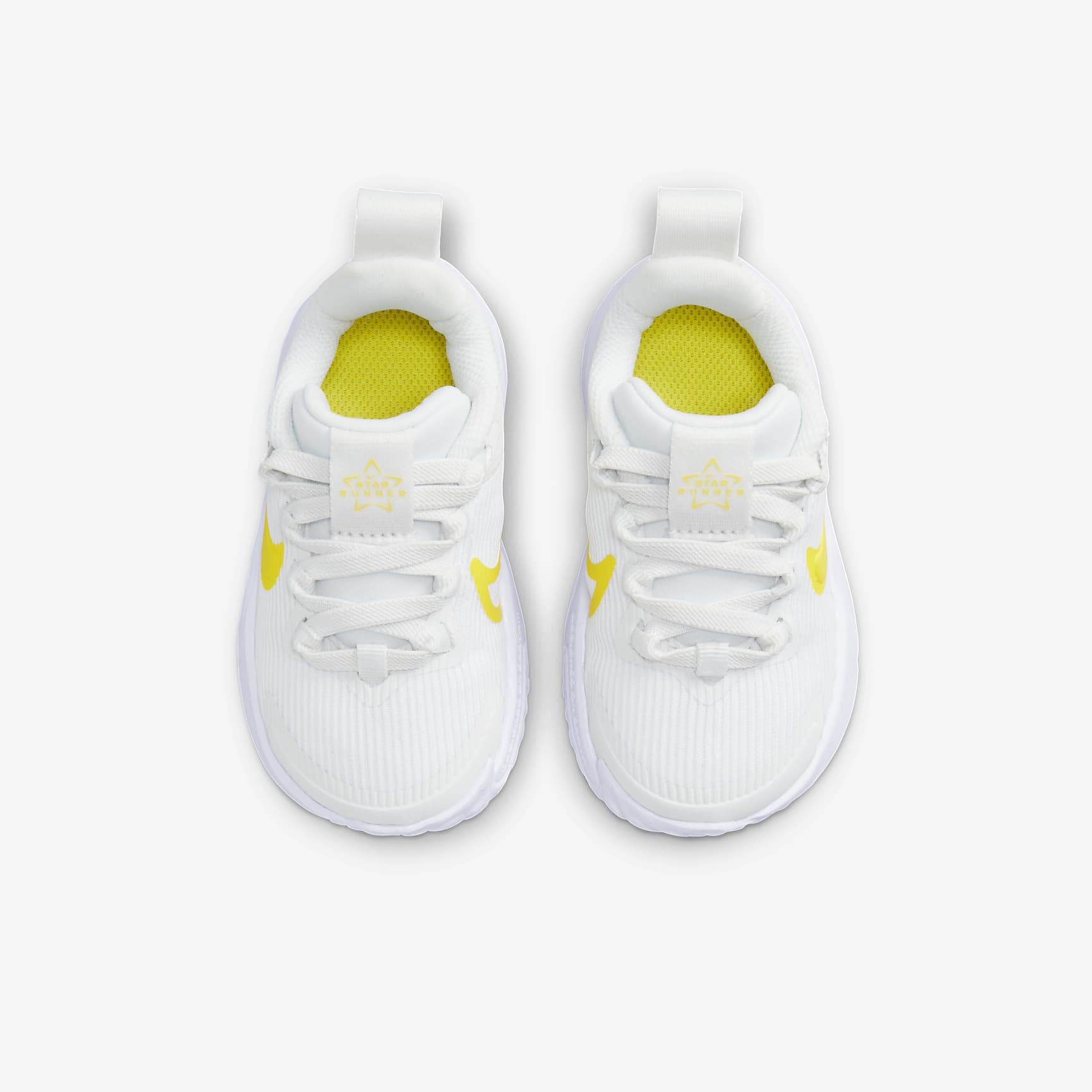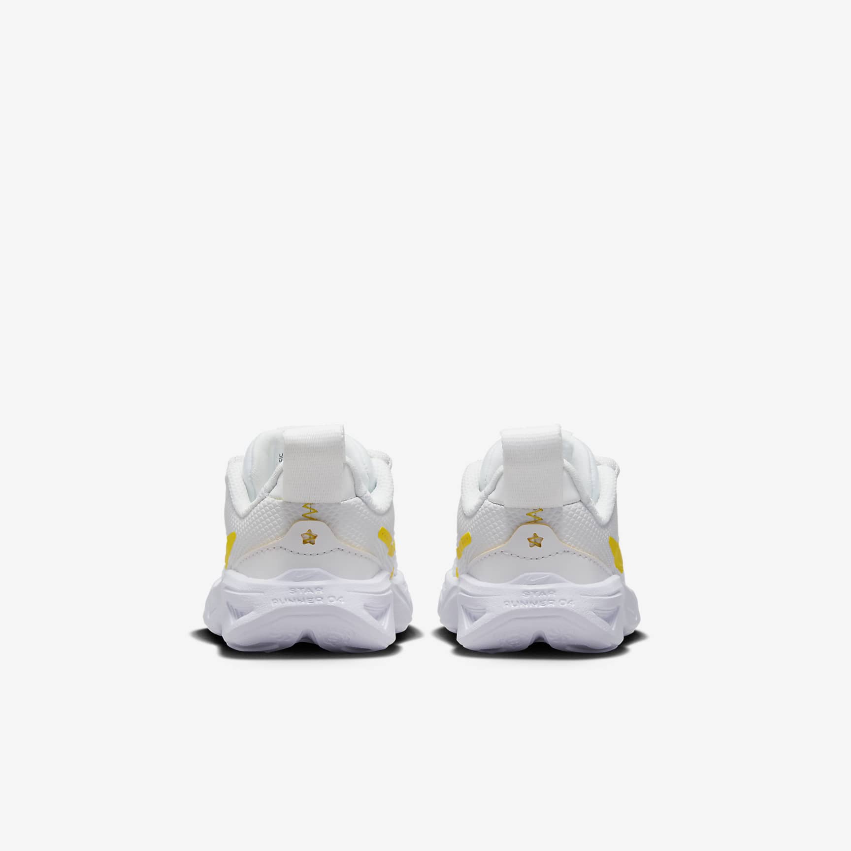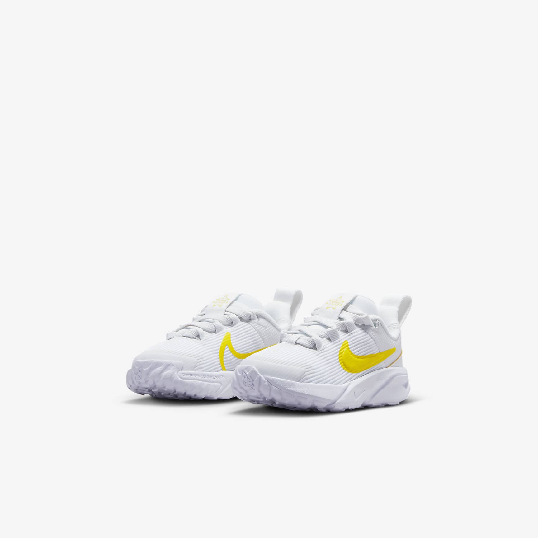Get out of the door in a flash with the Star Runner. Loops on the tongue and heel make it easy to open the shoe up wide so little star runners can step in and get going. Soft cushioning in the midsole provides a comfortable, springy feel so 1 more round, lap and turn is always an option. The tread grabs at pavement, grass and gravel to give them extra grip while a rubber-wrapped toe toughens up the construction so they can go further in the same pair of Star Runners. Benefits * Loops on the tongue and heel help make it easy to open the shoe up wide. * Tough as a snake: synthetic material covers the front of the shoe for long-lasting durability. * The vertical mesh upper helps keep kids cool. Product Details * Elastic laces
