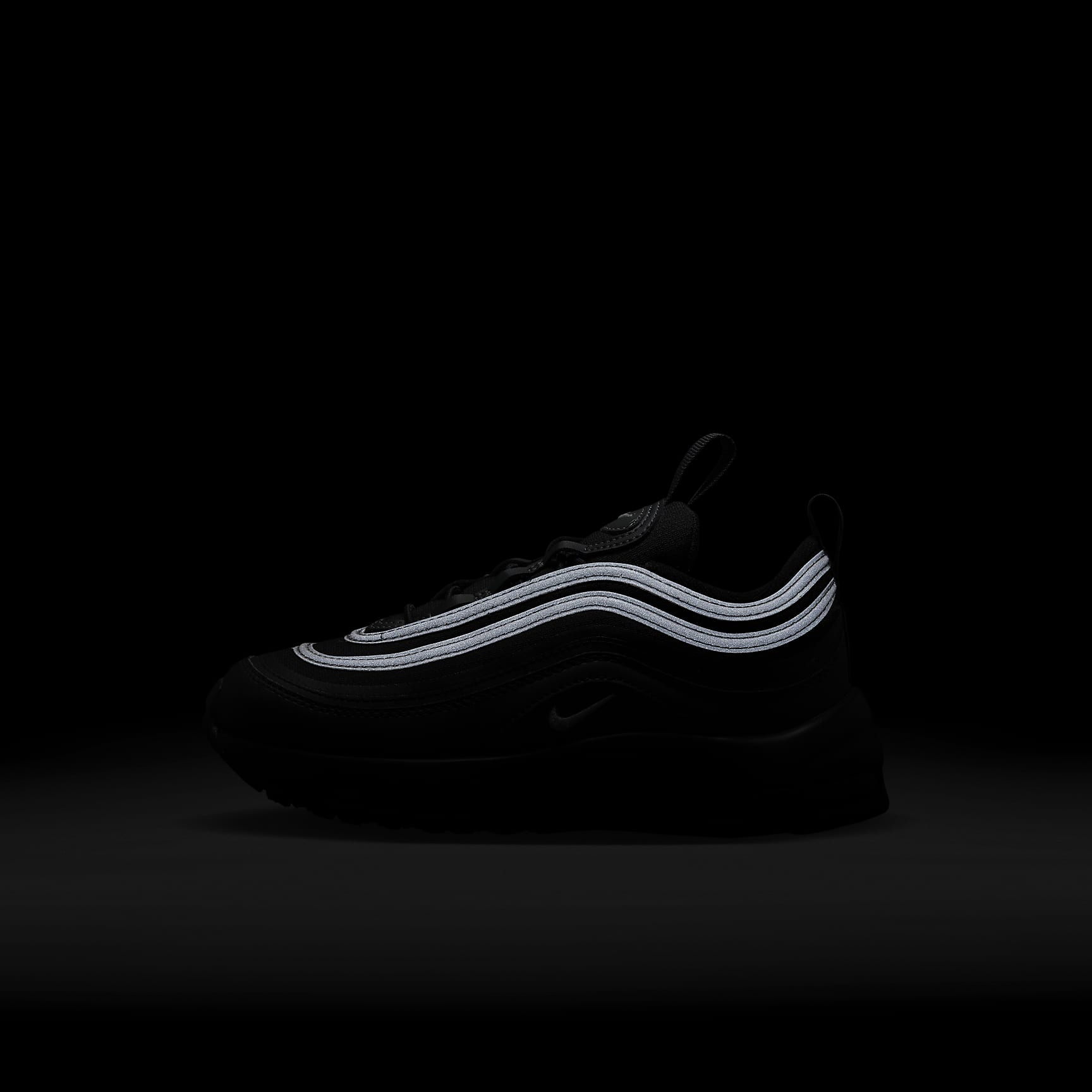 We used our imagination to rethink how an Air Max 97 could feel—without changing how it looked. Made with little feet in mind, the outsole is more flexible than previous editions so kids can spring like a kangaroo and sprint like a cheetah. We also replaced the layers of stiff materials around the foot with a soft woven fabric and printed detail. It's time to move! Walking On Air This kids-specific Air-Sole unit under soft foam helps provide stability and flexibility where developing feet need them most. First In The Lace Race Elastic laces and an internal stretchy strap make it easy to slip the shoes on and get going. Play In More Places The tread is made with non-marking rubber, flexible grooves and cut-outs so little ones can run, stop and go on more surfaces. Product Details * Heel and tongue pull tabs * Elastic laces * Synthetic leather panels * Not intended for use as Personal Protective Equipment (PPE)