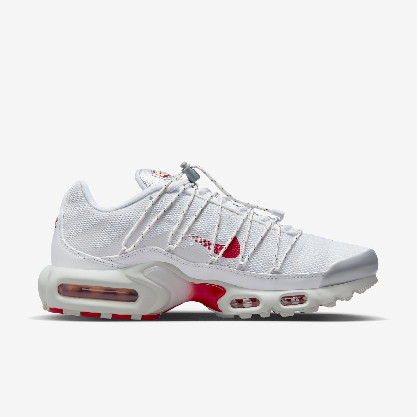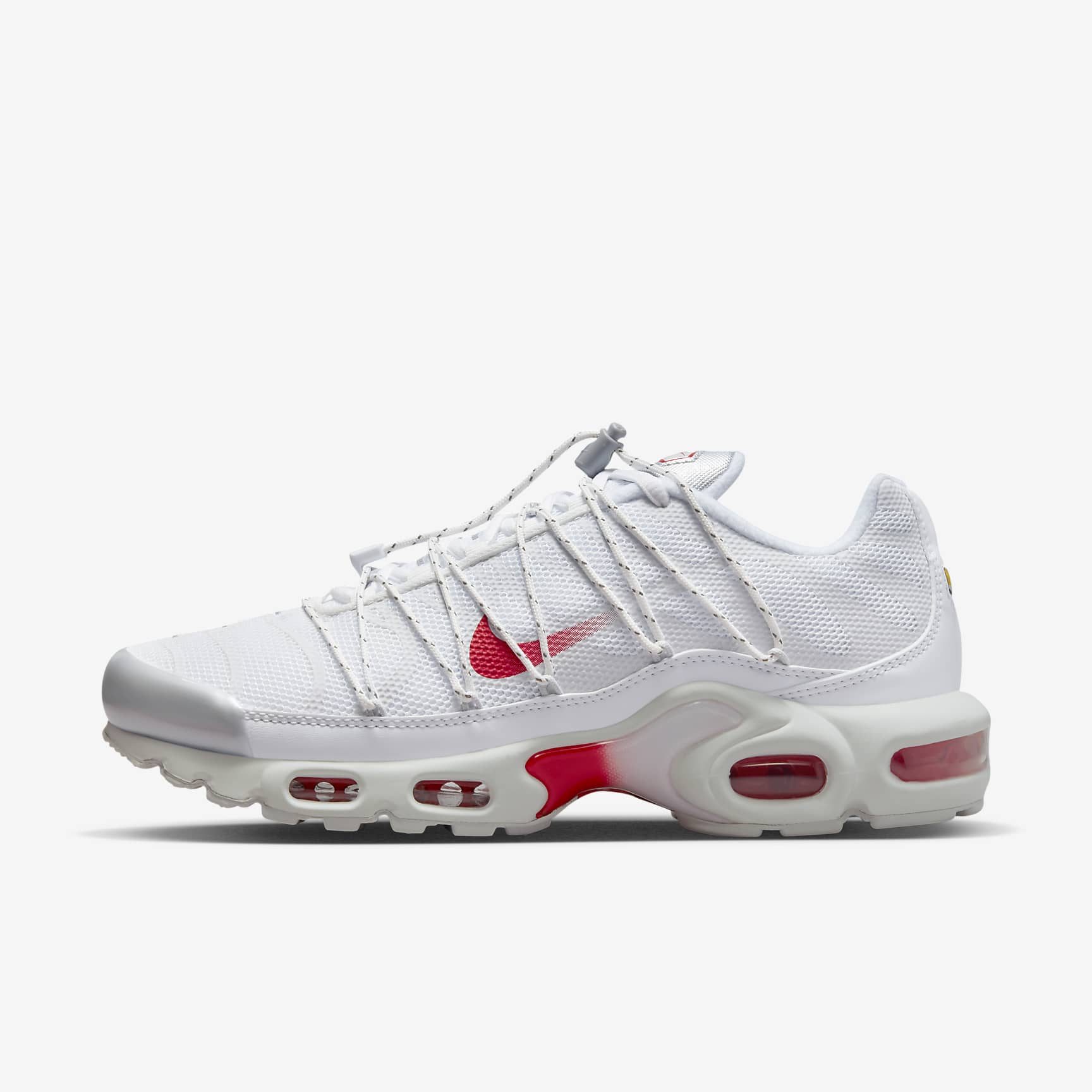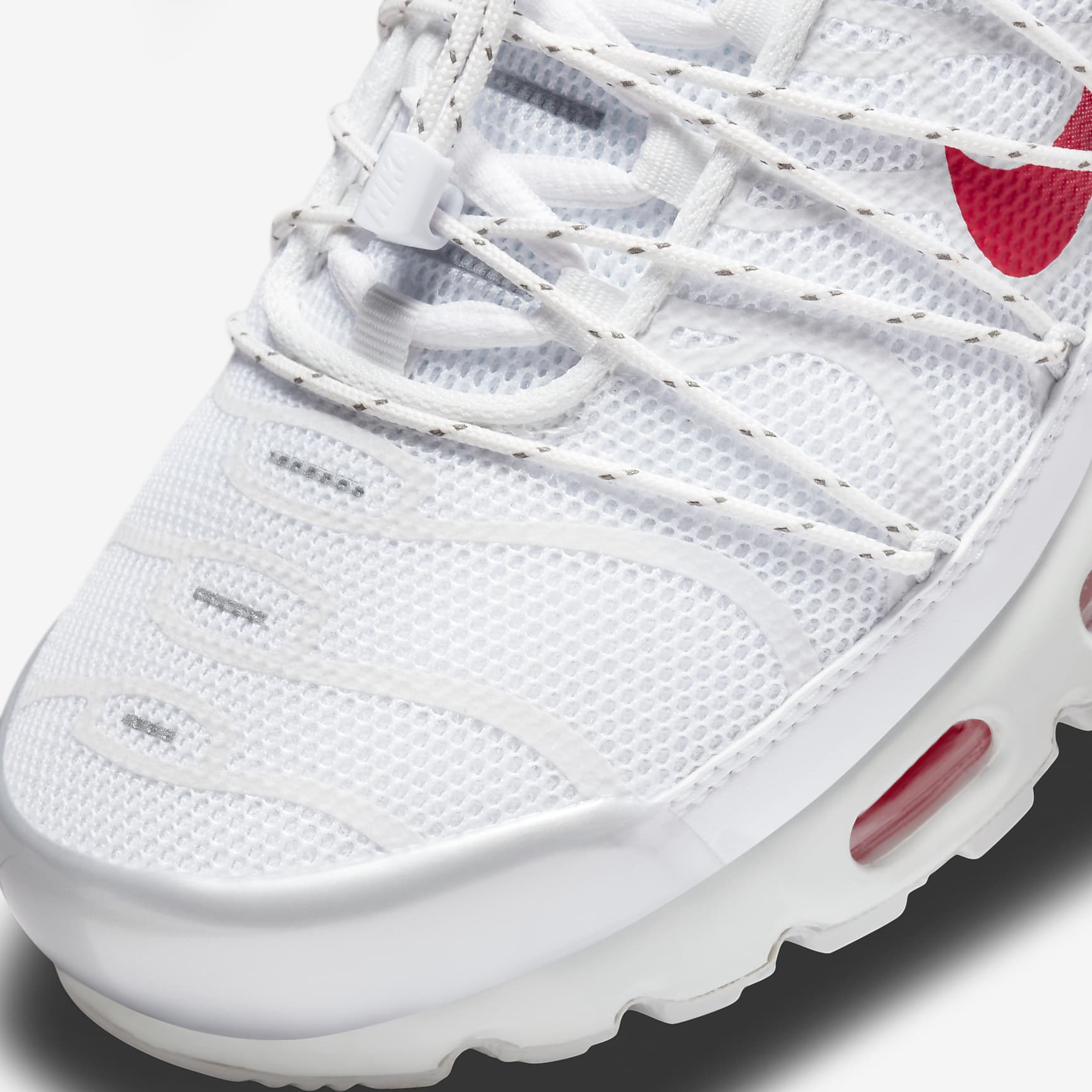 Inspired by the beach but made for city streets, this Nike Air Max Plus gets a rugged upgrade perfect for your urban adventures. A synthetic-leather mudguard adds durability to the breathable knit upper, while reflective design stripes and vibrant accents of silver and red bring head-turning style. An extra set of laces finishes off the look for a secure and supportive fit. Plus, Max Air units in the forefoot and heel provide a Tuned Air experience that blends comfort with defiant style. Benefits * Extra lace set tightens with a toggle and feeds through loops anchored to the mudguard. * Originally designed for performance running, Max Air units provide lightweight cushioning that lasts. * Synthetic leather pairs with airy knits and mesh to provide breathability, durability and support. * Rubber outsole gives you durable traction. Product Details * Reflective design details * Not intended for use as Personal Protective Equipment (PPE) Nike Air Max Origins Revolutionary Air technology first made its way into Nike footwear in 1978. In 1987, the Air Max 1 debuted with visible Air technology in its heel, allowing fans more than just the feel of Air cushioning—suddenly they could see it. Since then, next-generation Air Max shoes have become a hit with athletes and collectors by offering striking colour combinations and reliable, lightweight cushioning.