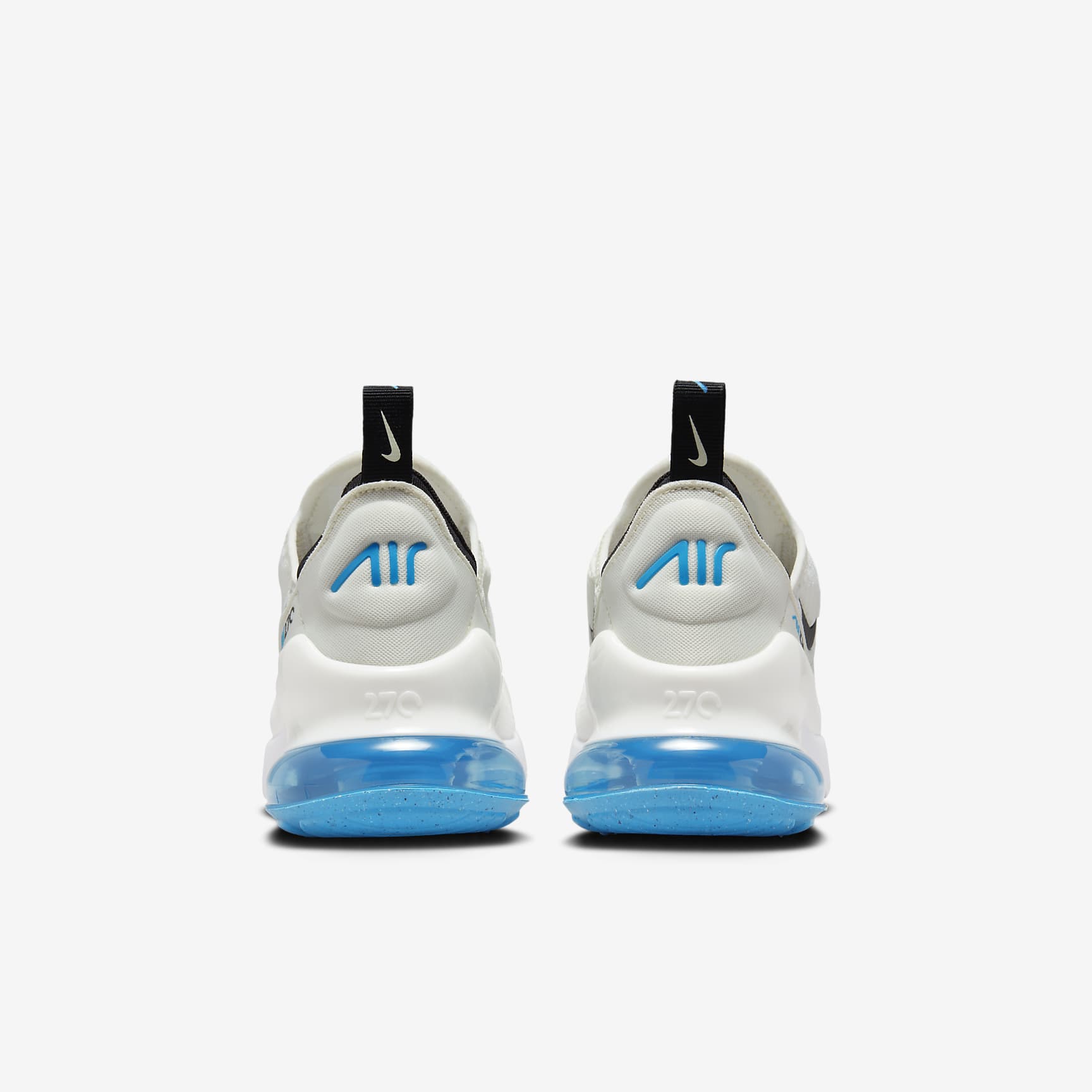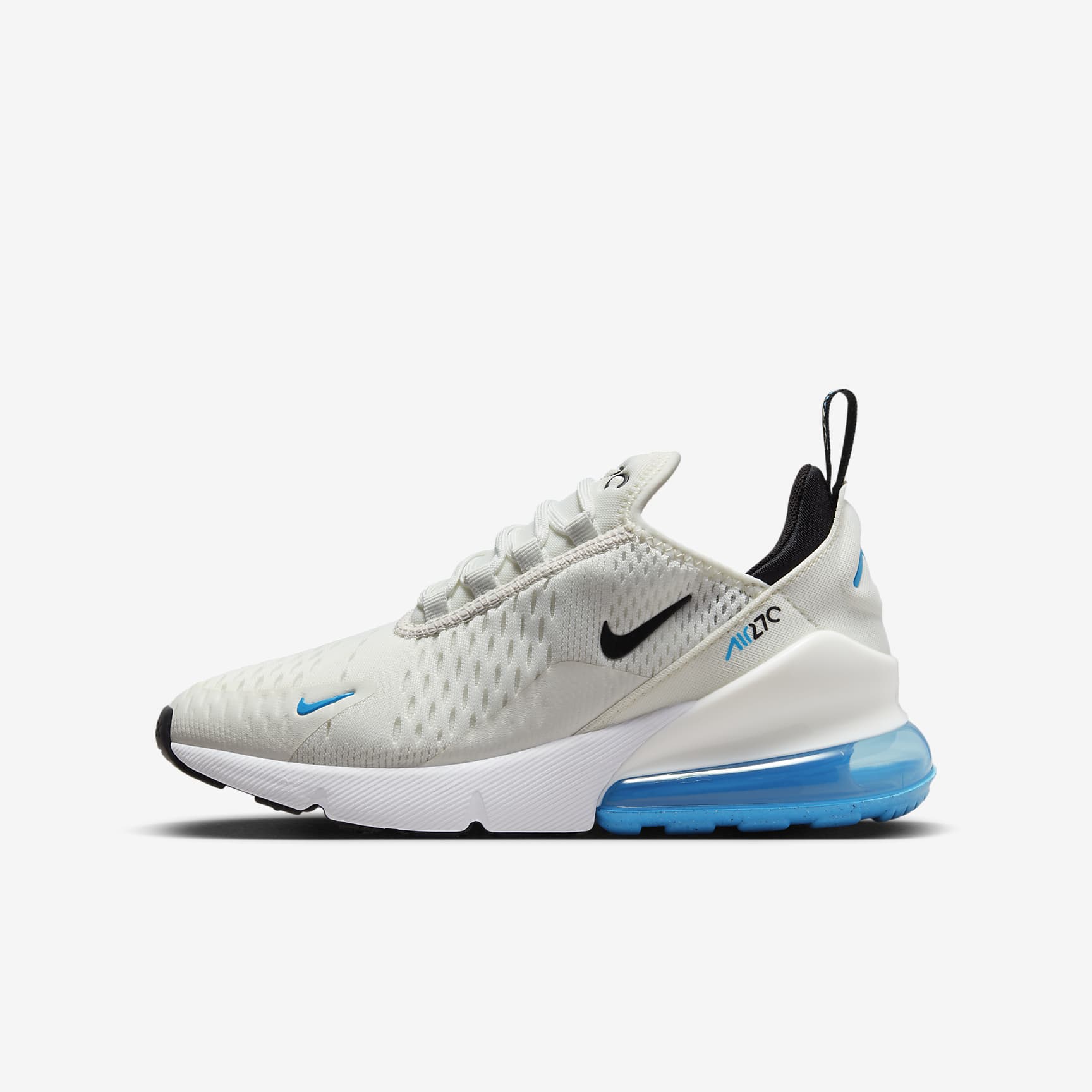 Big adventures call for big Air! Step into the Nike Air Max 270 and enjoy soft comfort you can see and feel. An extra-large Air unit in the heel provides cushioning and a dramatic style statement, while the sock-like fit of the stretchy inner sleeve helps your foot feel secure as you step out to play. Benefits * Woven materials on the upper provide a lightweight fit and airy feel. * Max Air unit provides 270 degrees of see-through cushioning. * Foam cushioning underfoot feels soft and lightweight. * Rubber outsole provides durable traction. * Grooves in sole help your foot bend naturally. Product Details * Heel pull tab * Foam midsole Nike Air Max Origins Revolutionary Air technology first made its way into Nike footwear in 1978. In 1987, the Air Max 1 debuted with visible Air technology in its heel, allowing fans more than just the feel of Air cushioning—suddenly they could see it. Since then, next-generation Air Max shoes have become a hit with athletes and collectors by offering striking colour combinations and reliable, lightweight cushioning.
