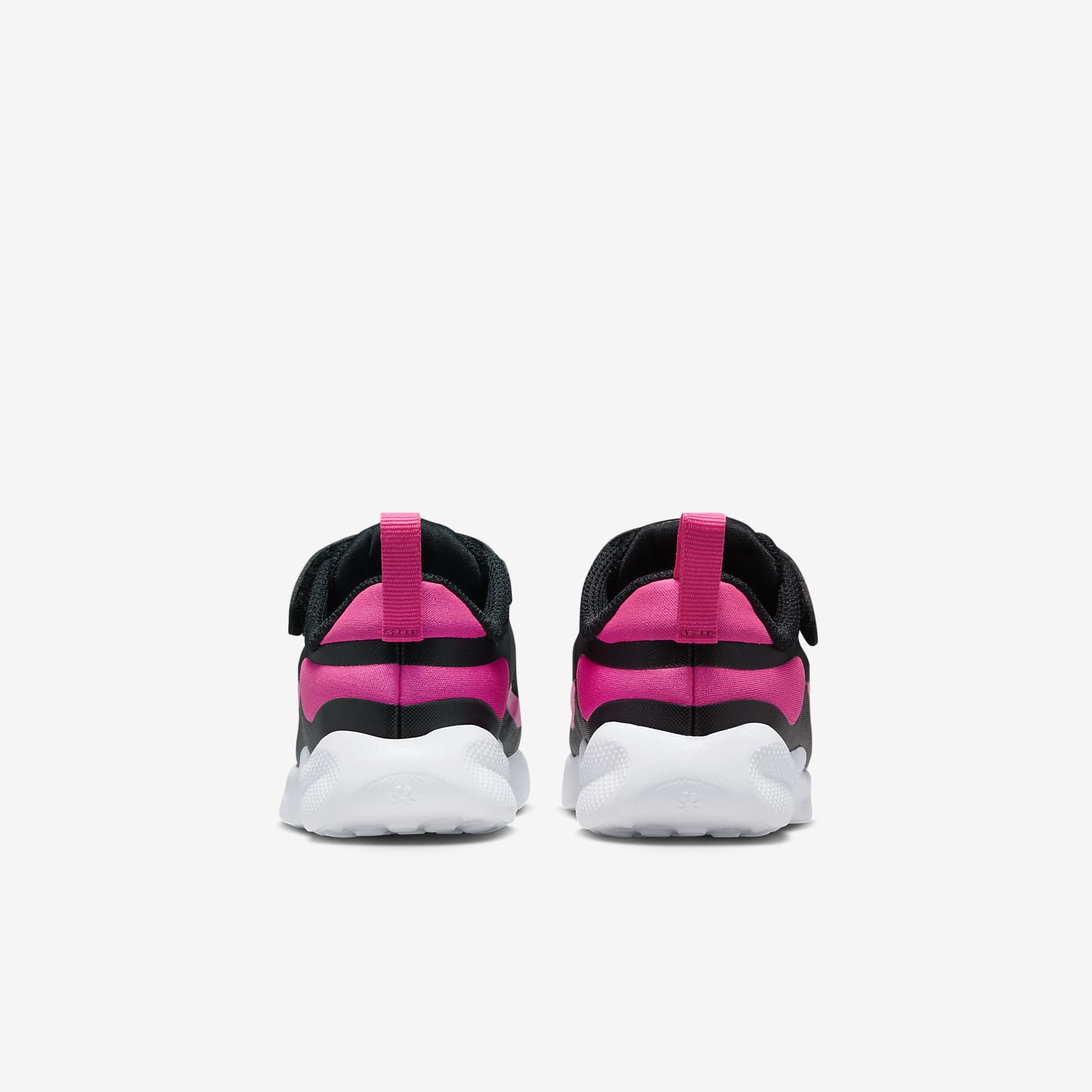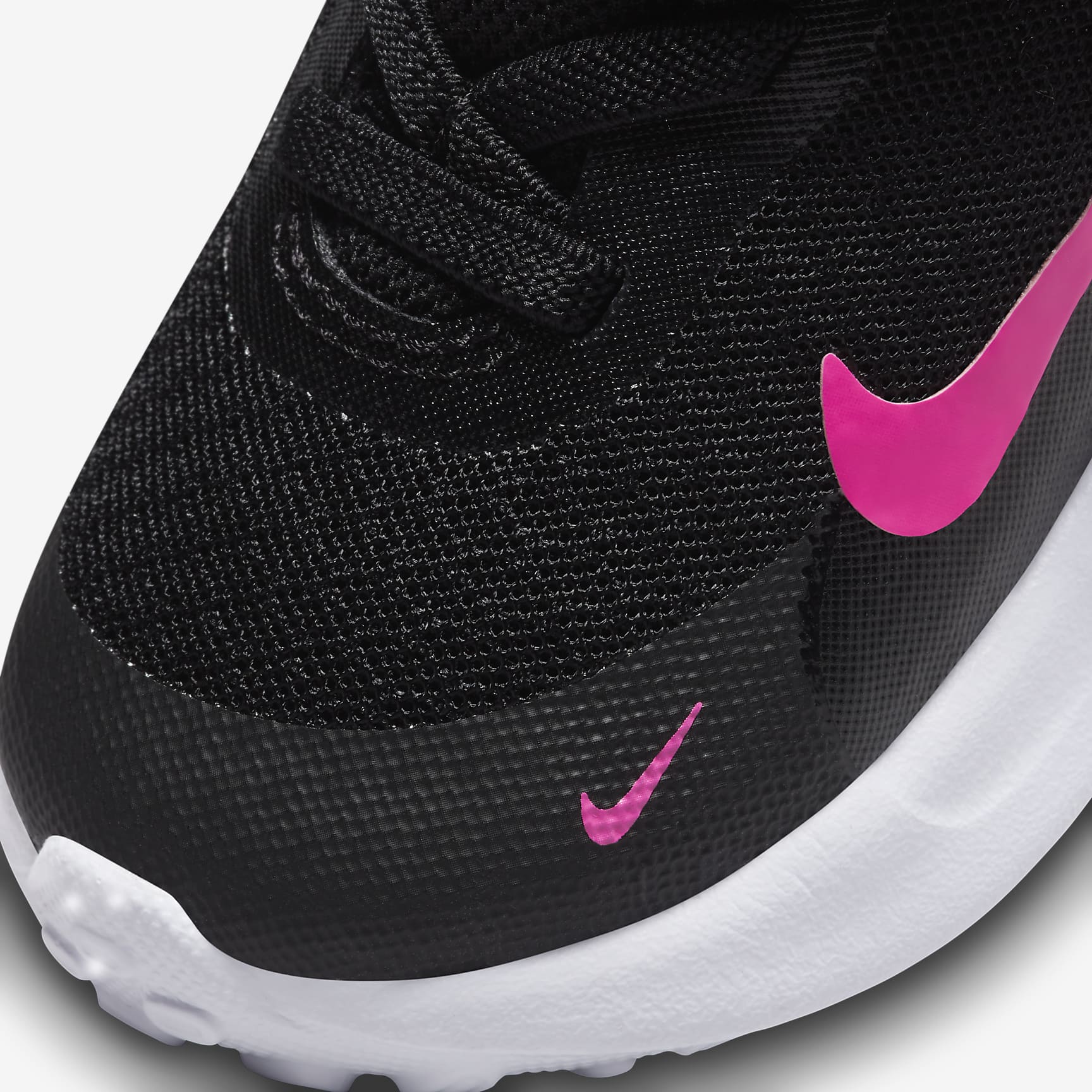 Let your little one flash, dash and blast to the finish line in the Nike Revolution 7. Made for fun, it features springy foam and a Waffle-inspired outsole for all the cushioning and traction kids need to race into play. What's New We added more foam to the midsole and extra cushioning around the heel for a truly comfortable feel. Easy to Put On Elastic laces and a hook-and-loop strap make these shoes easy to take on and off. Reinforced Upper Lightweight textiles up top help keep these shoes breathable. We reinforced high-wear areas like the toe for added durability. Soft Foam Midsole Soft, springy foam in the midsole helps cushion their every stride as run and play the day away. Padded Collar Pillow-soft foam around the collar and heel adds another layer of comfortable cushioning. Grippy Traction Outsole features a Waffle-inspired tread pattern to help give kids grippy traction. Product Details * Elastic laces * Foam midsole * Pull tabs on heel