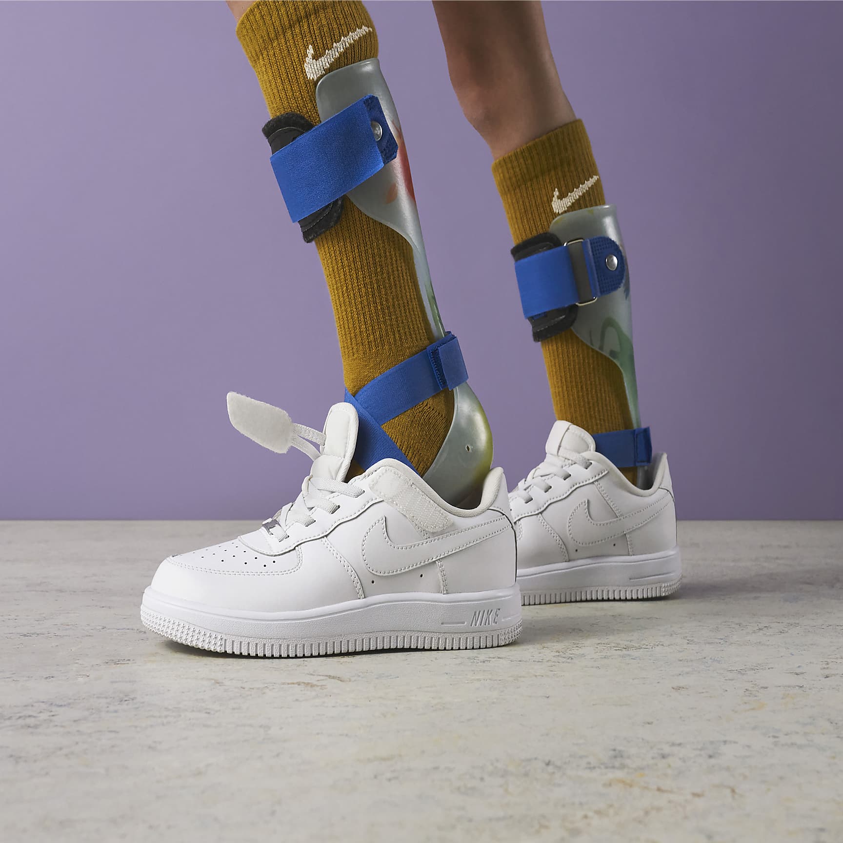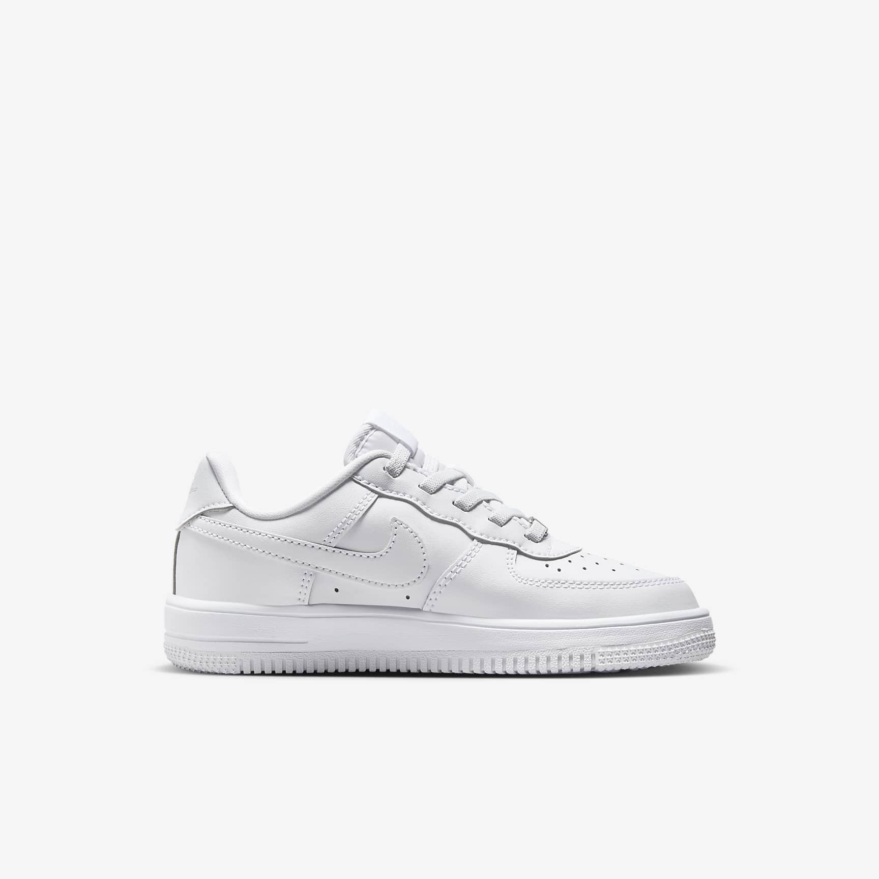 The look of laces without the struggle of having to tie them? Now, that's easy. The laces on these sneakers are just for show—the top two lace loops are attached to a hook-and-loop strap so kids can fasten them fast while still enjoying the traditional look of the AF-1. But these shoes aren't just easy for kids to put on. We designed them around kids' feet for overall comfort too. Benefits * FlyEase is now Nike EasyOn. Our helpful Nike EasyOn features empower kids to do it themselves so they can focus on what matters most: play. * Elastic laces and a hook-and-loop strap help make it easy for kids to open these up wide, slip them on and secure their fit fast. * More foam means more comfort! We made the foam in these kicks comfy and soft to help every step feel comfortable. * Full rubber sole gives durable traction with a circular tread pattern originally designed to help basketball players pivot on the court. Product details * Elastic laces * Perforations on the toe