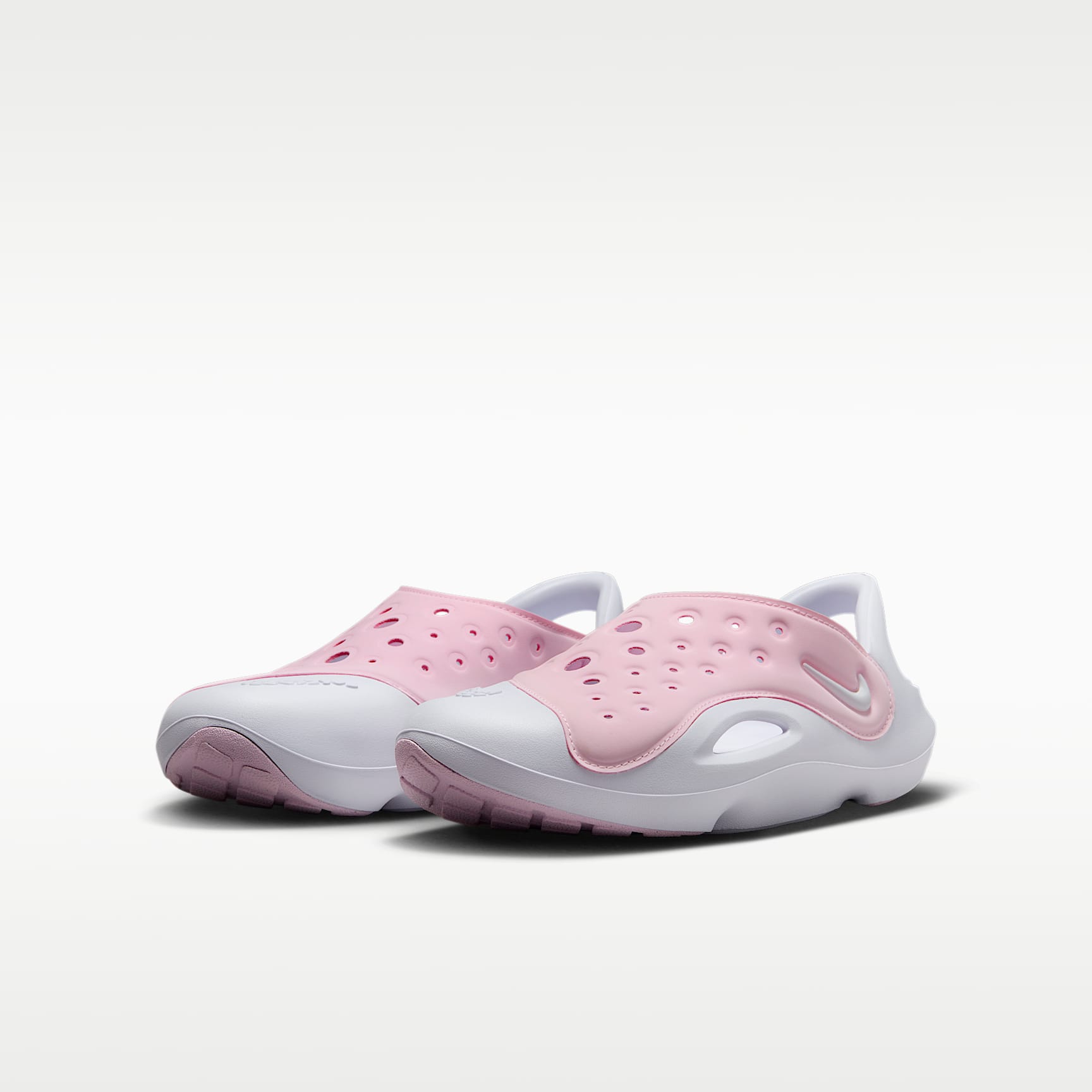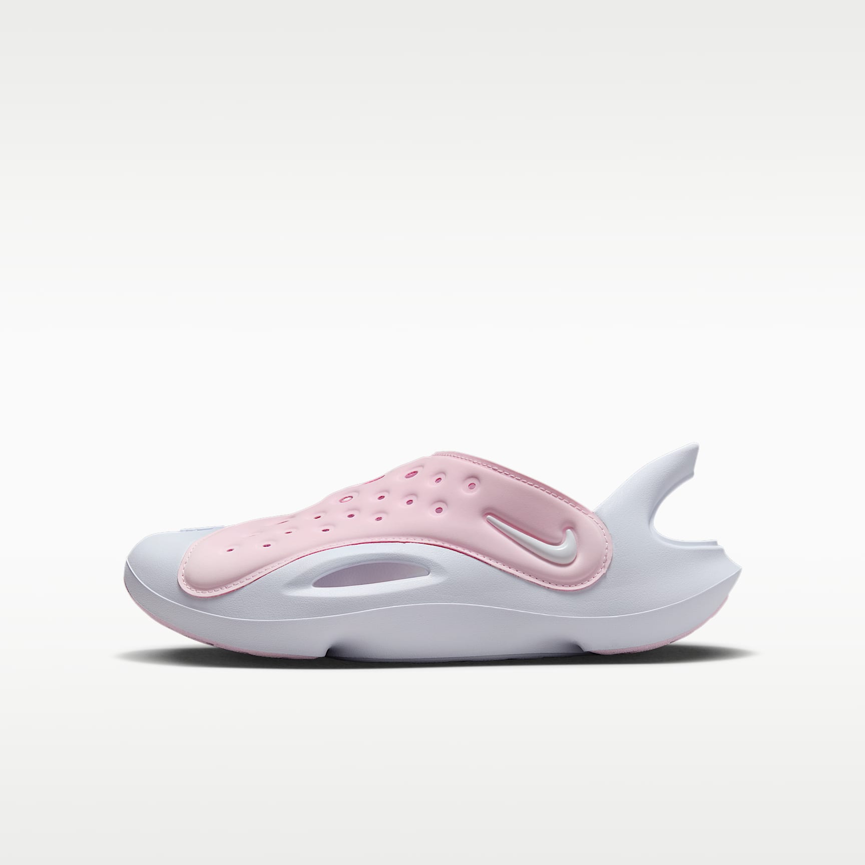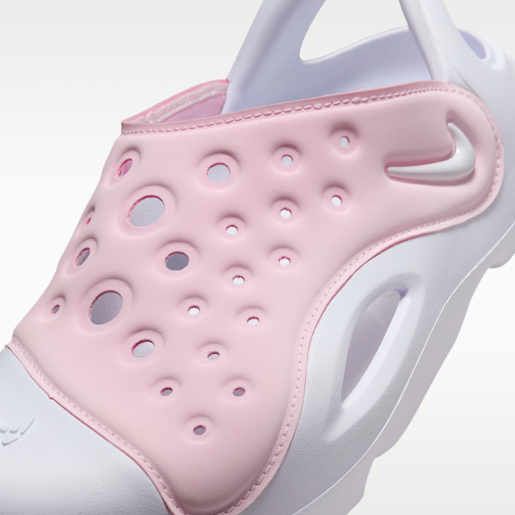 From sunny days at the pool to splashing through creeks, the Nike Aqua Swoosh is ready for it all. Soft fabric up top and plush foam underfoot help make for comfortable steps while a heel strap secures the fit. Plus, drainage holes on the upper and cut-outs along the sides help make these ideal for all your water-based adventures. Benefits * The soft and smooth upper helps provide stretchy support. * A fixed heel strap helps secure the fit. * Rubber outsole helps provide durable traction.