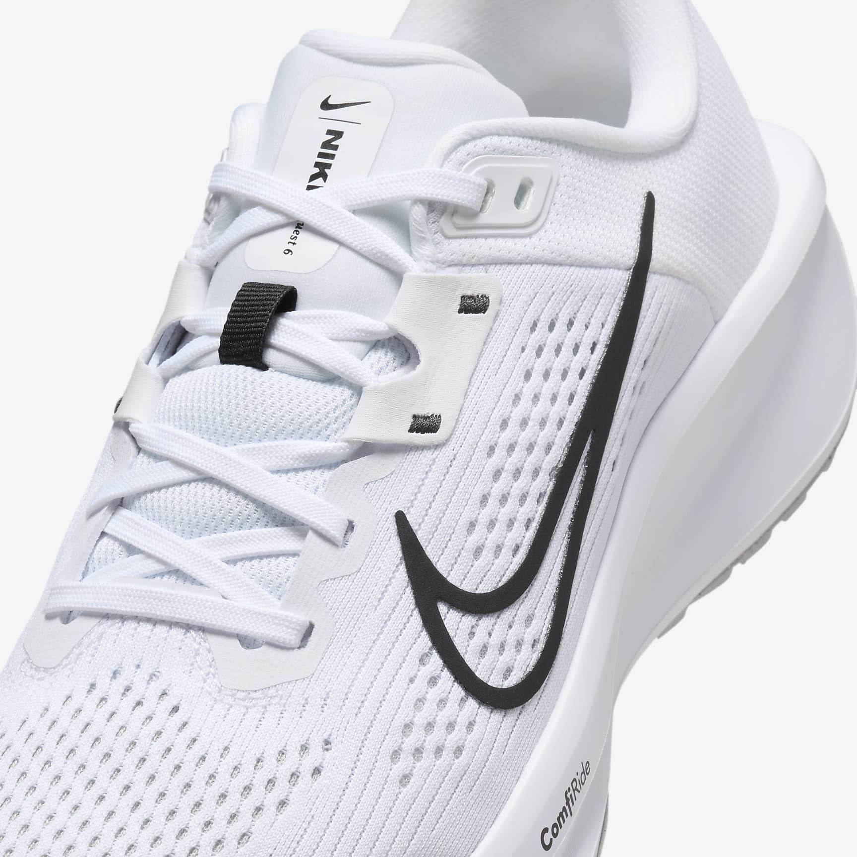 A high foam stack and secure fit for your everyday miles. The Nike Quest 6 is for runners of all levels. But make no mistake, it's anything but entry level. A super-comfortable and supportive midfoot fit band helps keep you stable for your miles. Plus, a super-soft midsole foam helps cushion each step. Secure fit The midfoot fit band helps keep your foot more secure the tighter your laces are. Softer, more responsive The increased midsole height means a softer and more responsive ride compared with the Quest 5. Grippy traction The rubber outsole has the traction to help keep your feet gripped to the pavement. Product details * Weight: 247g approx. (women's UK 5.5) * Heel-to-toe drop: 10mm