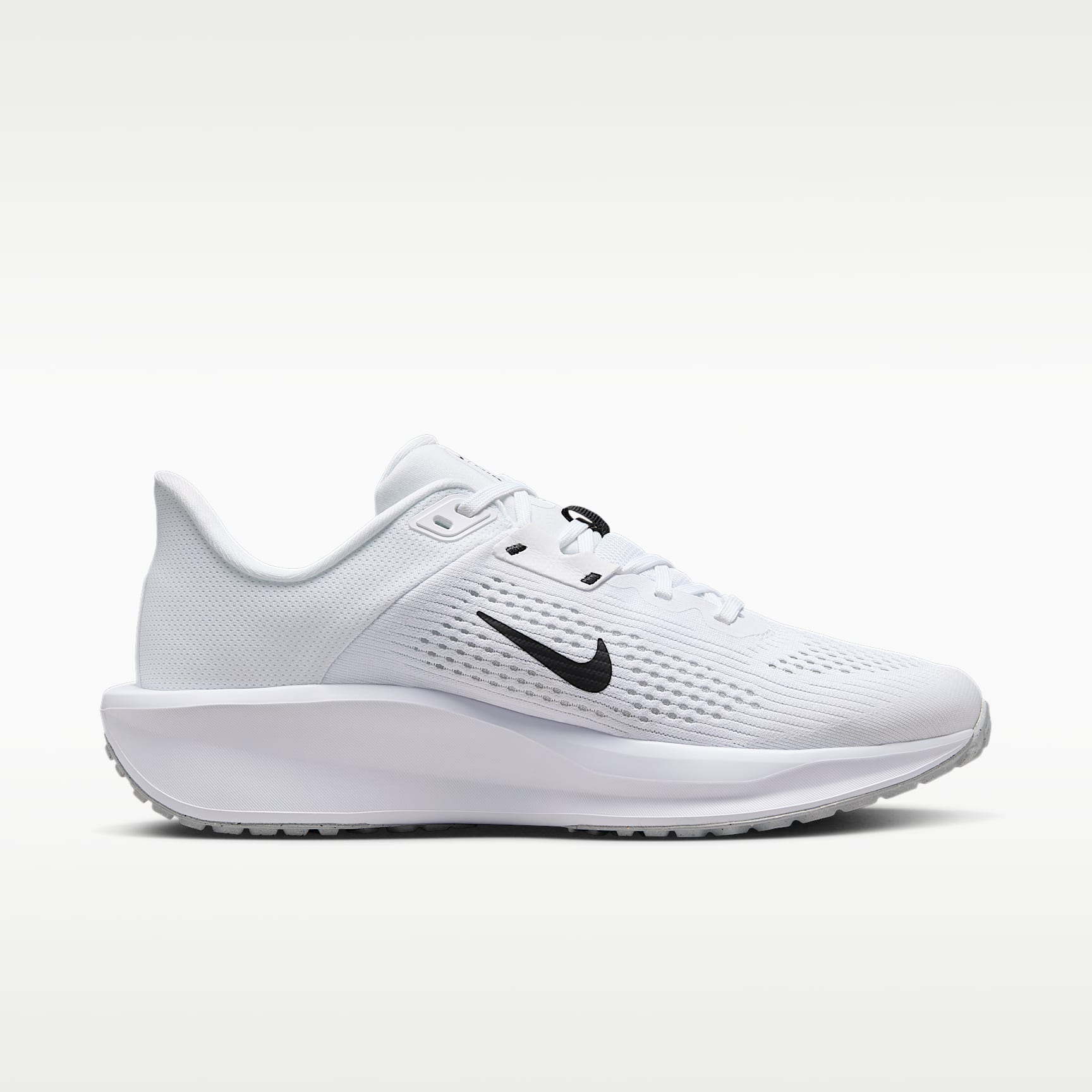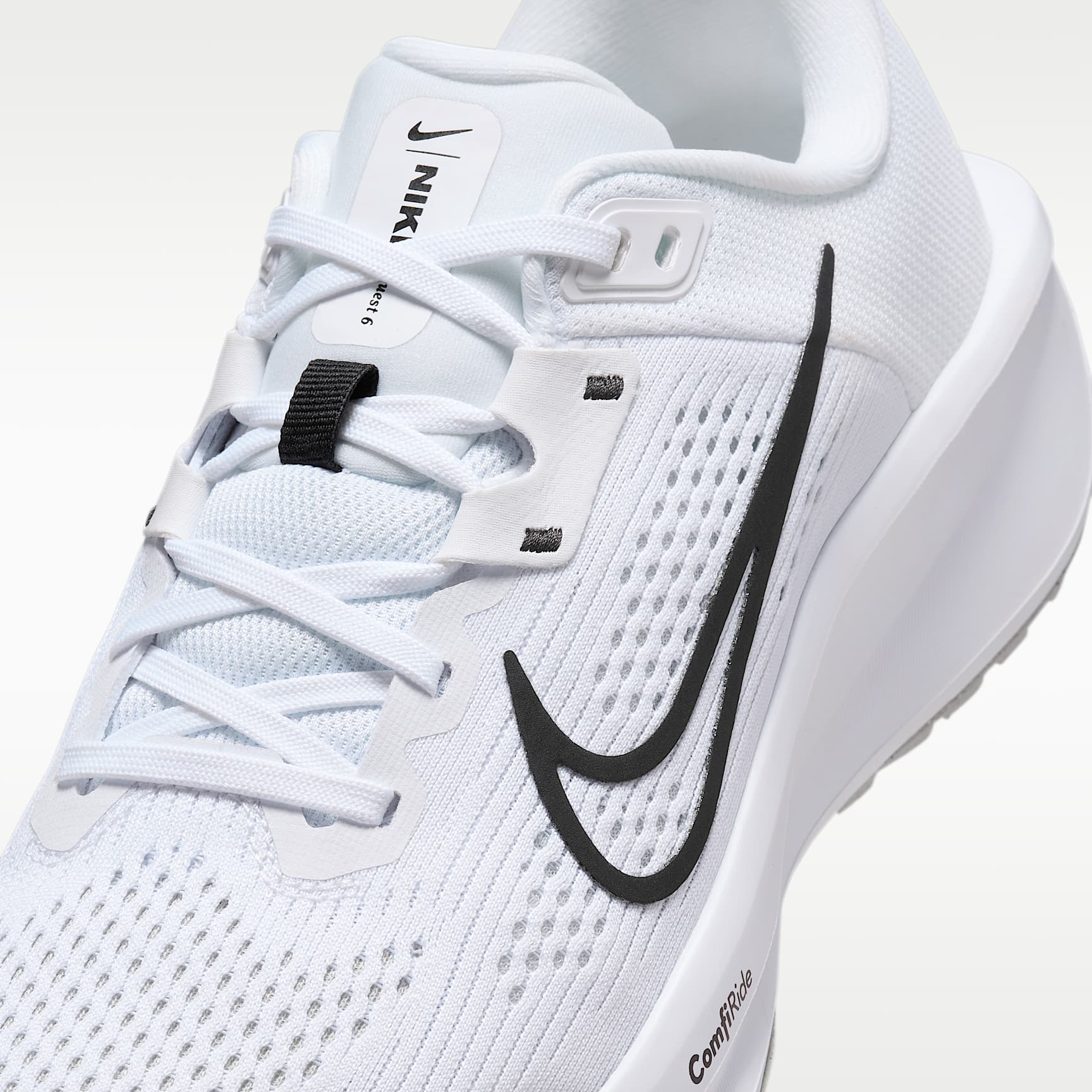 A high foam stack and secure fit for your everyday miles. The Nike Quest 6 is for runners of all levels. But make no mistake, it's anything but entry-level. A supercomfortable and supportive midfoot fit band helps keep you stable for your miles. Plus, a supersoft midsole foam helps cushion each step. Secure Fit Midfoot fit band helps keep your foot more secure the tighter your laces are. Softer, More Responsive Increased midsole height means a softer and more responsive ride compared to the Quest 5. Grippy Traction Rubber outsole has the traction to help keep your feet gripped to the pavement. Product Details * Weight: Approx. 247g/8.7oz (Women’s US 8) * Heel-to-toe drop: 10mm