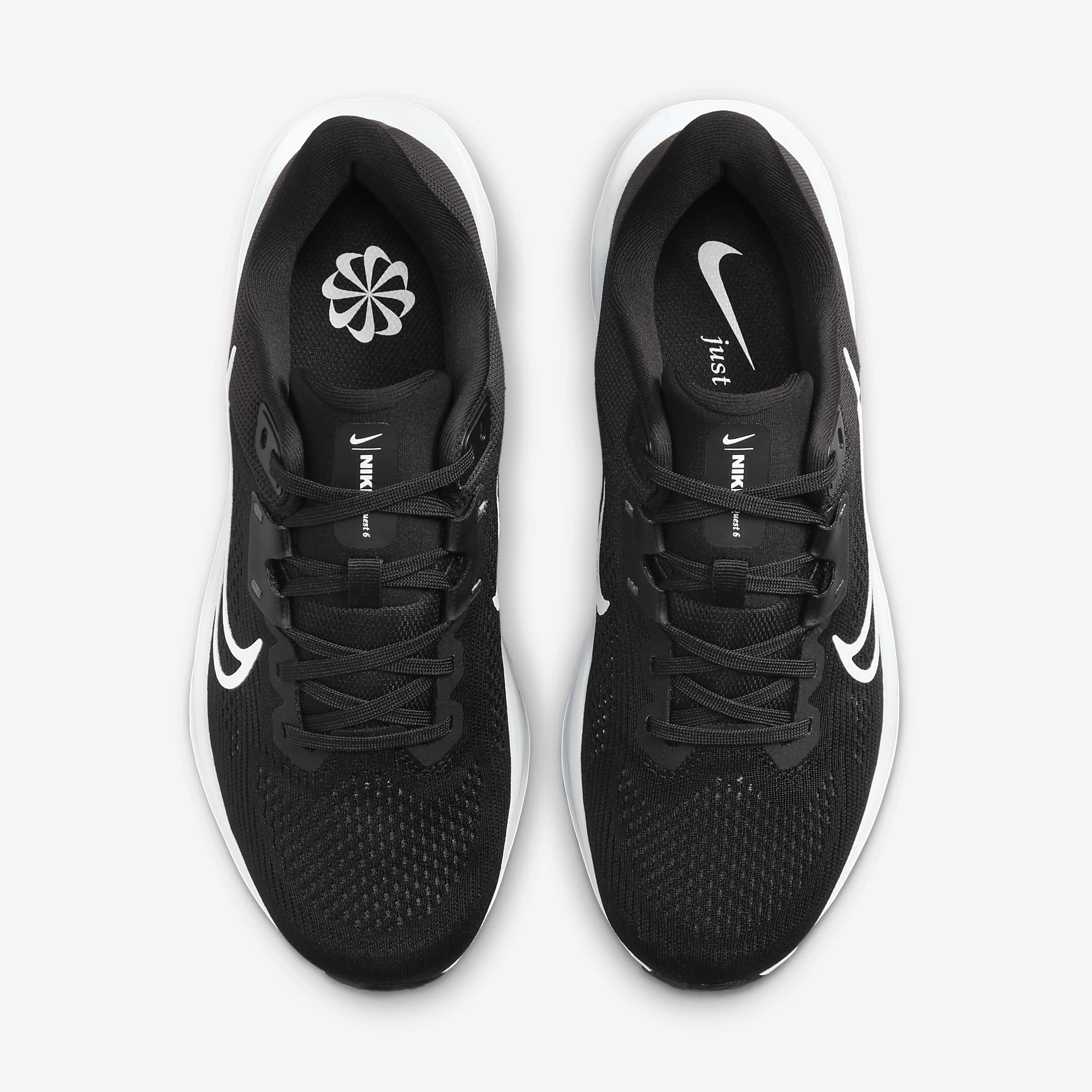 A high foam stack and secure fit for your everyday miles. The Nike Quest 6 is for runners of all levels. But make no mistake, it's anything but entry level. A super-comfortable and supportive midfoot fit band helps keep you stable for your miles. Plus, a super-soft midsole foam helps cushion each step. Secure fit The midfoot fit band helps keep your foot more secure the tighter your laces are. Softer, more responsive The increased midsole height means a softer and more responsive ride compared with the Quest 5. Grippy traction The rubber outsole has the traction to help keep your feet gripped to the pavement. Product details * Weight: 247g approx. (women's UK 5.5) * Heel-to-toe drop: 10mm