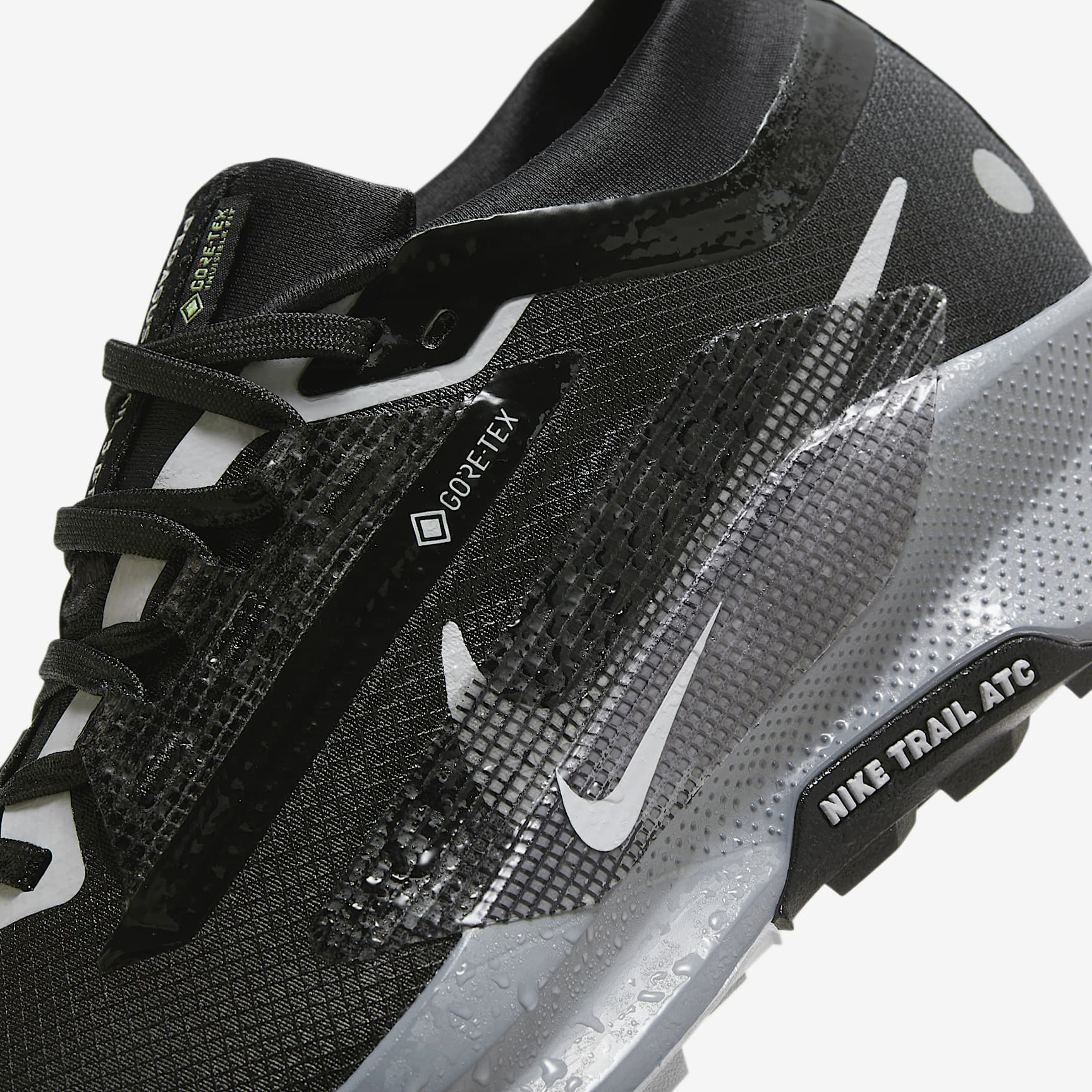 The winterized Pegasus Trail 5 provides wet-weather protection for trail running. A waterproof GORE-TEX upper, an all-terrain outsole and reflective details help you comfortably take on the elements. With a ReactX foam midsole, it gives you responsive cushioning for an energized ride. GORE-TEX Upper Waterproof GORE-TEX upper and 3-D print toe cap help keep water out so your feet stay dry. ReactX Foam ReactX foam midsole gives you lightweight energy return. ATC Outsole Nike Trail ATC outsole is made with an all-terrain compound that’s great even in wet weather. High Ankle Cuff A sturdy, high ankle cuff helps keep debris and trail rubble from entering your shoe. What's New? ReactX foam midsole is 13% more responsive than previous React technology. Product Details * Weight: Approx. 253g/8.9oz (Women's US 8) * Heel-to-toe drop: 9.5mm * Reflective detail on side of heel * Not intended for use as Personal Protective Equipment (PPE)