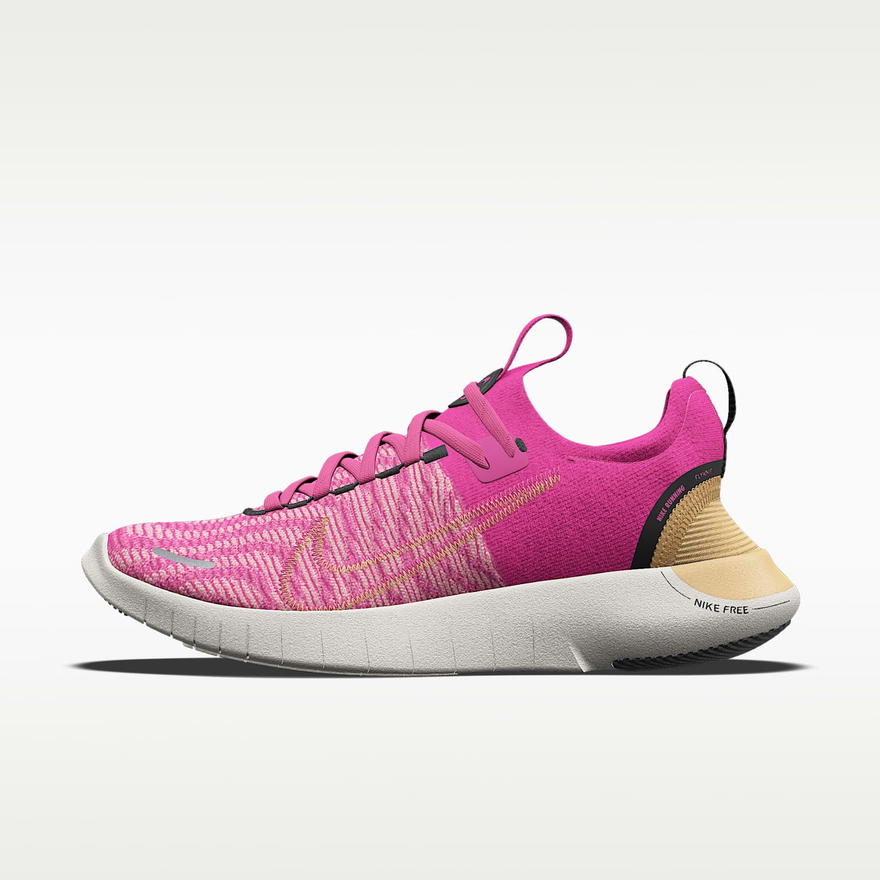 Set your training runs free, and let your design eye out of the cage in the Nike Free RN By You. A full spectrum of colours, plenty of Flyknit colour possibilities and a trio of different lacing choices give you the freedom to make this as quirky as you so decide. Feathery and flexible, its barefoot feel and Flyknit upper will have you free-wheeling with joy, itching for a few more strides. Touch It Up Pick from six different Flyknit colour presets including Fierce Pink and Orewood Brown. Then dabble with the top-and-bottom Swoosh logos, backtabs, overlays and even the nitty-gritty details like the eyestay stitching, side of the heel and the outsole pods. Pick from 16 different colour options for the overlays, including Metallic Red Bronze, gold and silver. Lace Up Choose between reflective design, flat or toggle laces (toggle and flat come in 12 different colour options including Red Stardust). We offer reflective design flat laces in six varying colours. Make It Yours Add a personal touch with your initials or something else unique. It appears on the side of the shoe all in upper case, using 1–2 characters, numbers 0–9 and letters A–Z. Made from Nike Grind The outsole has at least 13% Nike Grind material, made from scraps from the footwear manufacturing process. Lightweight movement Flyknit gives you sock-like comfort with soft, stretchable and breathable fabric that helps keep you feeling light and airy when your run goes into overdrive. Inner sleeve is minimal but stretchy. Soft in the middle An ultra-lightweight midsole offers unreal comfort as your foot repeatedly hits the road. It's lighter, more responsive and softer than previous versions. More benefits * Embroidered eyestays around the laces help keep your feet secure. Pull tabs at the tongue and heel make for an easy one-hand entry. * The laser-cut grooves on the sole make this shoe more flexible compared with the previous iteration. Nike By You Details * This product is not intended for use as Personal Protective Equipment (PPE) * Our Members are one of a kind, and your shoes are too. Each pair is proudly made one at a time, by hand. Good things are worth the wait. * With our 3D builder, watch your creation come alive as you experiment with all kinds of design choices.