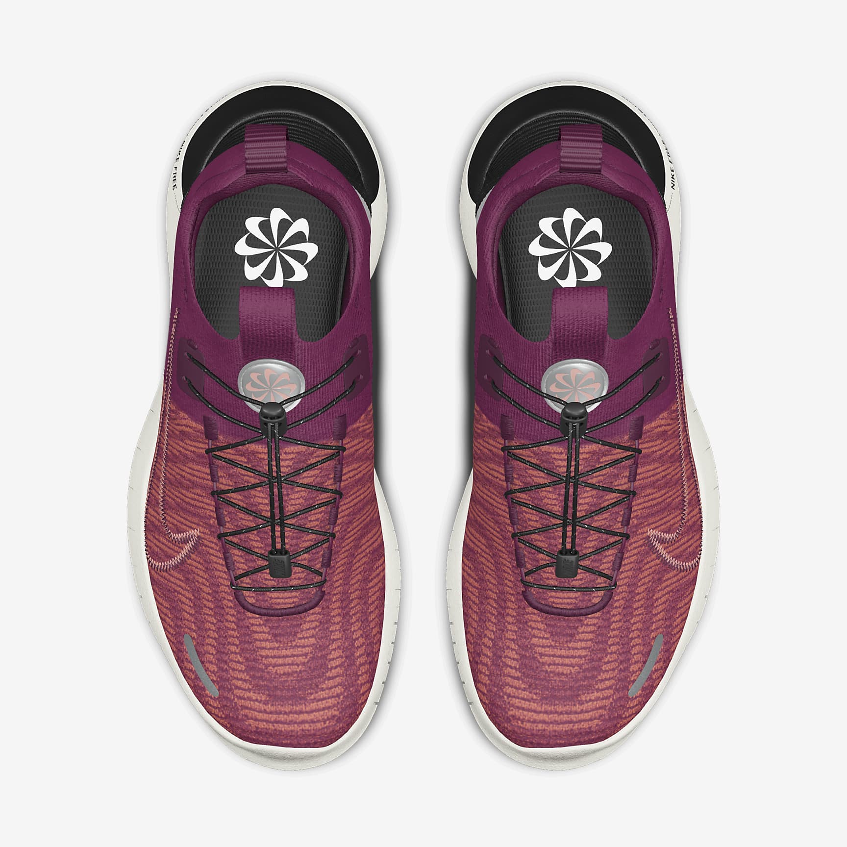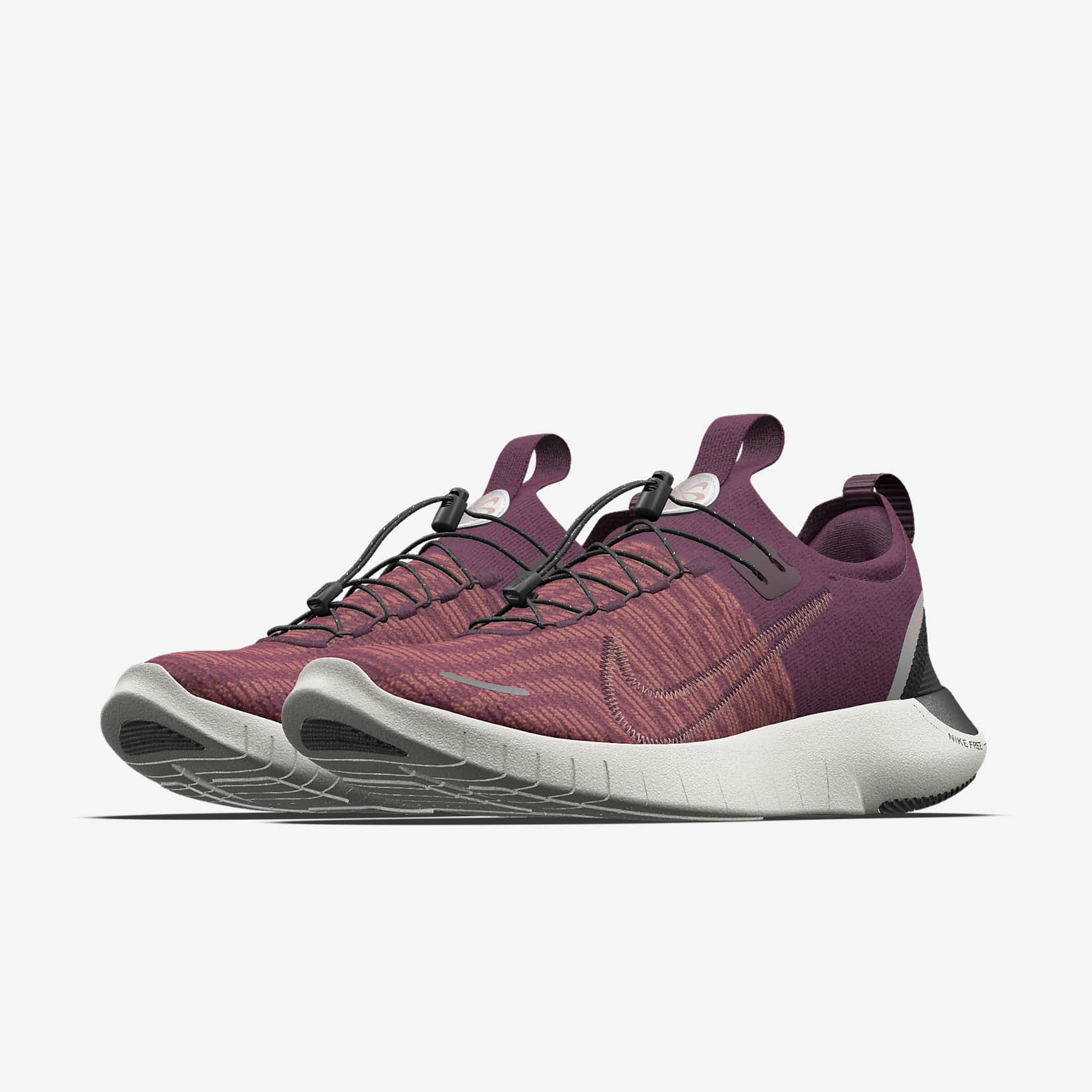 Turn your training runs loose, and let your design eye out of the cage in the Nike Free RN By You. A full spectrum of colors, plenty of Flyknit color possibilities, and a trio of different lacing choices give you the freedom to make this as quirky as you so decide. Feathery and flexible, its barefoot feel and Flyknit upper will have you freewheeling with joy, jonesing for a few more strides. Touch It Up Pick between six different Flyknit color presets including Fierce Pink and Orewood Brown. Then dabble between the top and bottom Swoosh logos, backtabs, overlays and even the nitty-gritty details like the eyestay stitching, side of the heel and outsole pods. Pick between 16 different color options for the overlays, including metallic red bronze, gold and silver. Lace Up Choose between reflective, flat or toggle laces (toggle and flat come in 12 different color options) including red stardust. We offer reflective flat laces in six varying colors. Make It Yours Add a personal touch with your initials or something else unique. It appears on the side of the shoe in all upper case, using 1-2 characters, numbers 0-9 and letters A-Z. Made with Nike Grind The outsole has at least 13% Nike Grind material, made from scraps from the footwear manufacturing process. Lightweight Movement Flyknit gives you sock-like comfort with soft, stretchable and breathable fabric that helps keep you feeling light and airy when your run goes into overdrive. Inner sleeve is minimal but stretchy. Soft in the Middle An ultralightweight midsole offers unreal comfort as your foot repeatedly hits the road. It’s lighter, more responsive and softer than previous versions. More Benefits * Embroidered eyestays around the laces help keep your feet secure. Pull tabs at the tongue and heel make for an easy 1-hand entry. * Laser-cut grooves on the sole make this shoe more flexible compared to the previous iteration. Nike By You Details * This product is not intended for use as Personal Protective Equipment (PPE) * Our members are one of a kind, and your shoes are, too. Each pair is proudly made one at a time, by hand. Good things are worth the wait. * With our 3-D builder, watch your creation come alive as you experiment with all kinds of design choices.