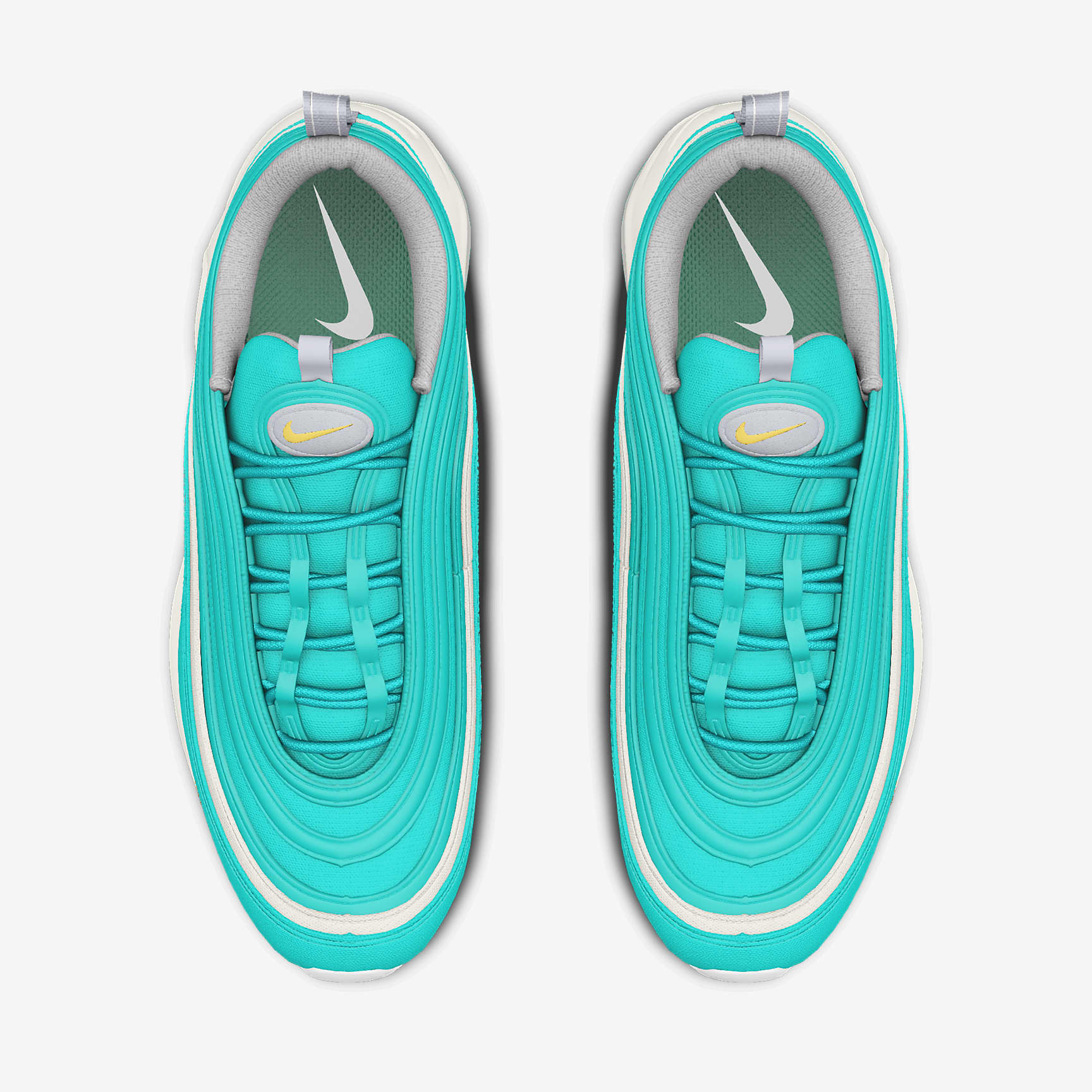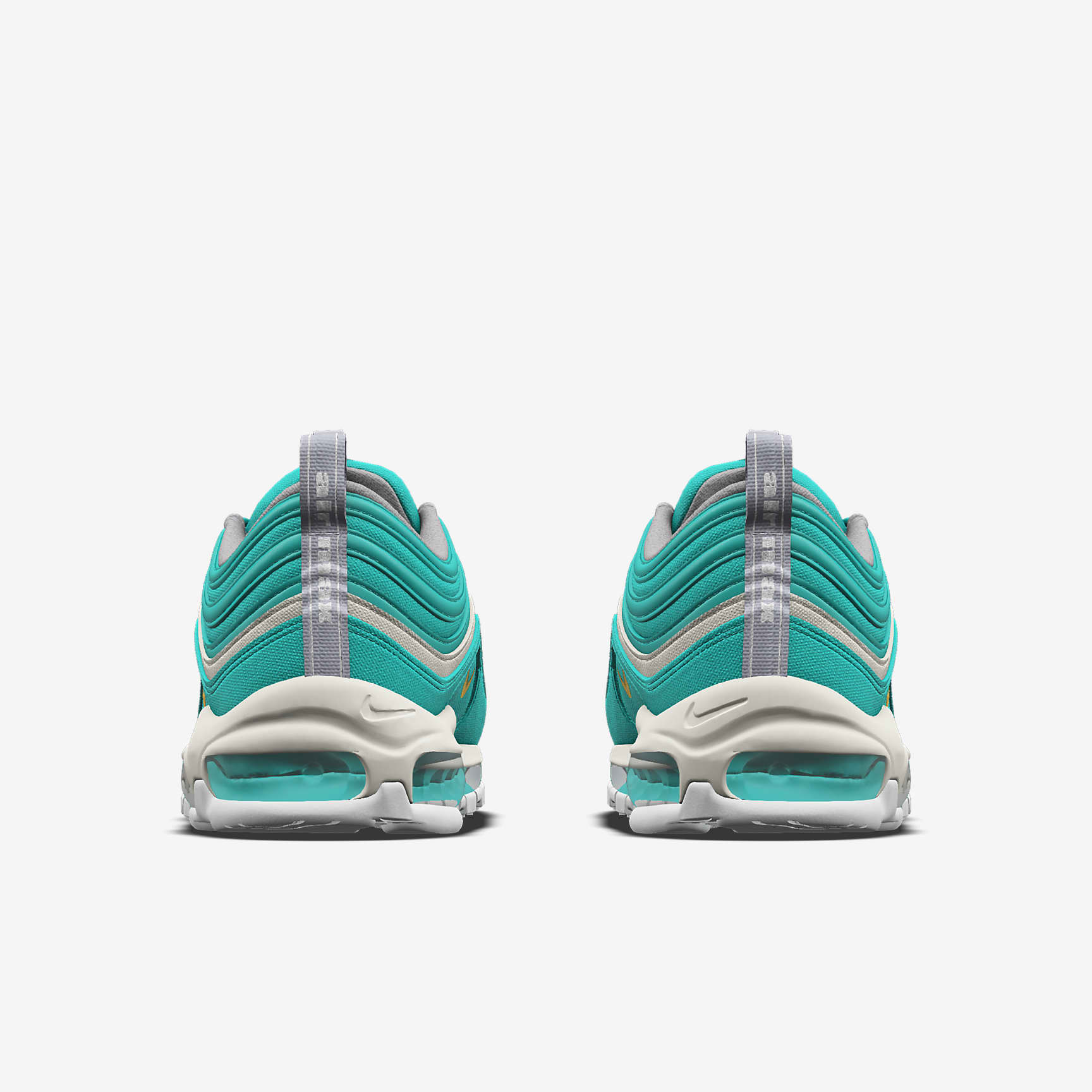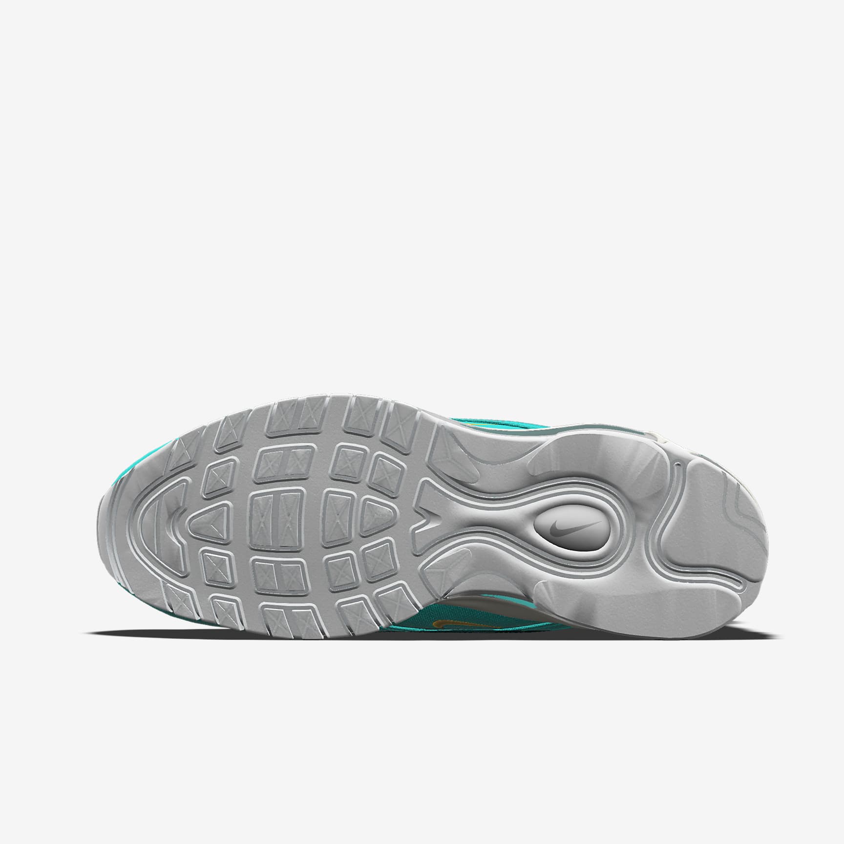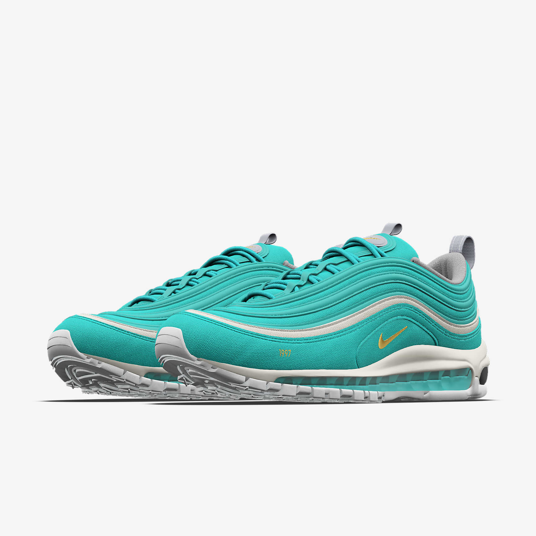 The AM97 was the shapeshifter of its time, and it's your turn to do the same. Customise every part of the shoe from upper materials to the colours of the midsole and Nike Air unit, plus non-slip laces to secure the fit. Then, decide whether you want your outsole solid, tinted or translucent. There's even an option to upgrade your insole for extra cushioning underfoot. Finally, a shoe as multifaceted as you. What's Your Base? Original, canvas or both—mix it up and layer on the texture. Colour-Up Whether you prefer a classic or playful look, choose from 12 colourways to create your dream design. Make It Personal Add up to 8 embroidered characters on the mudguard, or go for a mini Swoosh logo. More Benefits * Originally designed for performance running, full-length Nike Air cushioning pairs best-in-class comfort with sporty style. * Lace eyelets are hidden for a streamlined look. * Foam midsole delivers soft cushioning. * Rubber outsole adds traction and durability. Product Details * Our Members are one of a kind—and your shoes are, too. Each pair is proudly made one at a time, by hand. Good things are worth the wait. * Your initials? A nickname? Or something else that's so you. Get personal with a customisable inscription on your shoes. Plus, your name is on the box. * With our 3D builder, watch your creation come alive as you experiment with all kinds of design choices. Air Max 97 We realise the origin of the Air Max 97 has become something of an urban myth. (Let's set the story straight: it was a water droplet that inspired the ripple design—not high-speed bullet trains.) Still, the influence of the 97 remains undeniable. It was, in essence, a vision of the future. An icon that made other icons possible. Unlike anything that had come before, it revolutionised the sneaker world with full-length Air cushioning and an innovative hidden lacing system. Originally made for performance running, these shoes were quickly adopted as streetwear by high-fashion destinations like Milan and beloved by creatives and artists alike to cement their place in sneaker history.