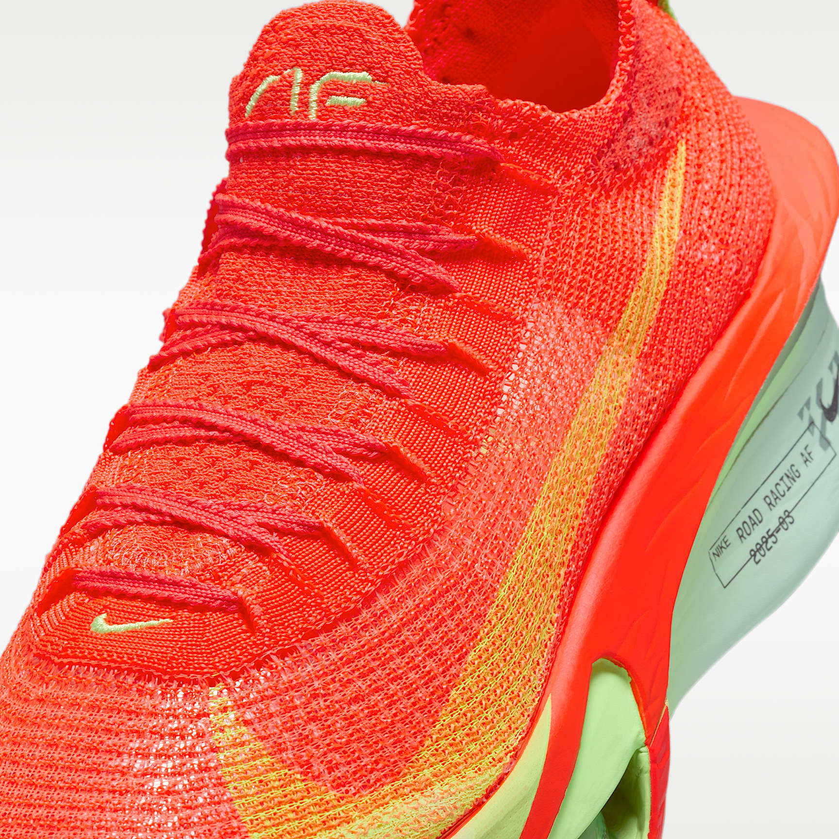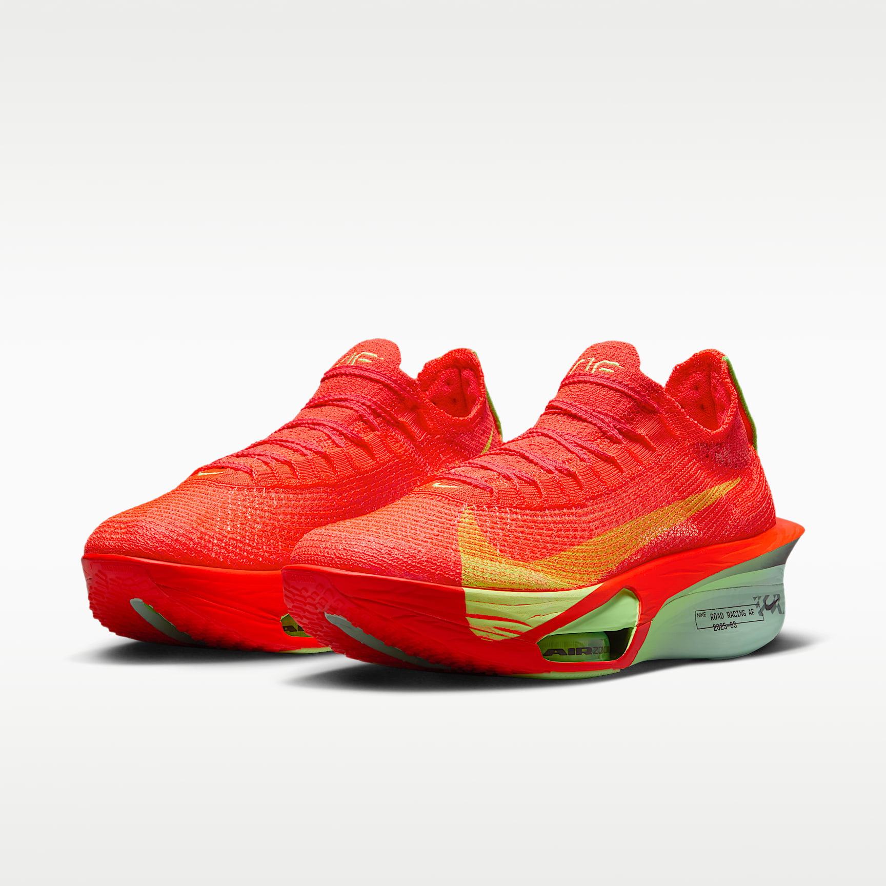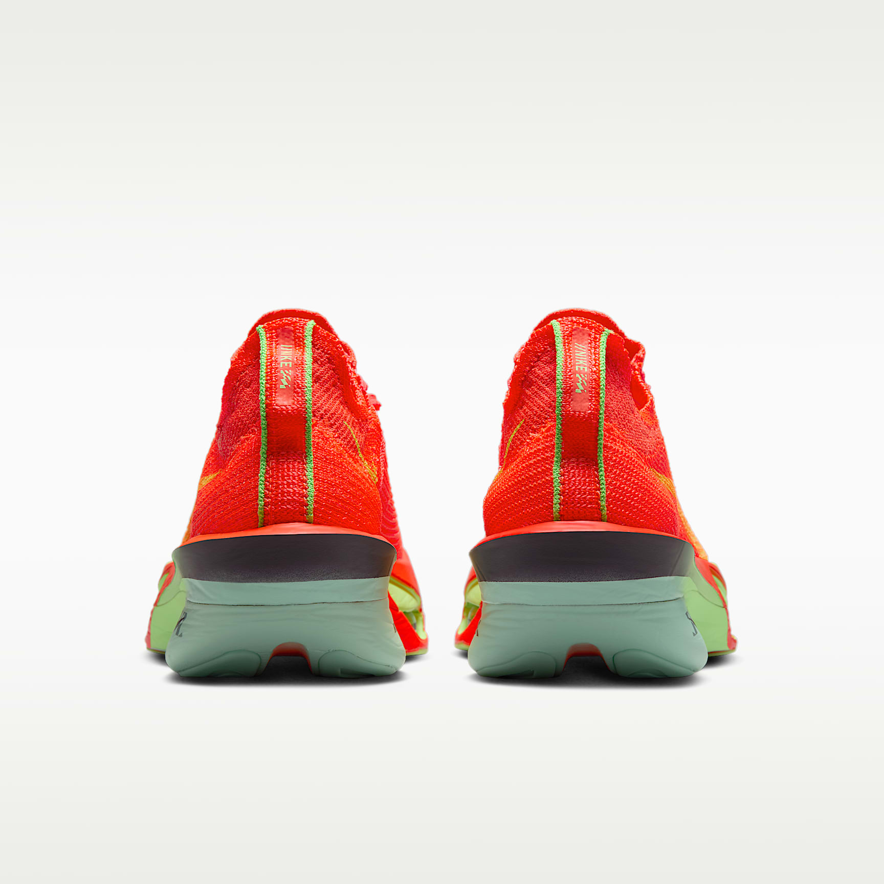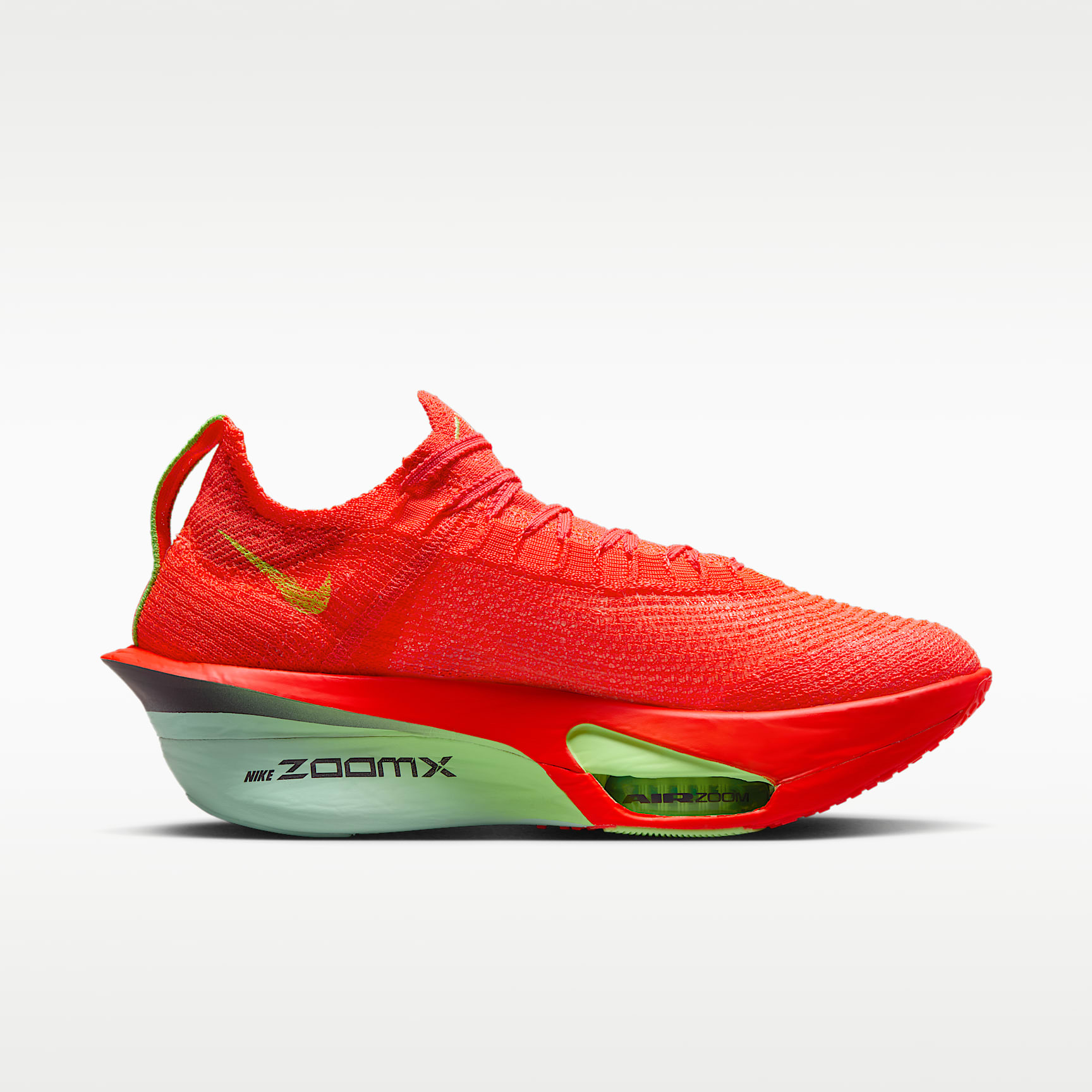 Fine-tuned for marathon speed, the Alphafly 3 helps push you beyond what you thought possible. Three innovative technologies power your run: A double dose of Air Zoom units helps launch you into your next step; a full-length carbon fiber plate helps propel you forward with ease; and a heel-to-toe ZoomX foam midsole helps keep you fresh from start to 26.2. Time to leave your old personal records in the dust. Energy Return for Your Marathon Two forefoot Air Zoom units combine with ZoomX foam to store and return the energy back to you, powering every step. Propulsive Feeling A full-length carbon fiber plate delivers a propulsive sensation that helps you smoothly transition through every stride and tackle turns with confidence. Cushioned Ride Fully connected ZoomX foam creates an ultralight and cushioned feel, helping you stay fresh and comfortable from mile 1 to 26.2. What's New About the Alphafly 3? The Alphafly 3 is our lightest Alphafly ever, featuring a slightly wider carbon fiber plate for increased stability, a fully connected ZoomX foam midsole for smoother transitions, and an all-new Atomknit upper designed for improved multidirectional containment and breathability. More Benefits * Notched laces offer a secure but soft lace-up. * Integrated knit tongue with lofted padding helps alleviate lace pressure. Product Details * Weight: Approx. 174g/6.1oz (Women's US 8) * Heel-to-toe drop: 8mm