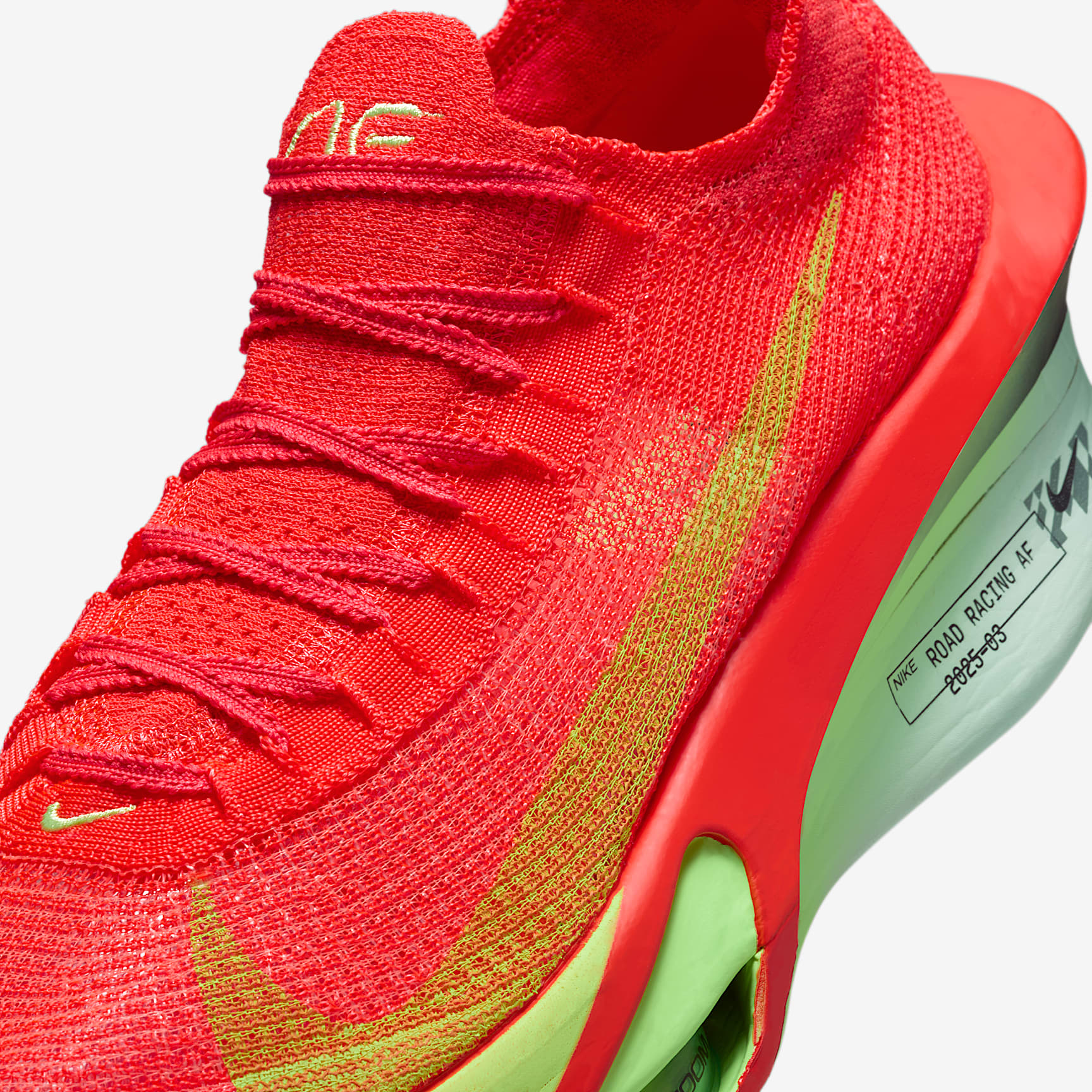 Fine-tuned for marathon speed, the Alphafly 3 helps push you beyond what you thought possible. Three innovative technologies power your run: a double dose of Air Zoom units helps launch you into your next step; a full-length carbon-fibre plate helps propel you forwards with ease; and a heel-to-toe ZoomX foam midsole helps keep you fresh from start to 26.2. Time to leave your old personal records in the dust. Energy return for your marathon Two forefoot Air Zoom units combine with ZoomX foam to store and return the energy back to you, powering every step. Propulsive feeling A full-length carbon-fibre plate delivers a propulsive sensation that helps you smoothly transition through every stride and tackle turns with confidence. Cushioned ride Fully connected ZoomX foam creates an ultralight and cushioned feel, helping you stay fresh and comfortable from mile 1 to 26.2. What's new about the Alphafly 3? The Alphafly 3 is our lightest Alphafly ever, featuring a slightly wider carbon-fibre plate for increased stability, a fully connected ZoomX foam midsole for smoother transitions and an all-new AtomKnit upper designed for improved multi-directional containment and breathability. More benefits * Notched laces offer a secure but soft lace-up. * Integrated knit tongue with lofted padding helps alleviate lace pressure. Product details * Weight: approx. 218g (men's UK 9) * Heel-to-toe drop: 8mm * Not intended for use as personal protective equipment (PPE)