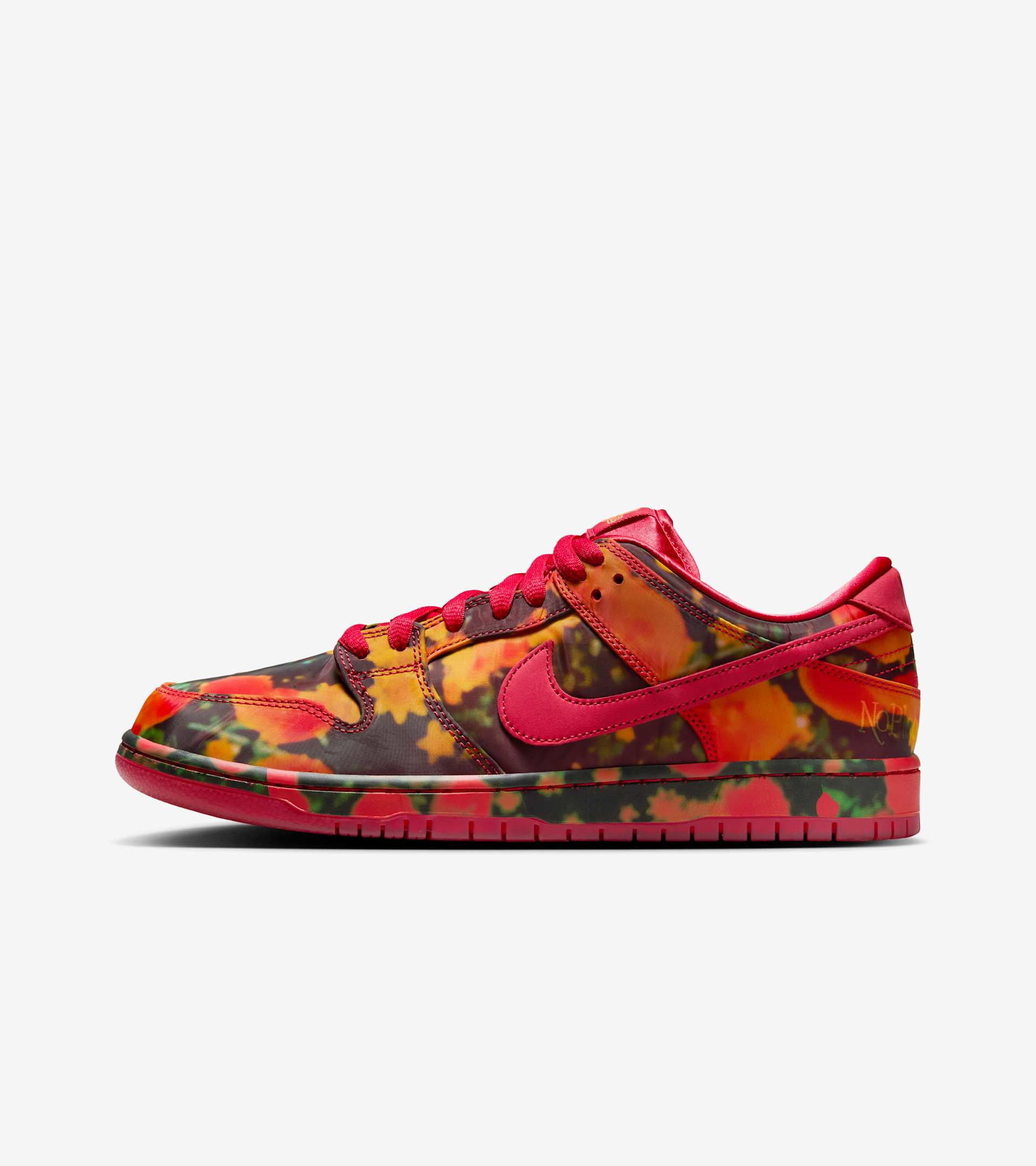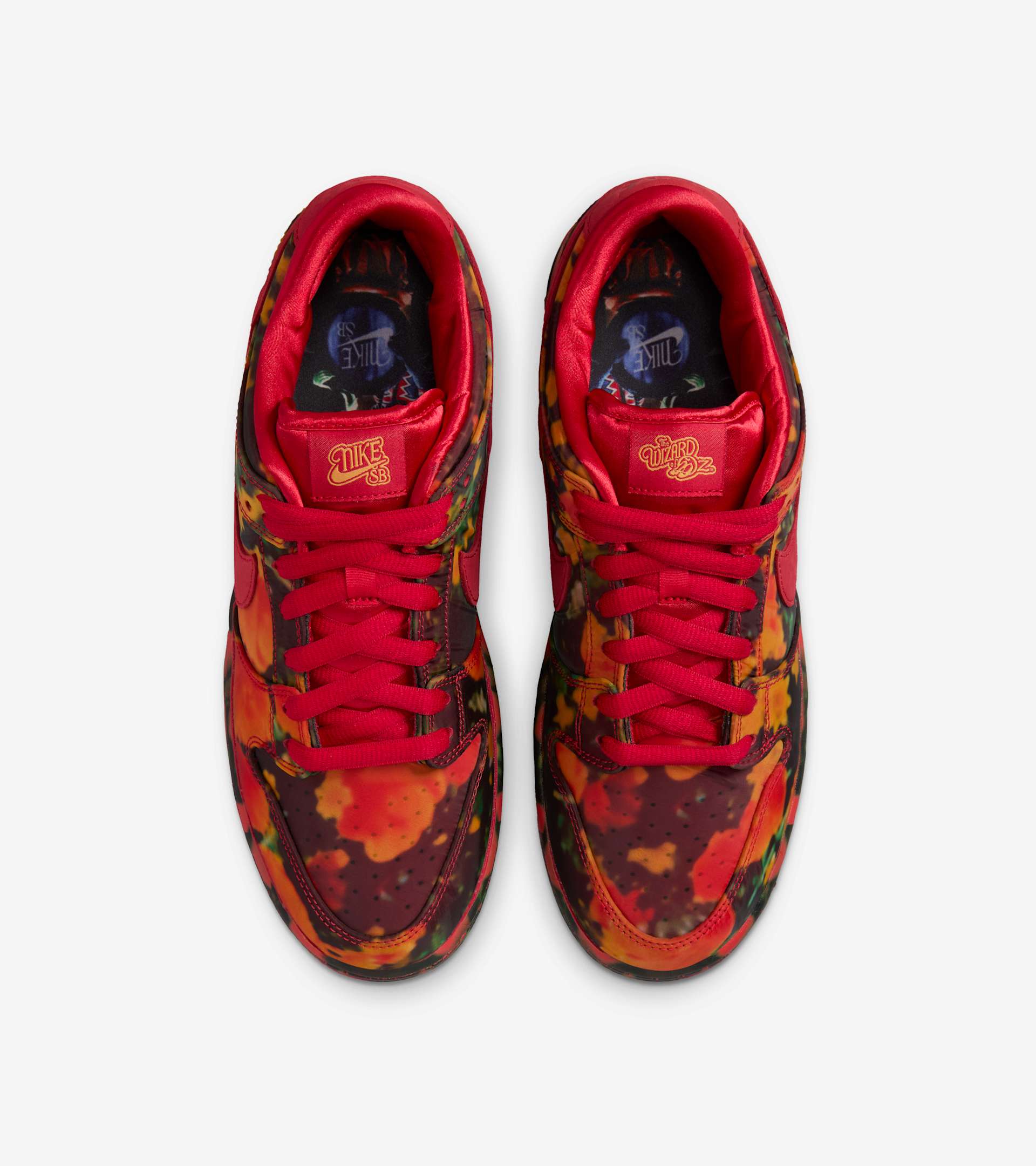 In 1939, a Technicolor tale of a whirling tornado and a ragtag crew’s adventure in the Land of Oz captured the imagination of the world. The Wizard of Oz remains one of the most celebrated musical fantasies in film history. To commemorate a cinematic milestone, Nike SB focuses its lens on the film’s iconic poppy field scene. A unique “hydro dipped” printing technique transforms the Dunk Low Pro into a floral pastiche of allegory and imagination. It revisits Dorothy’s journey with satin finishes, leather Swoosh and backtab and a lush red outsole. Doubling down on nostalgia, this special design comes with two sets of custom removable insoles, each thematically paired with the vibrant poppy aesthetics and smokey special effects of the beloved film. SKU: FZ1291-600