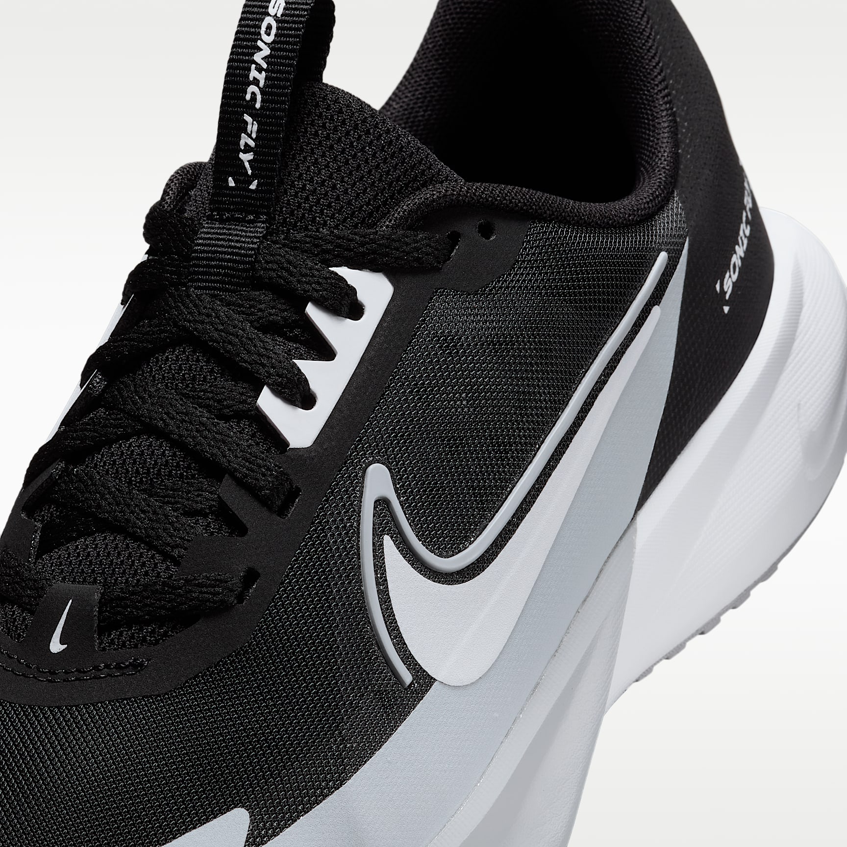 Why run when you can fly? Designed for record-breakers in the making, the Nike Sonic Fly pairs a lightweight design with soft, springy foam that helps add energy to every stride. Responsive cushioning We packed the midsole with soft and springy foam that absorbs impact and adds energy to every stride you take. Lightweight but durable Less weight means more speed. Mesh throughout the upper helps keep these shoes lightweight and breathable. We reinforced the toe and sides for added durability. Support you can feel Bands at the side of your feet work with the laces to add stability and a secure feel. Traction that keeps up The rubber outsole with a Waffle-inspired tread pattern helps provide durable traction. Product details * Classic laces * Pull tab on tongue