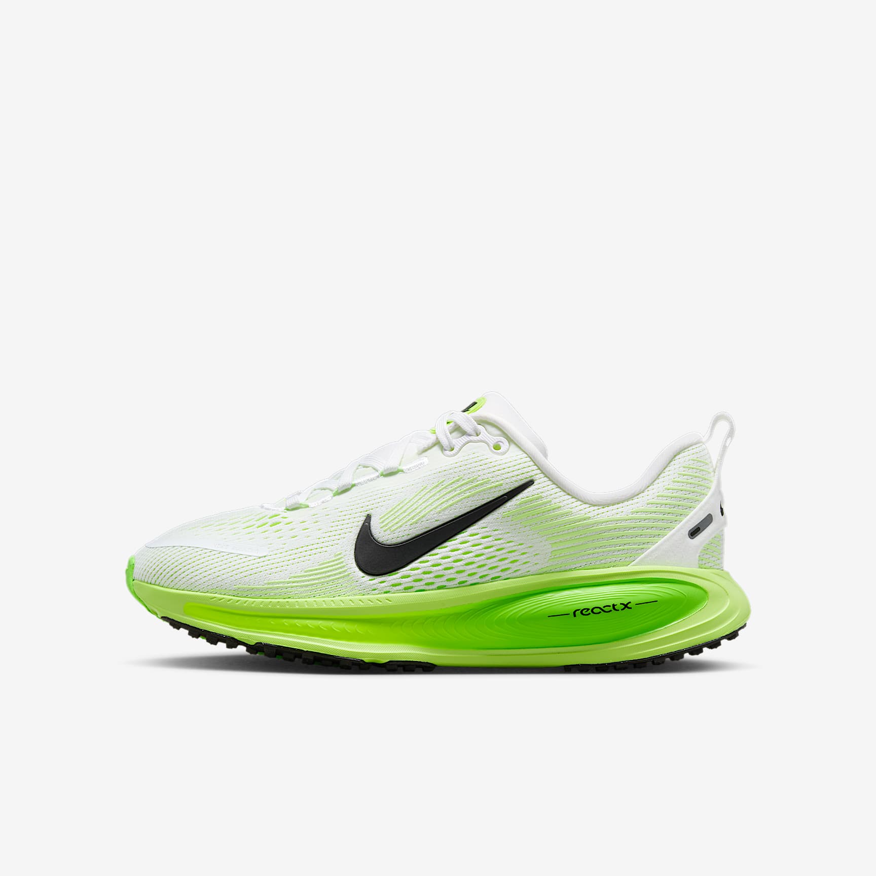 With springy ReactX foam, the Vomero 18 gives you a comfortable, responsive ride for your daily runs. Lightweight textiles on top help your feet breathe, so you stay cool however many miles you log. What's New Responsive ReactX foam in the midsole helps power up your runs with cushioned comfort. Engineered mesh upper Lightweight mesh and airy knit textiles in the upper help add breathability to your runs. Responsive ReactX foam We stacked the midsole with springy ReactX foam to help add energy to your every stride. Podular outsole Nubby pods ring the durable rubber outsole, helping promote smooth heel-to-toe transitions. Plush tongue A plush tongue and lining give you a comfortably snug feel. Product details * Classic laces * Pull tab on heel * Reflective design details * Weight: 227.1g (approx.) * Last: NK008 * Not intended for use as personal protective equipment (PPE)