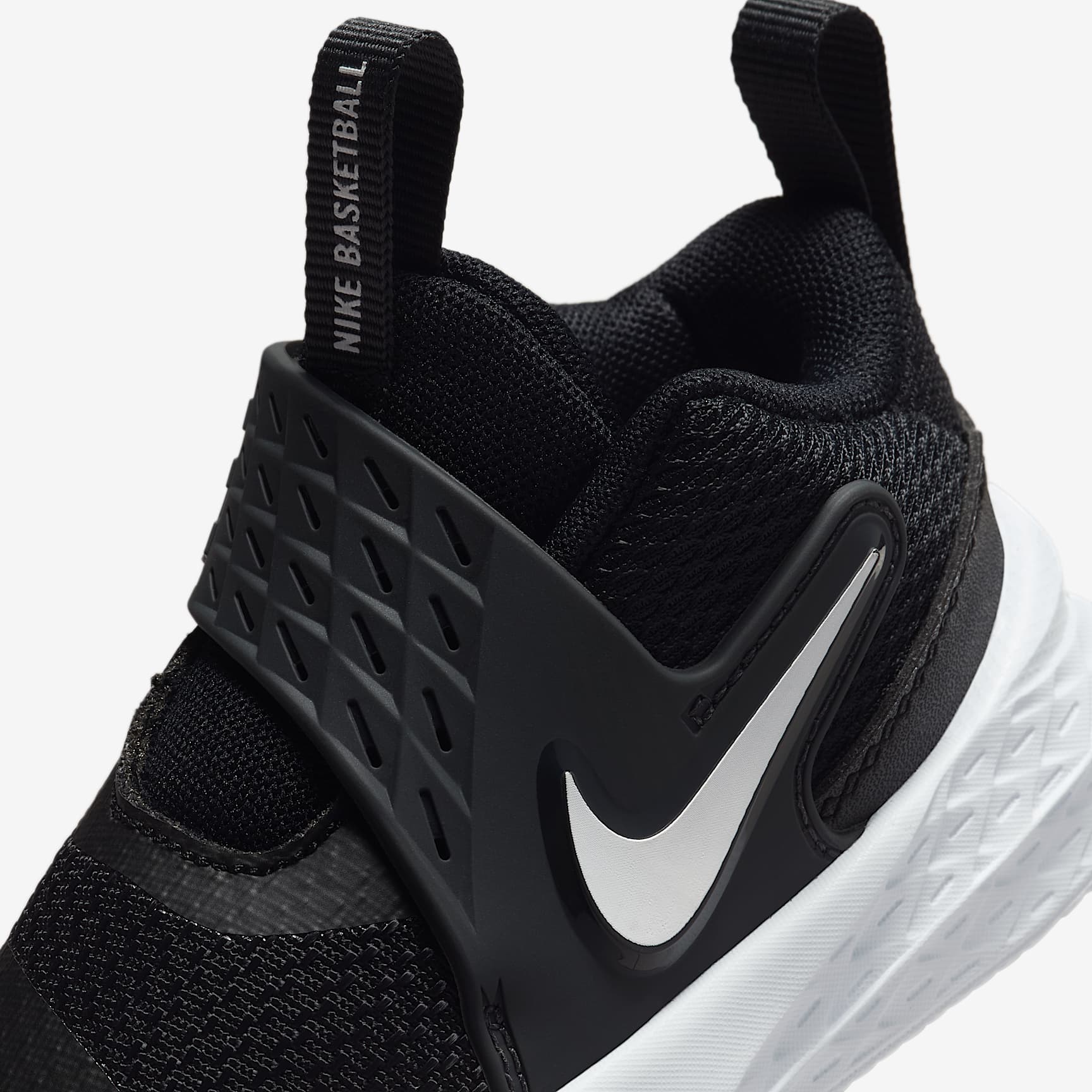 This Nike Team Hustle D is made for future hoopers. A strap closure system makes it easy to secure their fit fast. Underfoot, soft foam gives kids the cushioning they need to find their footing. Easy to secure A wide opening, oversized pull tabs and a hook-and-loop strap help make it easy to slip these on little feet. Early steps The sturdy foam outsole helps provide the flexibility and traction little feet need as they find their footing. Stay cool Breathable mesh in the upper helps keep little feet from overheating.