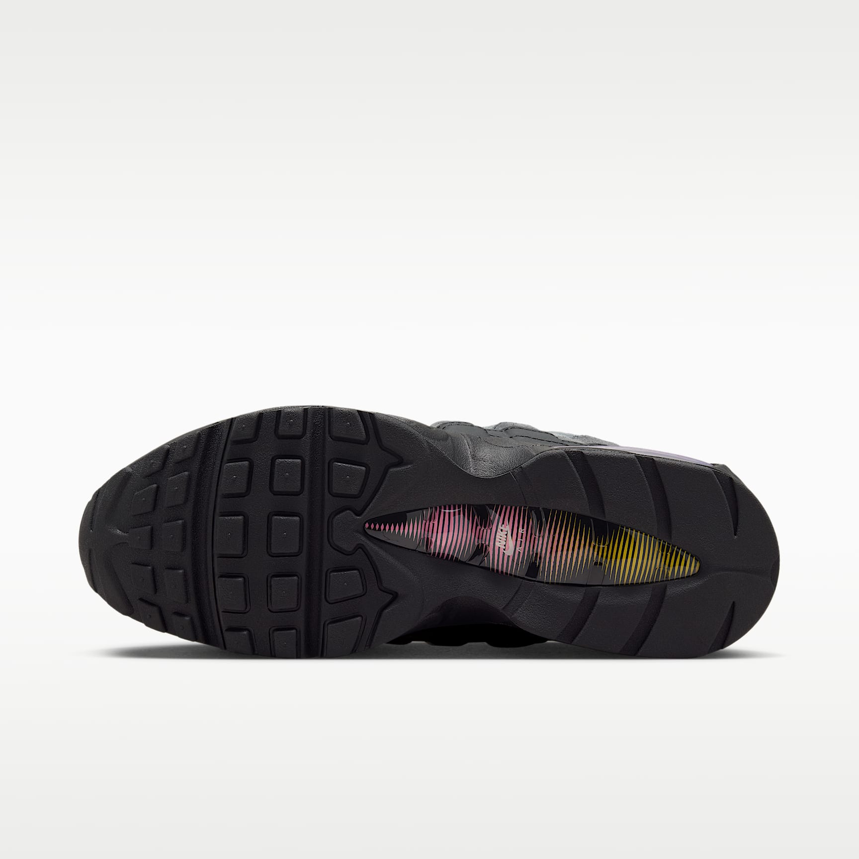 Taking inspiration from the human body and '90s track aesthetics, the Air Max 95 mixes unbelievable comfort with fast-paced style. The wavy side panels add natural flow to any outfit, while visible cushioning in the heel and forefoot delivers unbelievable comfort. Benefits * The upper combines real and synthetic leather with airy textiles for a layered look built to last. * The visible Max Air cushioning provides lightweight cushioning. * Flex grooves in the midsole/outsole let you move freely. * Inspired by the human anatomy, the midsole/outsole represent the spine, upper panels are the muscles and the laces are the shoe's ribs. Product details * Foam midsole * Rubber outsole * Not intended for use as personal protective equipment (PPE) Air Max 95 There are layers to the Air Max 95. Sporting a grooved design, these were the first Nike shoes to don a forefoot Air unit. And debuting with a black sole, unheard of at the time, these kicks looked fresh wherever you went.