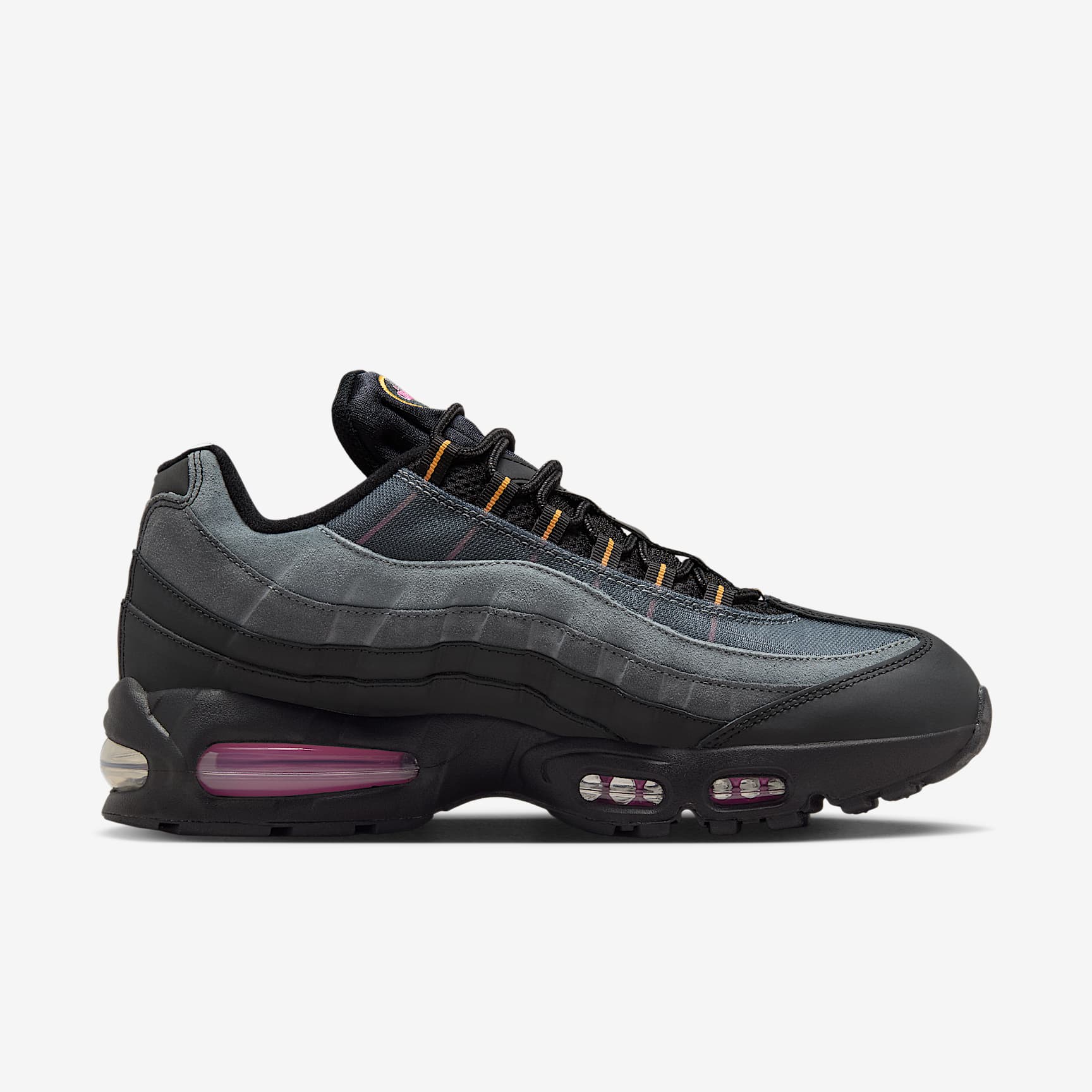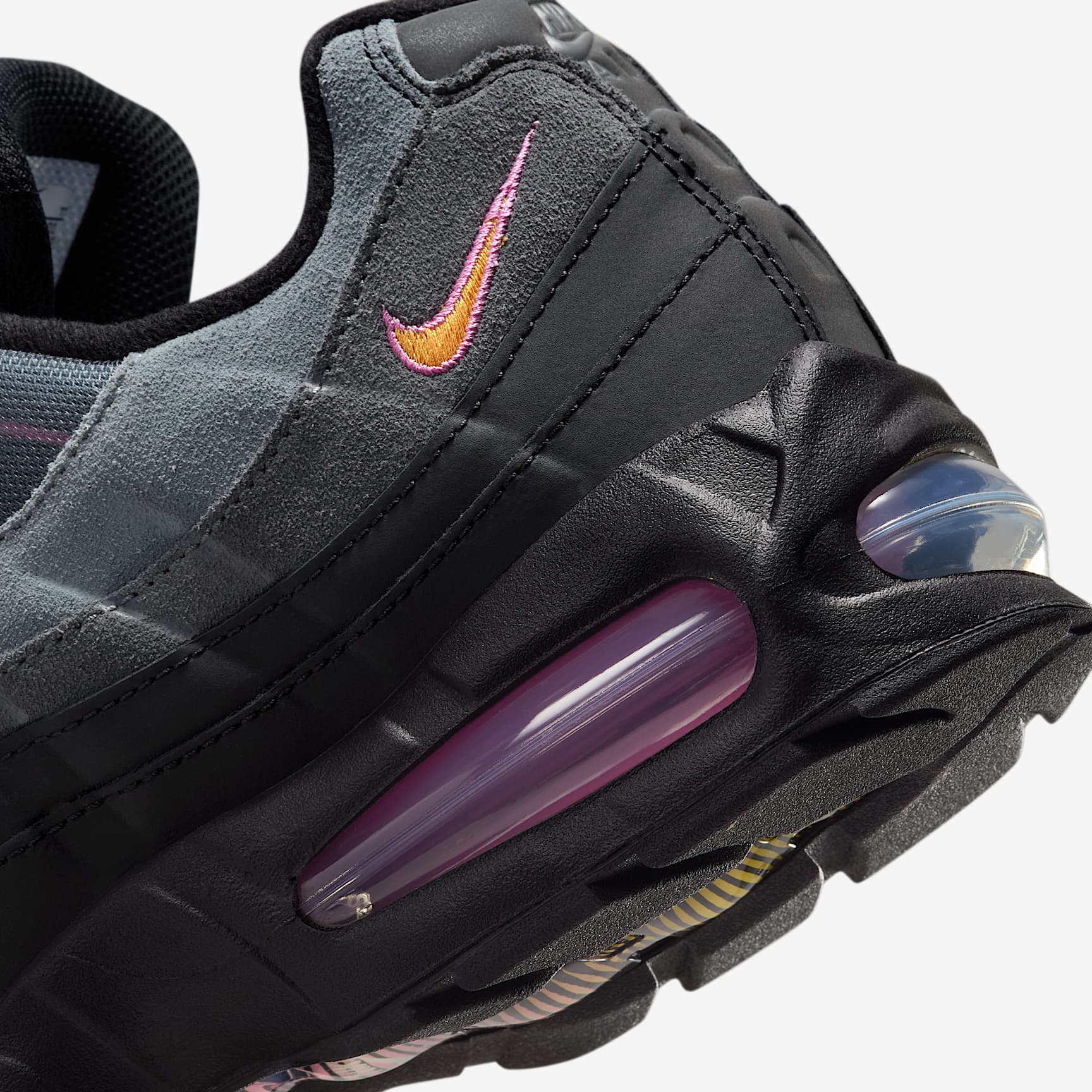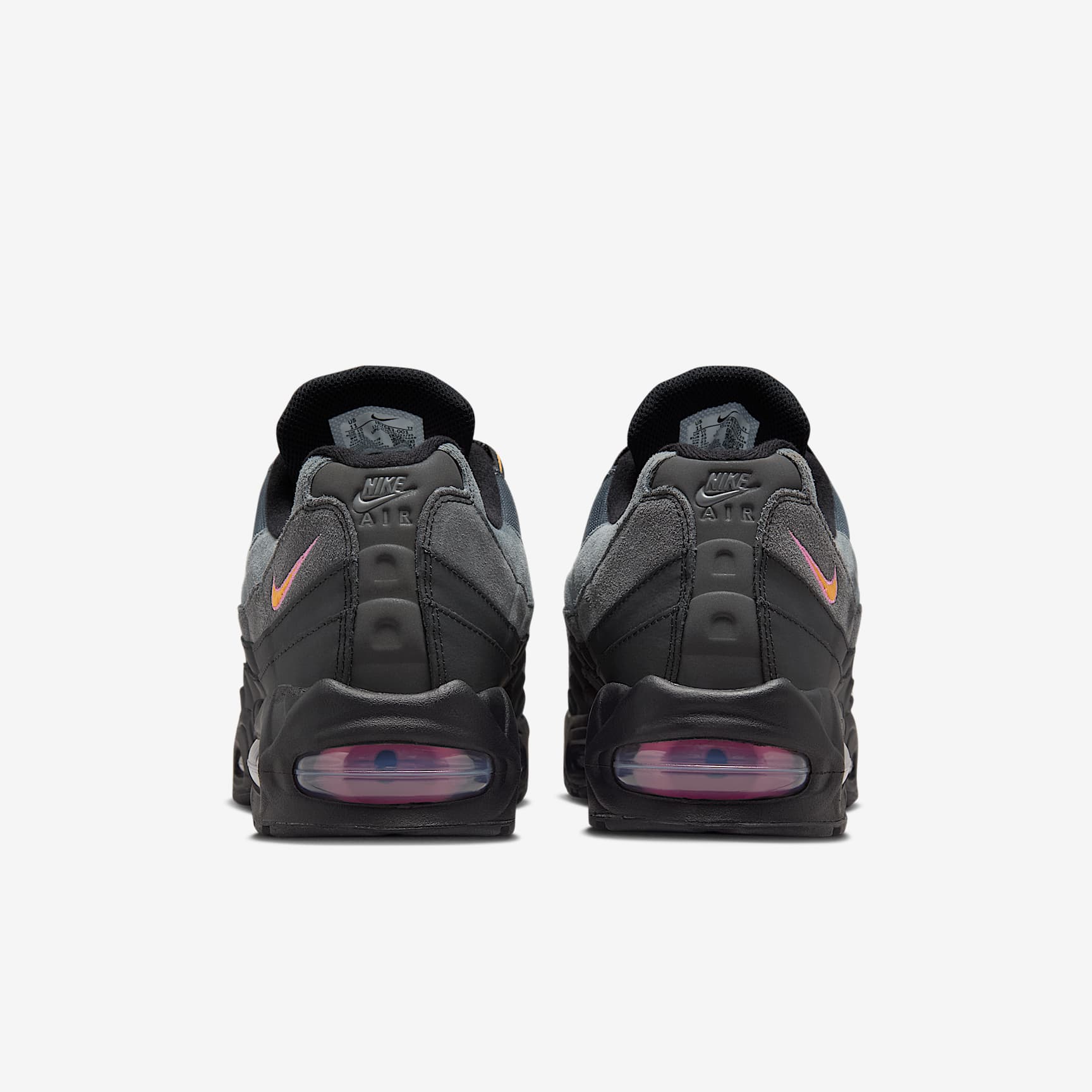 Taking inspiration from the human body and '90s track aesthetics, the Air Max 95 mixes unbelievable comfort with fast-paced style. The wavy side panels add natural flow to any outfit, while visible cushioning in the heel and forefoot delivers unbelievable comfort. Benefits * The upper combines real and synthetic leather with airy textiles for a layered look built to last. * The visible Max Air cushioning provides lightweight cushioning. * Flex grooves in the midsole/outsole let you move freely. * Inspired by the human anatomy, the midsole/outsole represent the spine, upper panels are the muscles and the laces are the shoe's ribs. Product details * Foam midsole * Rubber outsole * Not intended for use as personal protective equipment (PPE) Air Max 95 There are layers to the Air Max 95. Sporting a grooved design, these were the first Nike shoes to don a forefoot Air unit. And debuting with a black sole, unheard of at the time, these kicks looked fresh wherever you went.