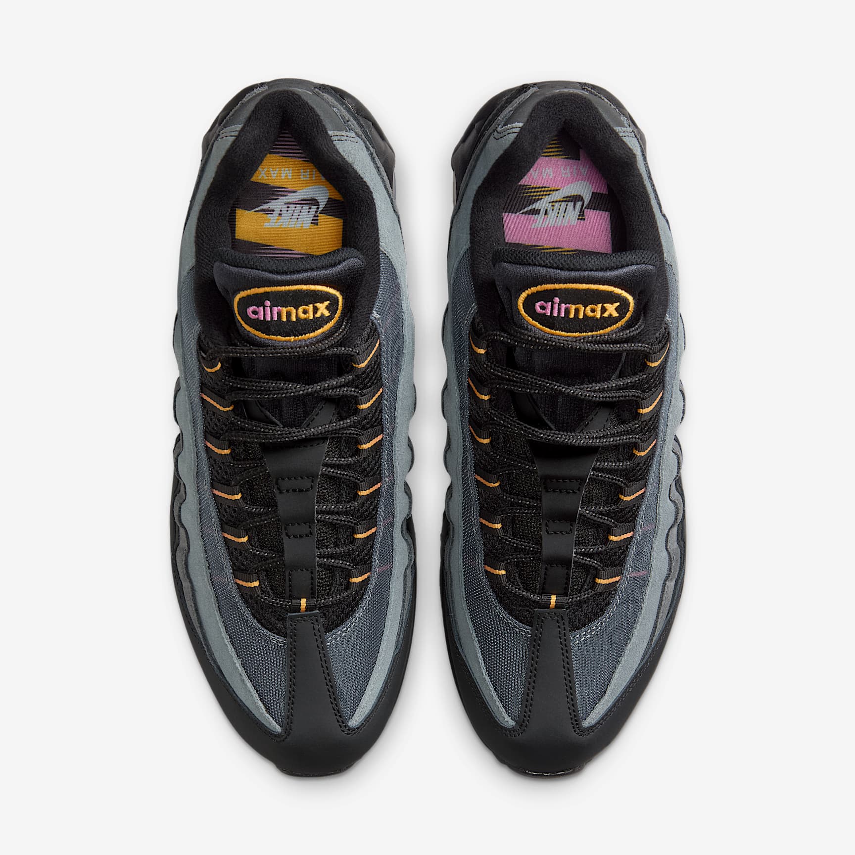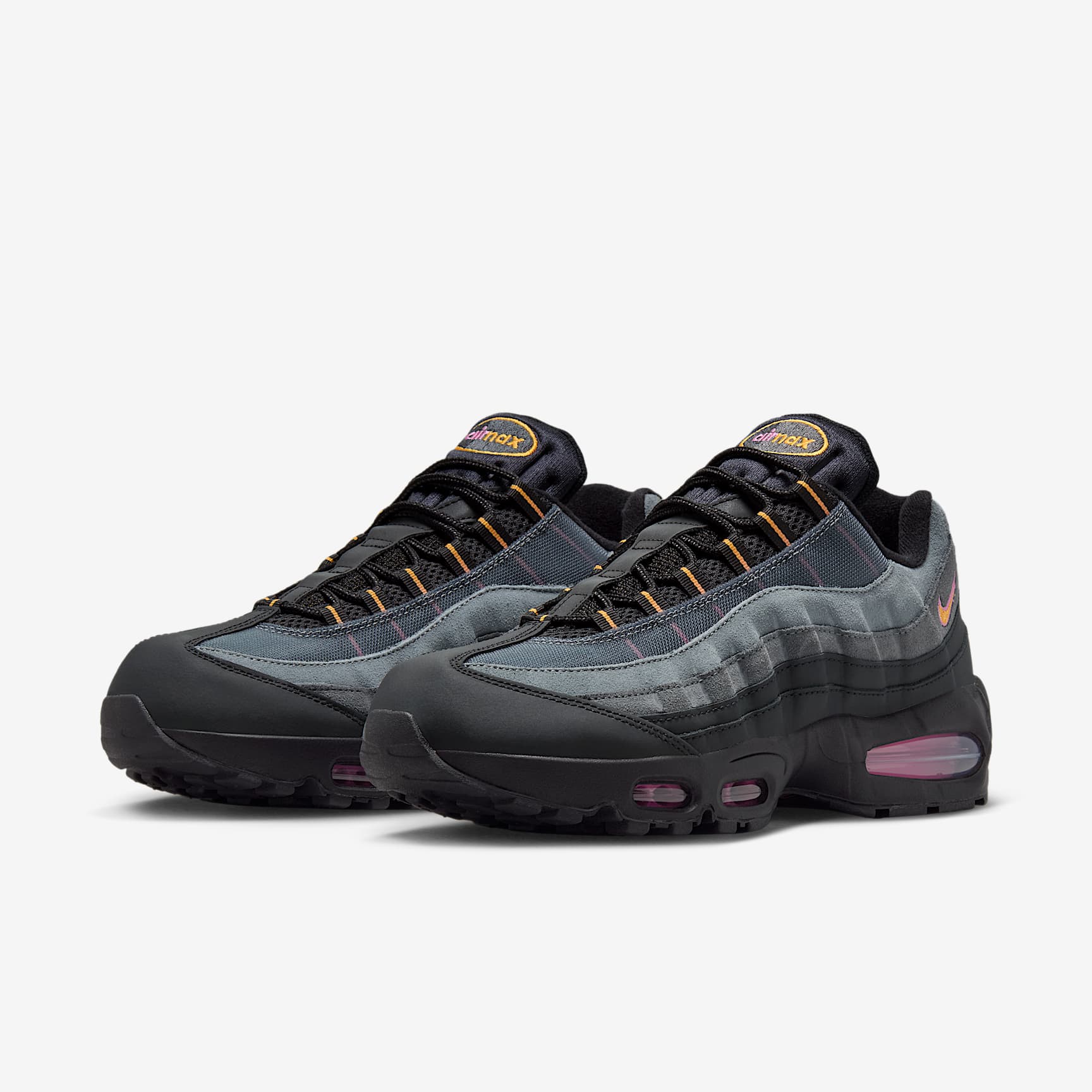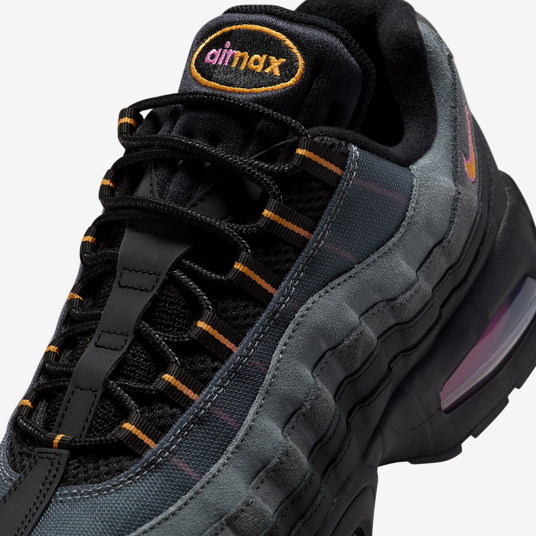 Taking inspiration from the human body and '90s track aesthetics, the Air Max 95 mixes unbelievable comfort with fast-paced style. The wavy side panels add natural flow to any outfit, while visible cushioning in the heel and forefoot delivers unbelievable comfort. Benefits * The upper combines real and synthetic leather with airy textiles for a layered look built to last. * The visible Max Air cushioning provides lightweight cushioning. * Flex grooves in the midsole/outsole let you move freely. * Inspired by the human anatomy, the midsole/outsole represent the spine, upper panels are the muscles and the laces are the shoe's ribs. Product details * Foam midsole * Rubber outsole * Not intended for use as personal protective equipment (PPE) Air Max 95 There are layers to the Air Max 95. Sporting a grooved design, these were the first Nike shoes to don a forefoot Air unit. And debuting with a black sole, unheard of at the time, these kicks looked fresh wherever you went.