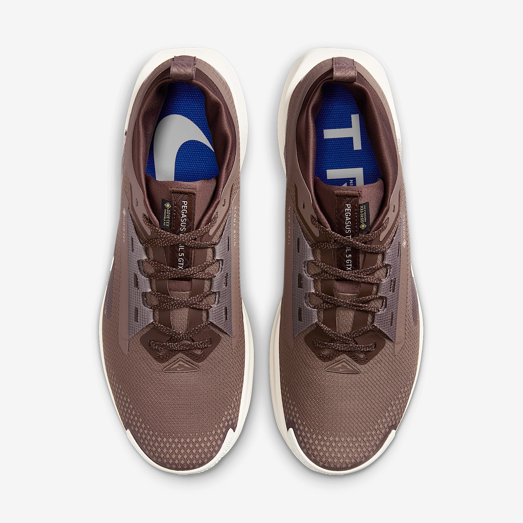 GORE-TEX tech and a grippy outsole provide wet-weather protection. The Pegasus Trail 5 provides wet-weather protection for trail running. A waterproof GORE-TEX upper, an all-terrain outsole and reflective design details help you comfortably take on the elements. With a ReactX foam midsole, it gives you responsive cushioning for an energised ride. GORE-TEX upper A waterproof GORE-TEX upper and 3D-print toe cap help keep water out so your feet stay dry. Responsive ride Springy ReactX foam midsole gives you lightweight energy return. It's 13% more responsive than previous React technology. ATC outsole Nike Trail All-Terrain Compound (ATC) rubber outsole provides enhanced grip on the steep inclines and in wet weather, while giving you a smooth ride on the road. What's new? * A ReactX foam midsole * Nike Trail ATC outsole Product details * Weight: approx. 300g (men's size 9) * Heel-to-toe drop: 9.5mm * Reflective design details on the sides of the heel * Not intended for use as personal protective equipment (PPE)