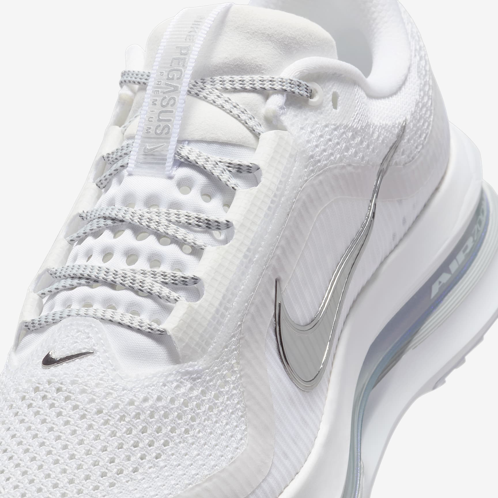 The Pegasus Premium supercharges responsive cushioning with a triple stack of our most powerful running technologies: ZoomX foam, a sculpted Air Zoom unit and ReactX foam. It’s the most responsive Pegasus ever, providing high energy return unlike any other. With a lighter-than-air upper, it decreases weight and increases breathability so you can fly faster. Engineered Mesh on Upper Breathable, lightweight engineered mesh helps keep you contained. ZoomX Foam Your foot sits on top of full-length ZoomX foam, Nike’s most responsive foam. It delivers incredible energy return with each stride. Full-Length Air Zoom Cushioning The full-length Air Zoom unit offers our optimal level of springiness underfoot, unlocking a level of speed and responsiveness that’ll put pep in your miles. ReactX Foam Foundation ReactX foam, 13% more responsive than previous React technology, sits at the bottom of the ZoomX foam and Air Zoom cushioning. It offers a smooth and balanced ride. Modified Waffle Outsole Modified waffle outsole has high-abrasion rubber to provide traction. Product Details * Weight: Approx. 275g/9.7oz (Women's US 8) * Heel-to-toe drop: 10mm * Not intended for use as Personal Protective Equipment (PPE)