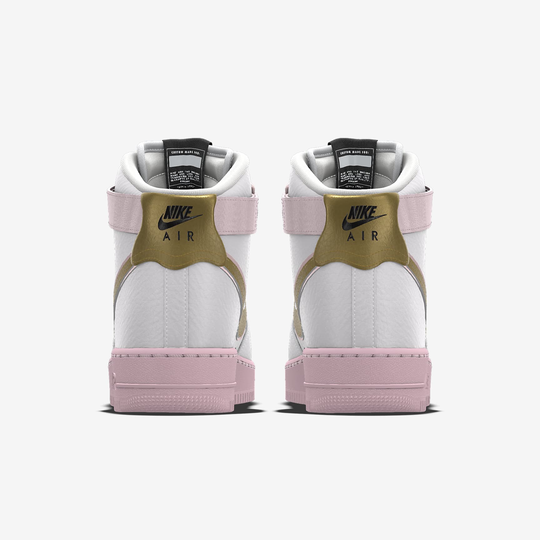 These AF1s are all about the details. Customize your label, laces and dubrae, and don't forget to leave your mark with personal text on the backtab. Between 8 color choices and additional translucent and gum rubber options for the sole, this design is destined to be one of a kind—just like you. What's Your Base? Start with the leather upper, then choose between traditional, translucent and gum rubber for the midsole and outsole. Color Up Clean neutrals, luxe metallics, sporty classics or all of the above. What will you create? Express Yourself Your initials? A nickname? Or something else that's so you. Get personal with up to 9 characters on the strap. Plus, your name is on the box. More Benefits * From tough stitching to pristine materials to the cupsole design, it delivers durable style that’s smoother than backboard glass. * Originally designed for performance hoops, the Air cushioning provides lasting comfort. * Rubber outsole with heritage hoops pivot circles adds traction and durability. Product Details * Our members are one of a kind, and your shoes are, too. Each pair is proudly made one at a time, by hand. Good things are worth the wait. * With our 3-D builder, watch your creation come alive as you experiment with all kinds of design choices. Air Force 1 Debuting in 1982 as a basketball must-have, the Air Force 1 came into its own in the 90s. The clean look of the classic white-on-white AF1 was endorsed from the basketball courts to the block and beyond. Finding its rhythm in hip-hop culture, releasing limited collabs and colorways, Air Force 1 became an iconic sneaker around the globe. And with over 2000 iterations of this staple, its impact on fashion, music and sneaker culture can’t be denied.