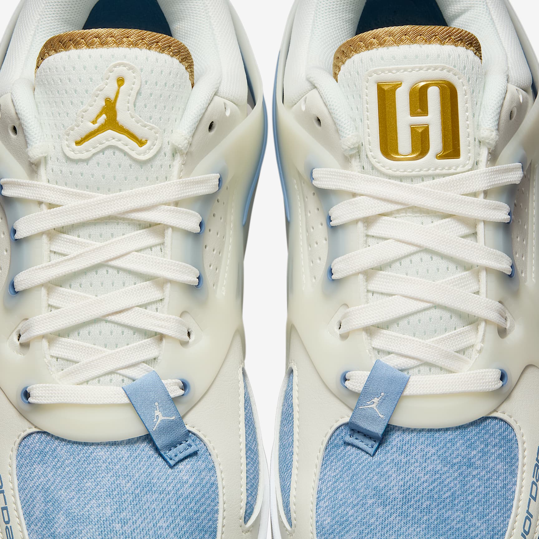 Denim and gold. We're celebrating two iconic wardrobe staples with this Jordan Heir Series colourway. Of course, great style has got to be paired with court-ready tech. A drop-in midsole gives you extra mobility and an external cage adds stability. Talk about perfect pairings. Contouring cage A built-in cage system contours to your foot to help give you the supportive fit you need when cutting across the court. Drop in and work A drop-in Cushlon 3.0 foam midsole puts lightweight and responsive cushioning directly underfoot, helping with on-court mobility. It's also why the Heir is lower to the ground than any other performance basketball shoe in our collection. Get a grip Rubber outsole with herringbone tread pattern helps give you the sticky traction you need to stop in an instant and shift directions. More benefits * Lightweight textiles in the upper help keep things breathable and comfortable. * Synthetic leather in the upper helps add durability. Product details * Pull tab on heel * Rubber outsole