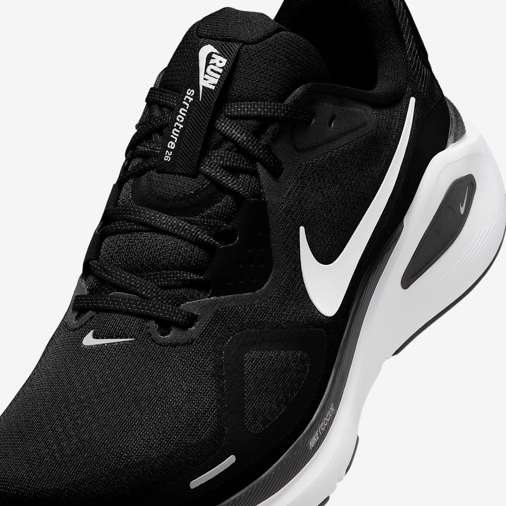 Full-length foam plus arch support equals our most steady ride. The supportive cushioning in the Structure 26 provides steadiness for everyday runs. A full-length ReactX midsole delivers a cushioned yet stable transition from heel to toe-off. Plus, a tried-and-tested midfoot support system wraps around your arch and heel to provide a firm platform. Plush upper The plush collar and tongue, along with the engineered mesh upper, provide comfort, support and an improved fit. Midfoot Support Our midfoot support system helps to slow the rate of ankle eversion and provides a stable platform for transition and toe-off. ReactX foam The full-length ReactX midsole delivers cushion, comfort and increased energy return. It's 13% more responsive than previous React technology. What's new? * With ReactX foam underfoot and a higher stack height for stability and support * Lighter, more flexible rubber in the forefoot of the outsole for cushioning * High-abrasion rubber in the heel for increased durability Product details * Weight: 321g approx. (men's size 9) * Heel-to-toe drop: 10mm * Reflective design details * Not intended for use as personal protective equipment (PPE)
