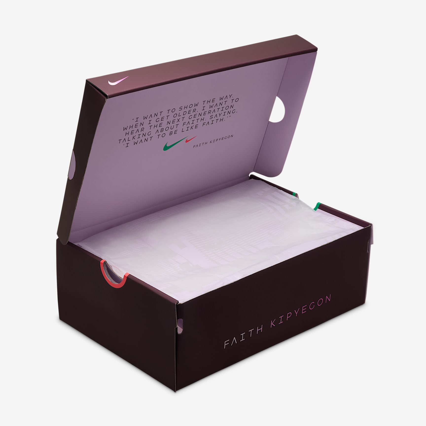 Faith Kipyegon’s journey has redefined greatness, from running barefoot in Kenya to becoming a globally recognized middle-distance runner and world-record holder. This collection celebrates her journey and empowers runners worldwide to redefine what greatness looks like. This special Alphafly 3 reflects Faith’s unparalleled speed, her Kenyan heritage and her personal life as both a mother and a world-class athlete, blending cutting-edge performance innovations with meaningful storytelling. Mother. Runner. Champion. Faith’s status in each realm is represented throughout. Blurred, radiating movement graphics on the lace tips and tissue paper symbolize Faith’s record-smashing speed. On the box, a larger green Swoosh logo represents motherhood while the smaller red Swoosh logo honors her daughter. The colors can also be seen on her custom bracelet, which also pay homage to Kenya and her love of country. From Humble Beginnings to "Fastest Known" The sockliners are embedded with a graphic of Faith’s bare feet as a nod to the humble beginnings that helped mold her into the great she is today. Her initials double as her goal to be “Fastest Known.” Energy Return for Your Marathon Two forefoot Air Zoom units combine with ZoomX foam to store and return the energy back to you, powering every step. Propulsive Feeling A full-length carbon fiber plate delivers a propulsive sensation that helps you smoothly transition through every stride and tackle turns with confidence. Cushioned Ride Fully connected ZoomX foam creates an ultralight and cushioned feel, helping you stay fresh and comfortable from mile 1 to 26.2. What's New About the Alphafly 3? The Alphafly 3 is our lightest Alphafly ever, featuring a slightly wider carbon fiber plate for increased stability, a fully connected ZoomX foam midsole for smoother transitions and an all-new Atomknit upper designed for improved multidirectional containment and breathability. More Benefits * Notched laces offer a secure but soft lace-up. * Integrated knit tongue with lofted padding helps alleviate lace pressure. Product Details * Weight: Approx. 174g/6.1oz (Women's US 8) * Heel-to-toe drop: 8mm