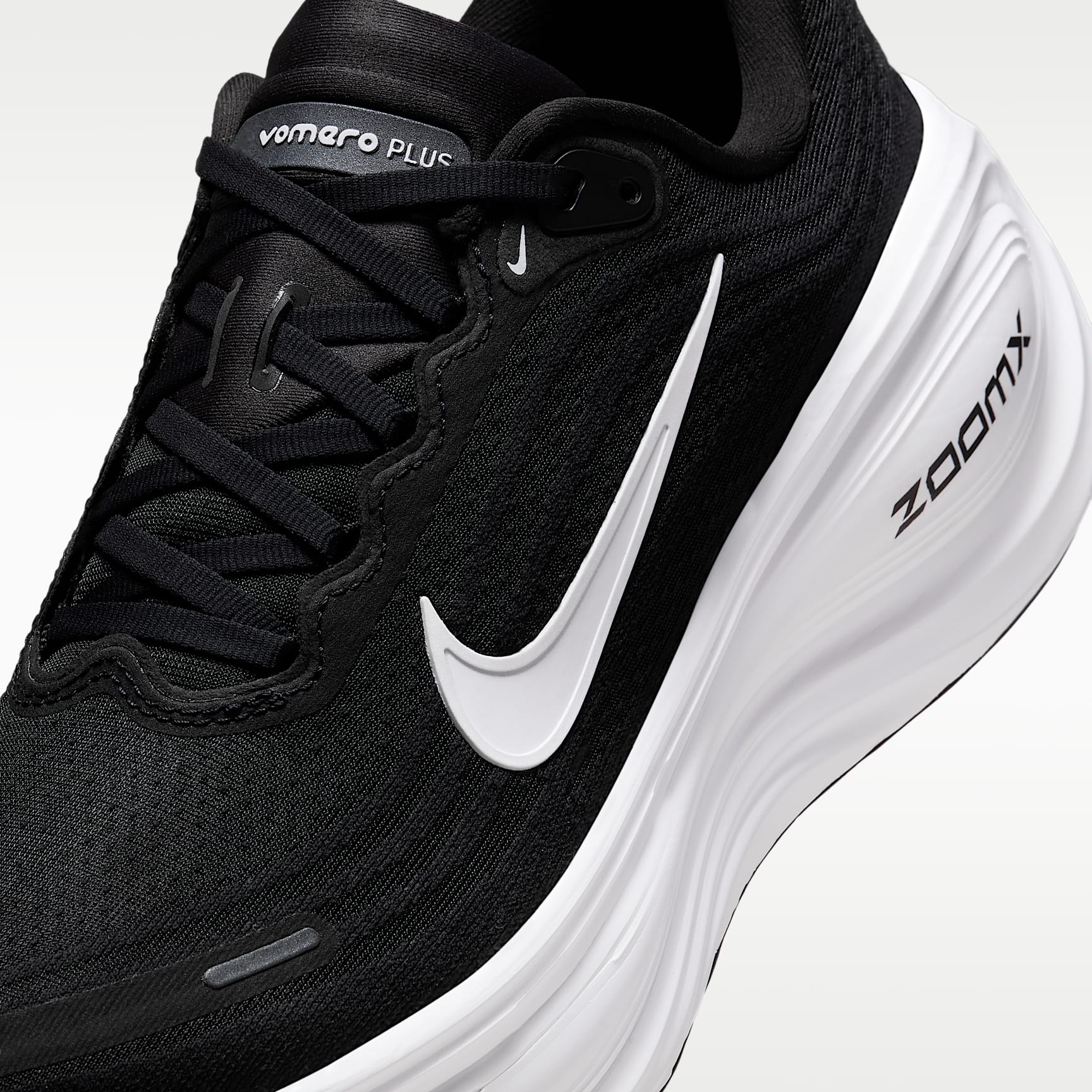 A tall stack of responsive, light foam offers next-level cushioning. Take maximum cushioning to the next level with the Vomero Plus. It provides an ultra-comfortable ride for everyday runs thanks to a mountainous stack of full-length ZoomX foam, the most responsive foam in the industry. Plus, the engineered mesh upper is made from soft, breathable yarn for a comfortable fit. ZoomX foam midsole The ultra-responsive ZoomX foam midsole delivers Nike's highest energy return. Soft upper An engineered mesh upper provides soft breathability. Durable Traction The high-abrasion rubber outsole offers durable traction. Product Details * Weight: 292g approx. (men's size 9) * Heel-to-toe drop: 10mm * Webbed lace loops for an adjustable fit * Reflective design details * Not intended for use as personal protective equipment (PPE)