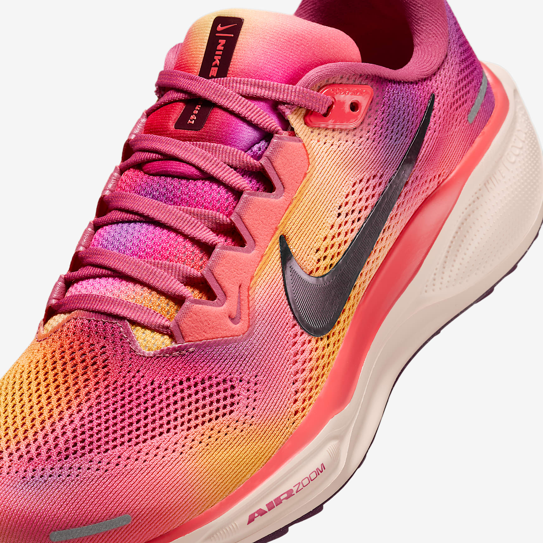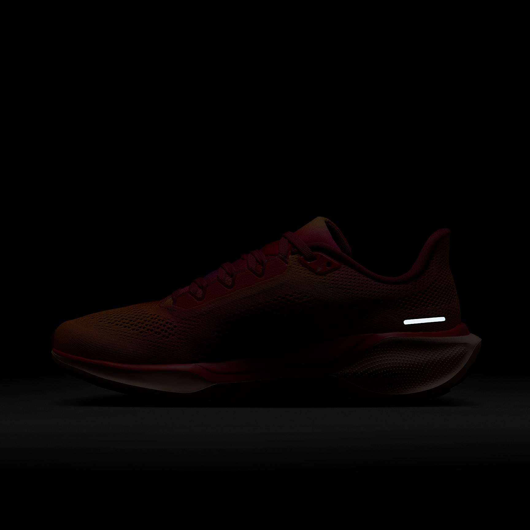 Springy foam plus snappy Air Zoom units equals our most energised ride. Responsive cushioning in the Pegasus provides an energised ride for everyday road running. Experience lighter-weight energy return with dual Air Zoom units and a ReactX foam midsole. Plus, improved engineered mesh on the upper decreases weight and increases breathability. Responsive Ride ReactX foam midsole surrounds forefoot and heel Air Zoom units for an energised ride. It's 13% more responsive than previous React technology. Waffle-inspired traction The signature Waffle-inspired rubber outsole provides traction and flexibility. Plush padding A plush collar, tongue and sockliner provide a secure and comfortable fit. What's new? * A ReactX foam midsole * A lighter, more breathable engineered mesh upper Product details * Weight: 251g approx. (women's size 5.5) * Heel-to-toe drop: 10mm * MR-10 last—our best, most consistent fit (same as Pegasus 40) * Reflective design details * Not intended for use as personal protective equipment (PPE)