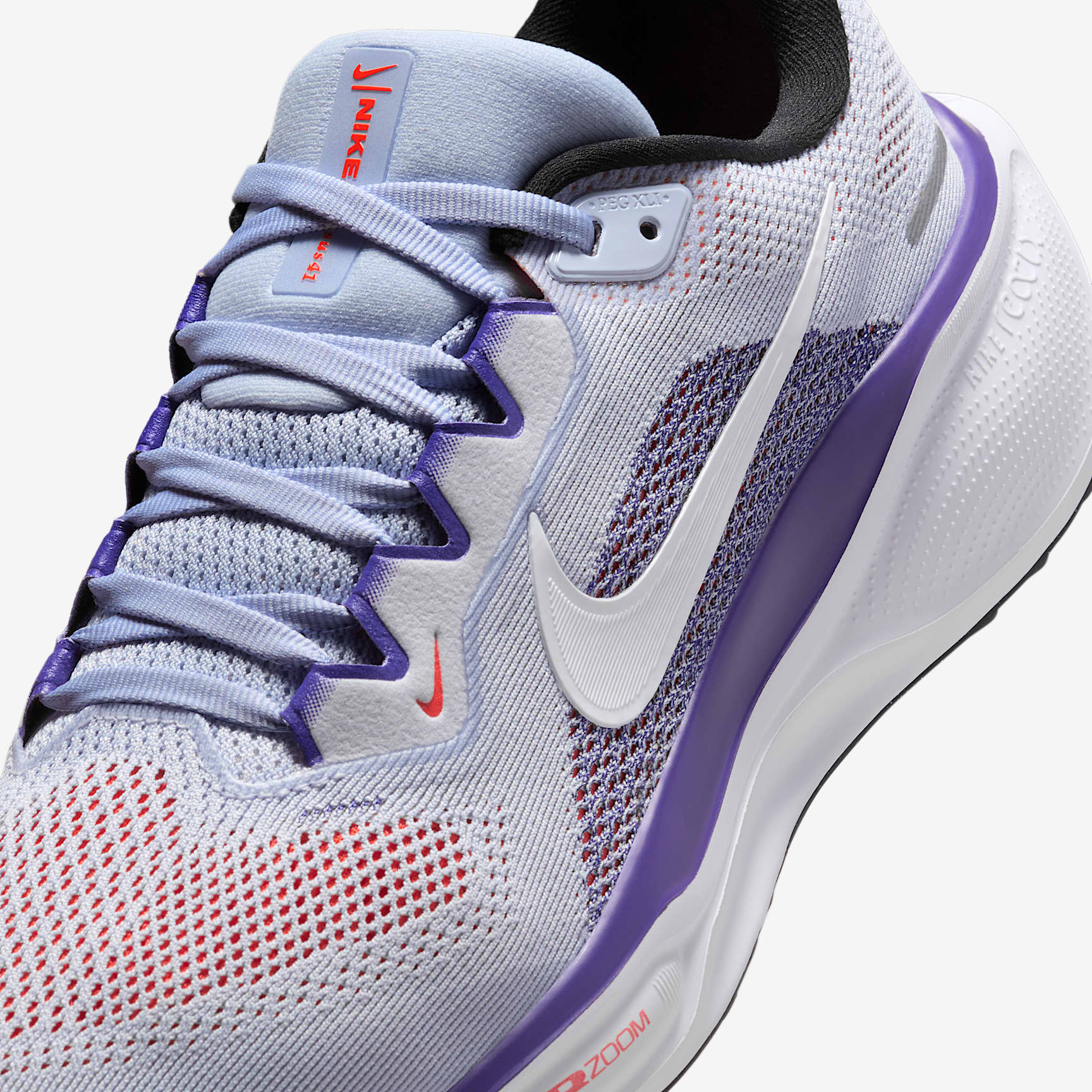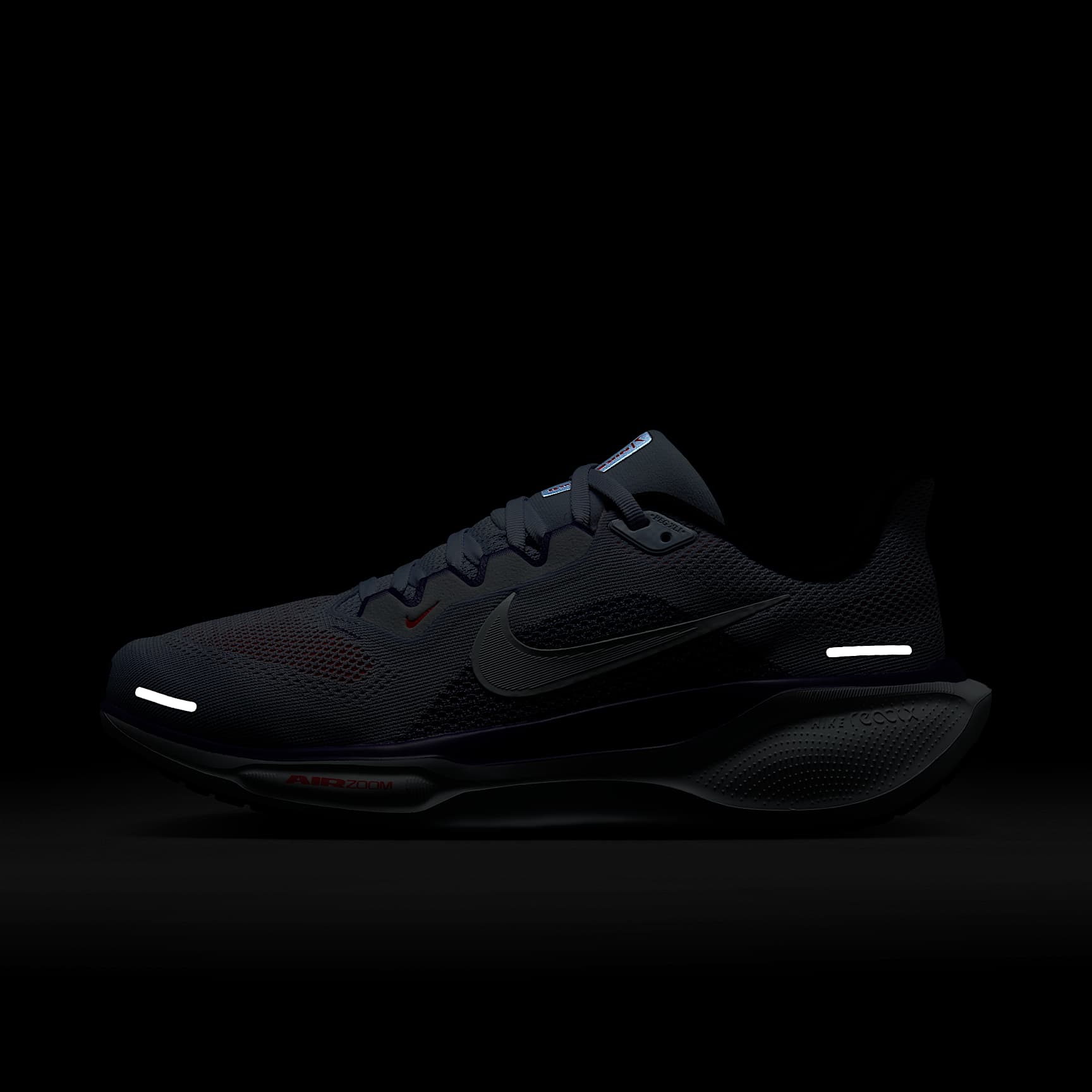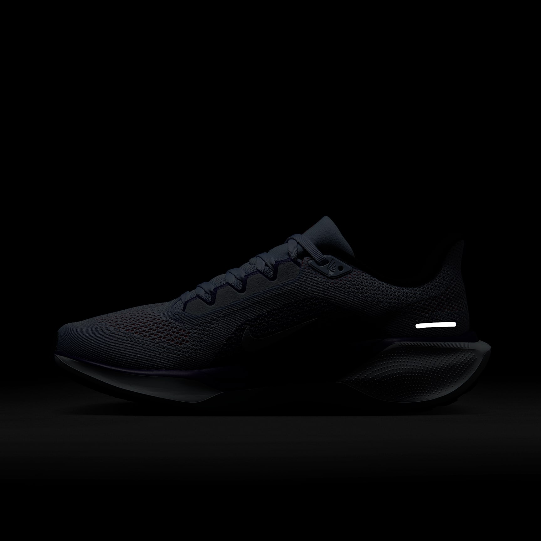 Springy foam plus snappy Air Zoom units equals our most energised ride. Responsive cushioning in the Pegasus provides an energised ride for everyday road running. Experience lighter-weight energy return with dual Air Zoom units and a ReactX foam midsole. Plus, improved engineered mesh on the upper decreases weight and increases breathability. Responsive Ride ReactX foam midsole surrounds forefoot and heel Air Zoom units for an energised ride. It's 13% more responsive than previous React technology. Waffle-inspired traction The signature Waffle-inspired rubber outsole provides traction and flexibility. Plush padding A plush collar, tongue and sockliner provide a secure and comfortable fit. What's new? * A ReactX foam midsole * A lighter, more breathable engineered mesh upper Product details * Weight: approx. 251g (women's size 5.5) * Heel-to-toe drop: 10mm * MR-10 last—our best, most consistent fit (same as Pegasus 40) * Reflective design details * Not intended for use as personal protective equipment (PPE)