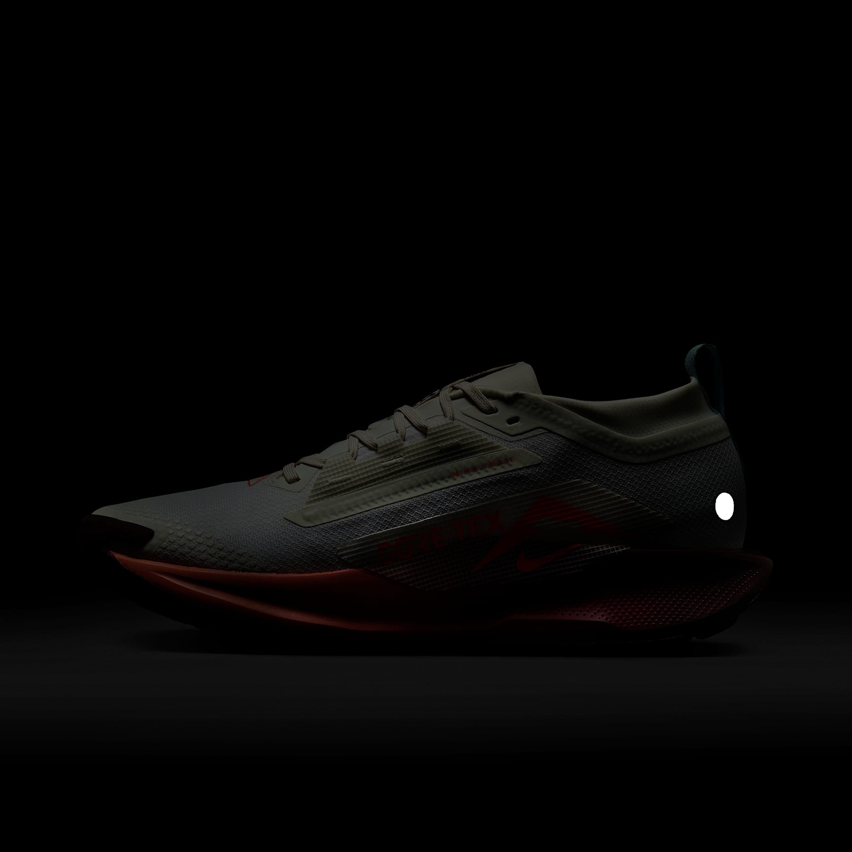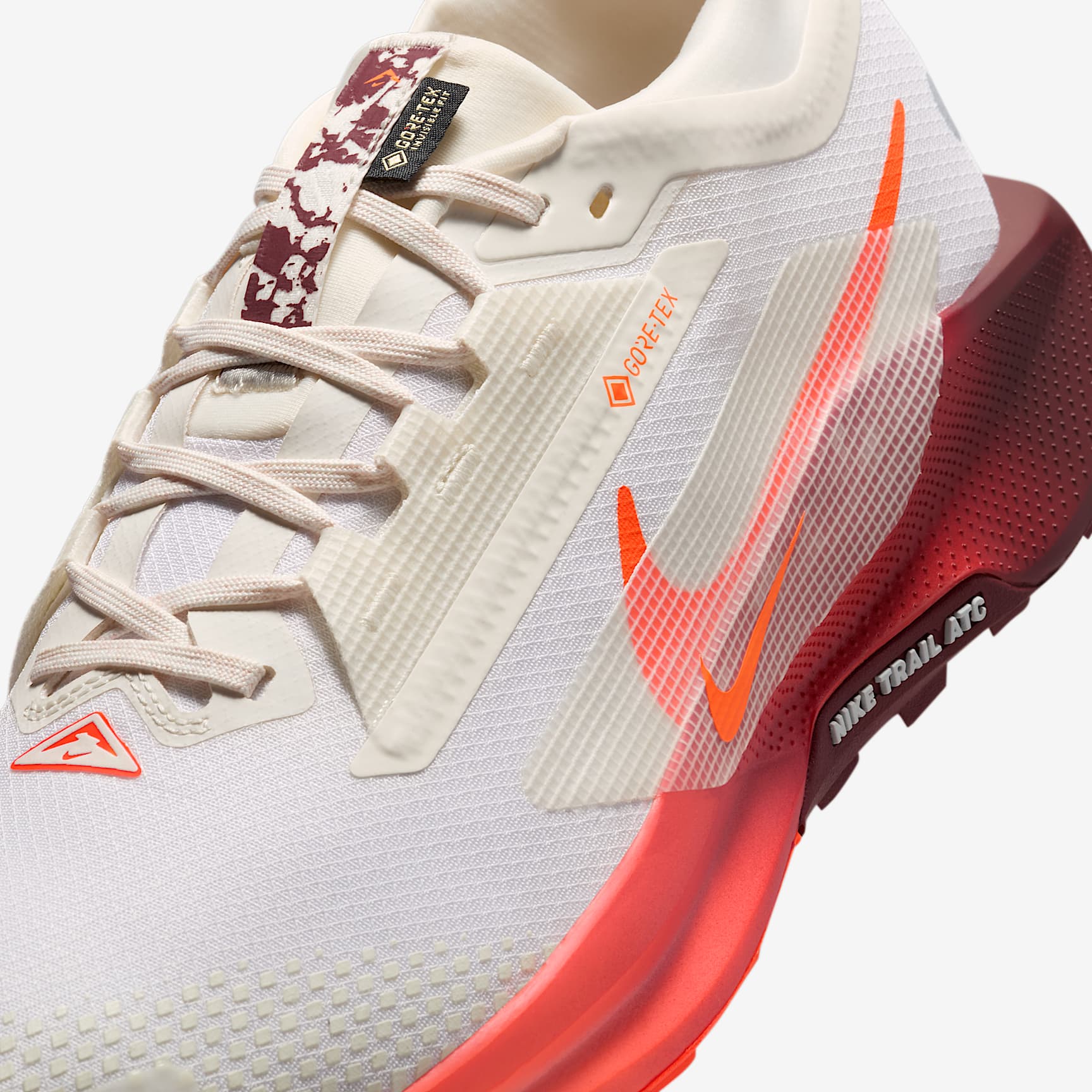 GORE-TEX tech and a grippy outsole provide wet-weather protection. The Pegasus Trail 5 provides wet-weather protection for trail running. A waterproof GORE-TEX upper, an all-terrain outsole and reflective details help you comfortably take on the elements. With a ReactX foam midsole, it gives you responsive cushioning for an energized ride. GORE-TEX Upper A waterproof GORE-TEX upper and 3-D print toe cap help keep water out so your feet stay dry. Responsive Ride Springy ReactX foam midsole gives you lightweight energy return. It's 13% more responsive than previous React technology. ATC Outsole Nike Trail All Terrain Compound (ATC) rubber outsole provides enhanced grip on steep inclines and in wet weather while giving you a smooth ride on the road. What's New? * ReactX foam midsole * Nike Trail ATC outsole Product Details * Weight: Approx. 300g/10.6oz (Men's US 10) * Heel-to-toe drop: 9.5mm * Reflective details at sides of heel * Not intended for use as Personal Protective Equipment (PPE)