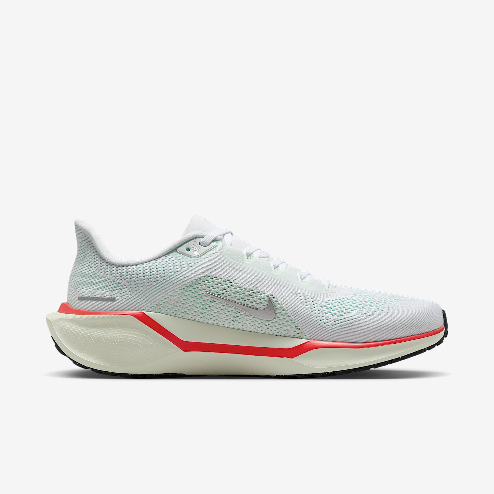 Springy foam plus snappy Air Zoom units equals our most energised ride. Responsive cushioning in the Pegasus provides an energised ride for everyday road running. Experience lighter-weight energy return with dual Air Zoom units and a ReactX foam midsole. Plus, improved engineered mesh on the upper decreases weight and increases breathability. Responsive Ride ReactX foam midsole surrounds forefoot and heel Air Zoom units for an energised ride. It's 13% more responsive than previous React technology. Waffle-inspired traction The signature Waffle-inspired rubber outsole provides traction and flexibility. Plush padding A plush collar, tongue and sockliner provide a secure and comfortable fit. What's new? * A ReactX foam midsole * A lighter, more breathable engineered mesh upper Product details * Weight: approx. 297g (men's size 9) * Heel-to-toe drop: 10mm * MR-10 last—our best, most consistent fit (same as Pegasus 40) * Reflective design details * Not intended for use as personal protective equipment (PPE)