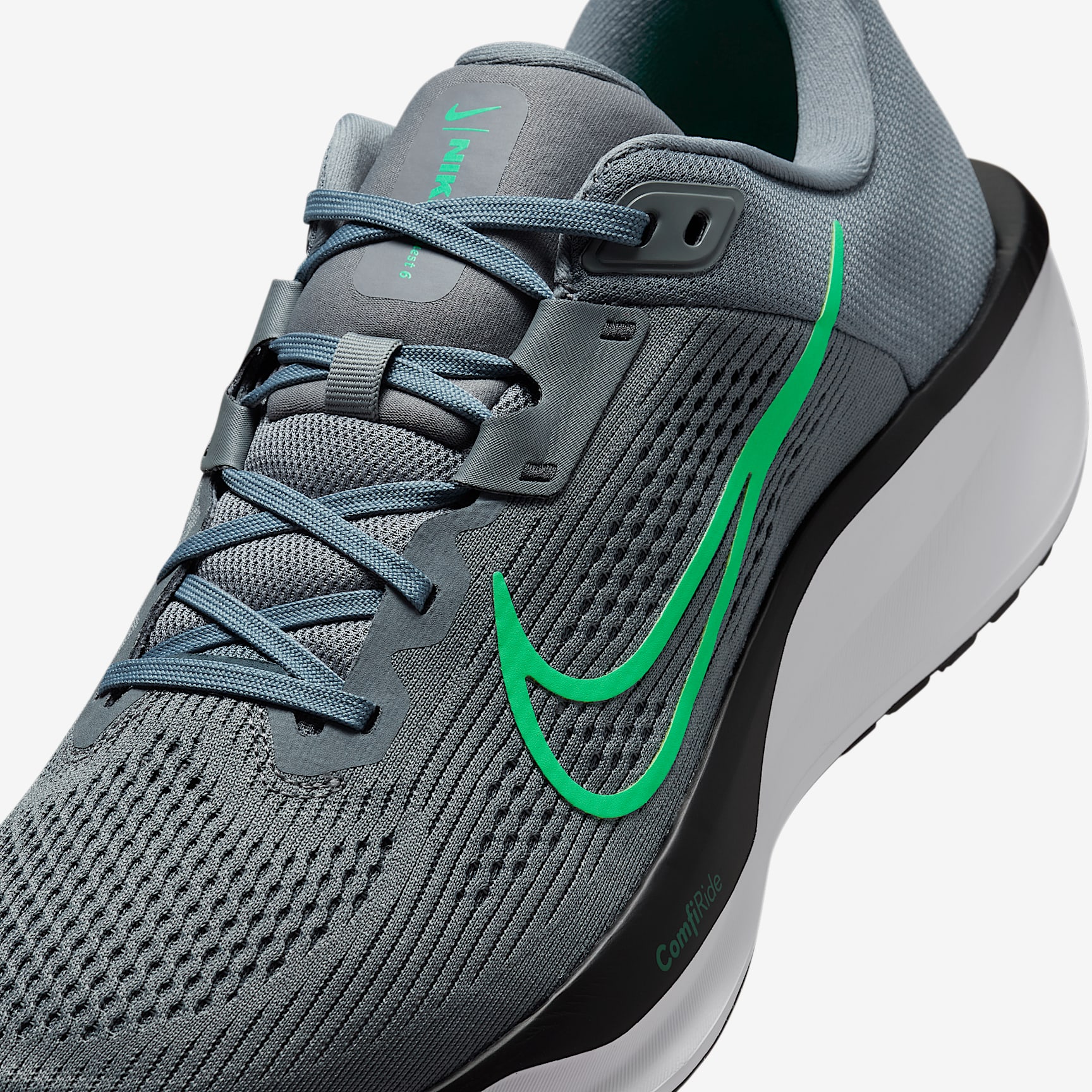A high foam stack and secure fit for your everyday miles. The Nike Quest 6 is for runners of all levels. But make no mistake, it's anything but entry-level. A supercomfortable and supportive midfoot fit band helps keep you stable for your miles. Plus, a supersoft midsole foam helps cushion each step. Secure Fit Midfoot fit band helps keep your foot more secure the tighter your laces are. Softer, More Responsive Increased midsole height means a softer and more responsive ride compared to the Quest 5. Grippy Traction Rubber outsole has the traction to help keep your feet gripped to the pavement. Product Details * Weight: Approx. 295g/10.4oz (Men's US 10) * Heel-to-toe drop: 10mm